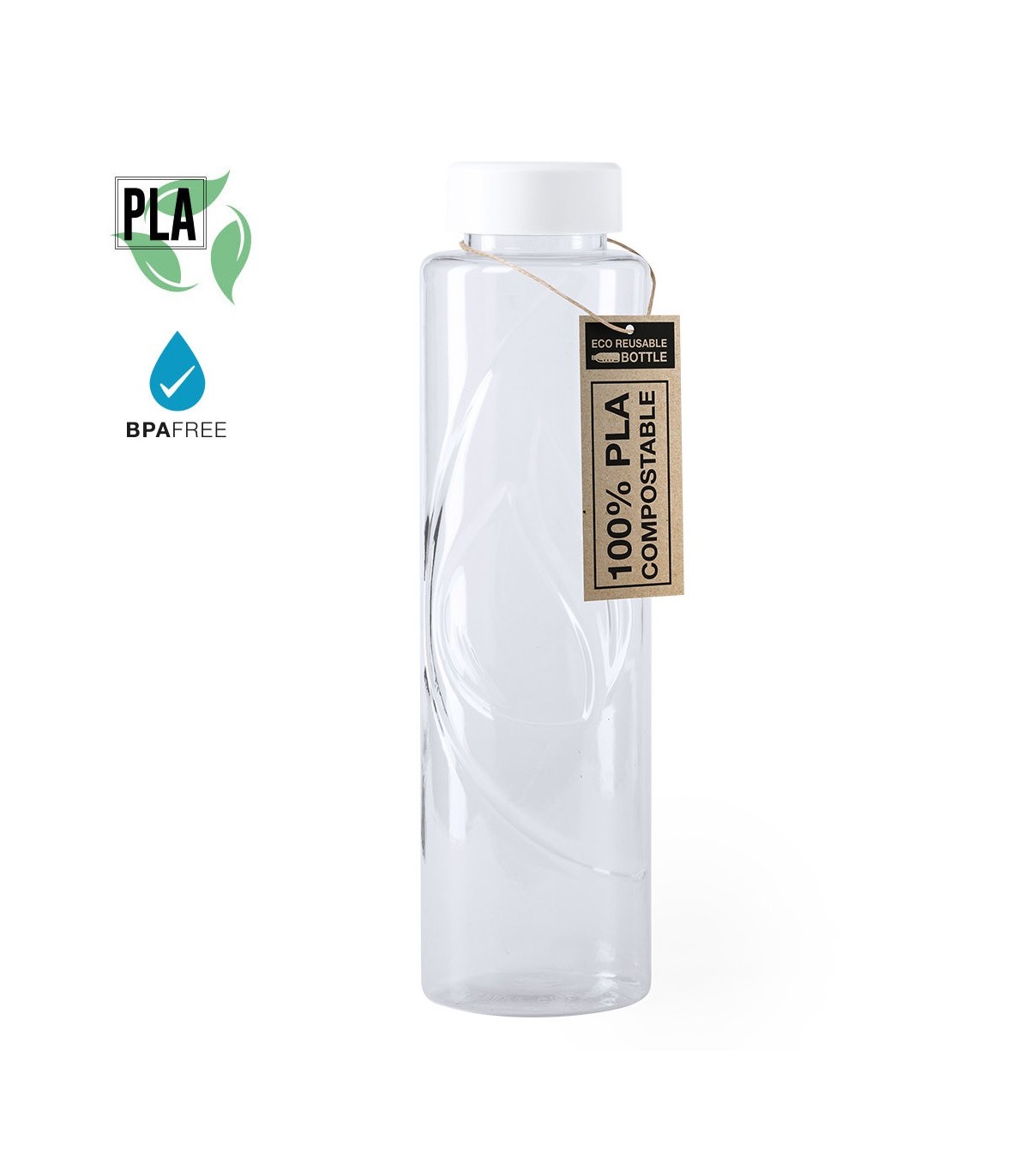 Bidón de fabricación ecológica de 830 ml de capacidad. Fabricado en resistente material PLA -Ácido PoliLáctico-, que se obtiene a partir de recursos 100% naturales como el almidón de maíz, la yuca o la caña de azúcar, pudiendo convertirse en 100% compostable al final de su ciclo de vida útil. Con distintivo PLA y presentado en bolsa individual de diseño eco.