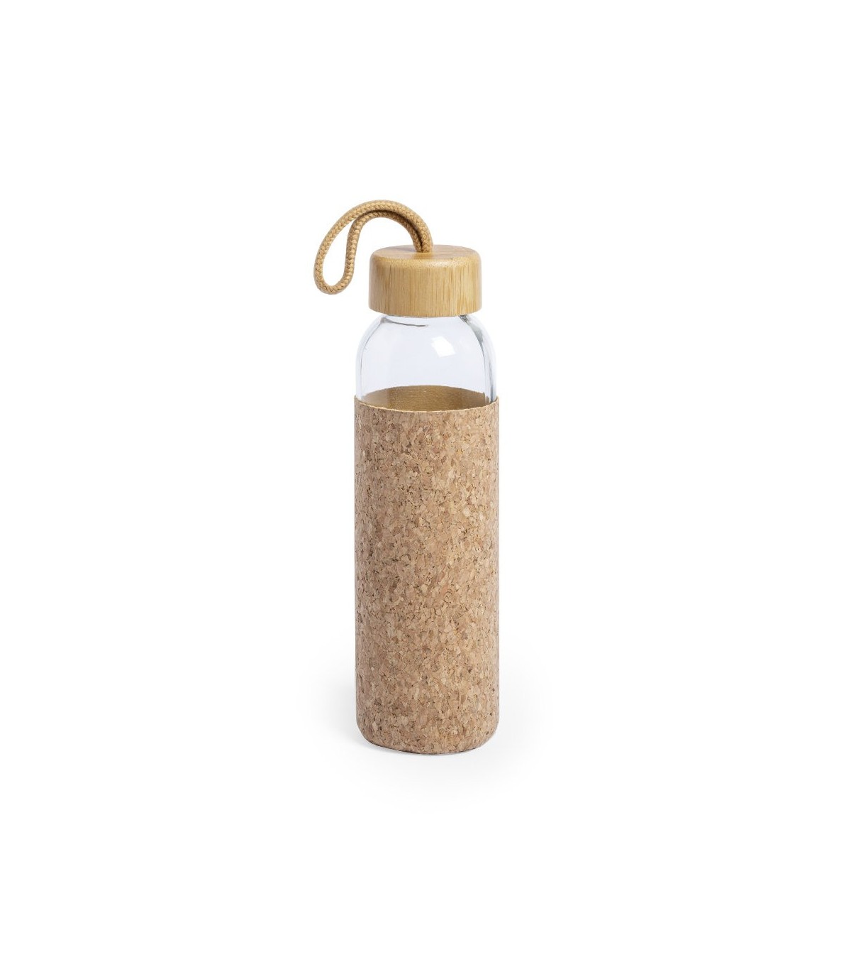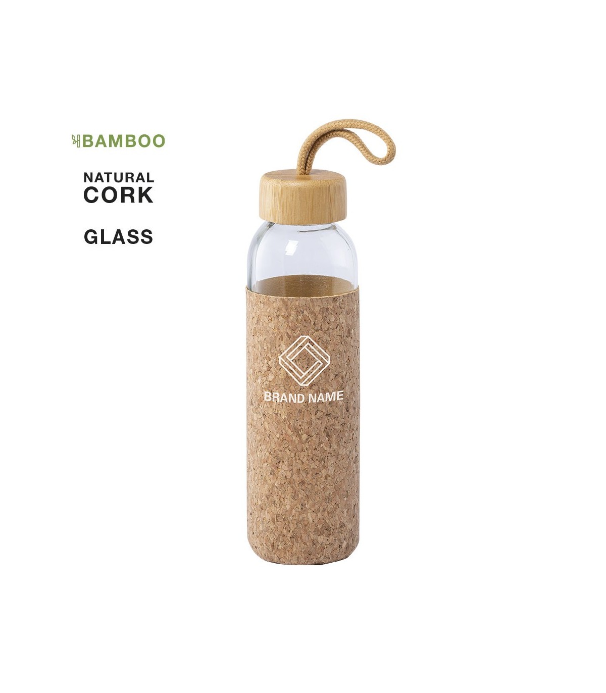 Bidones promocionales hechos en cristal y tapón a rosca de bambú, con práctica asa de transporte trenzada en color natural. Incluye funda de corcho natural.