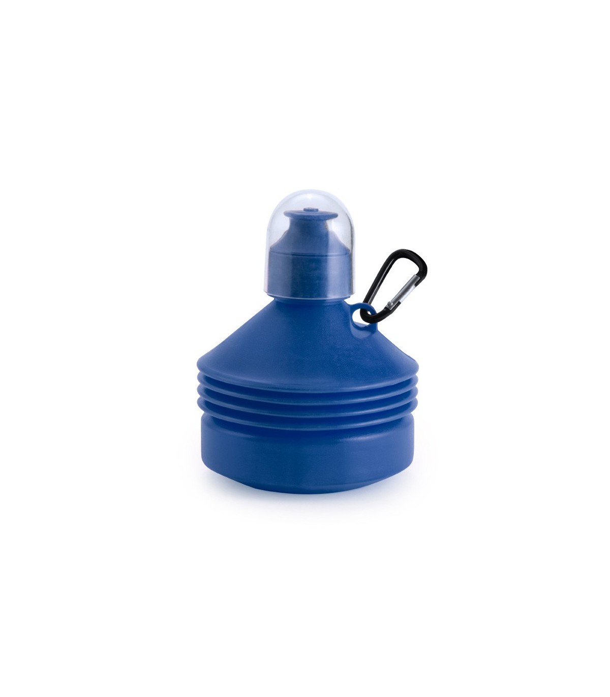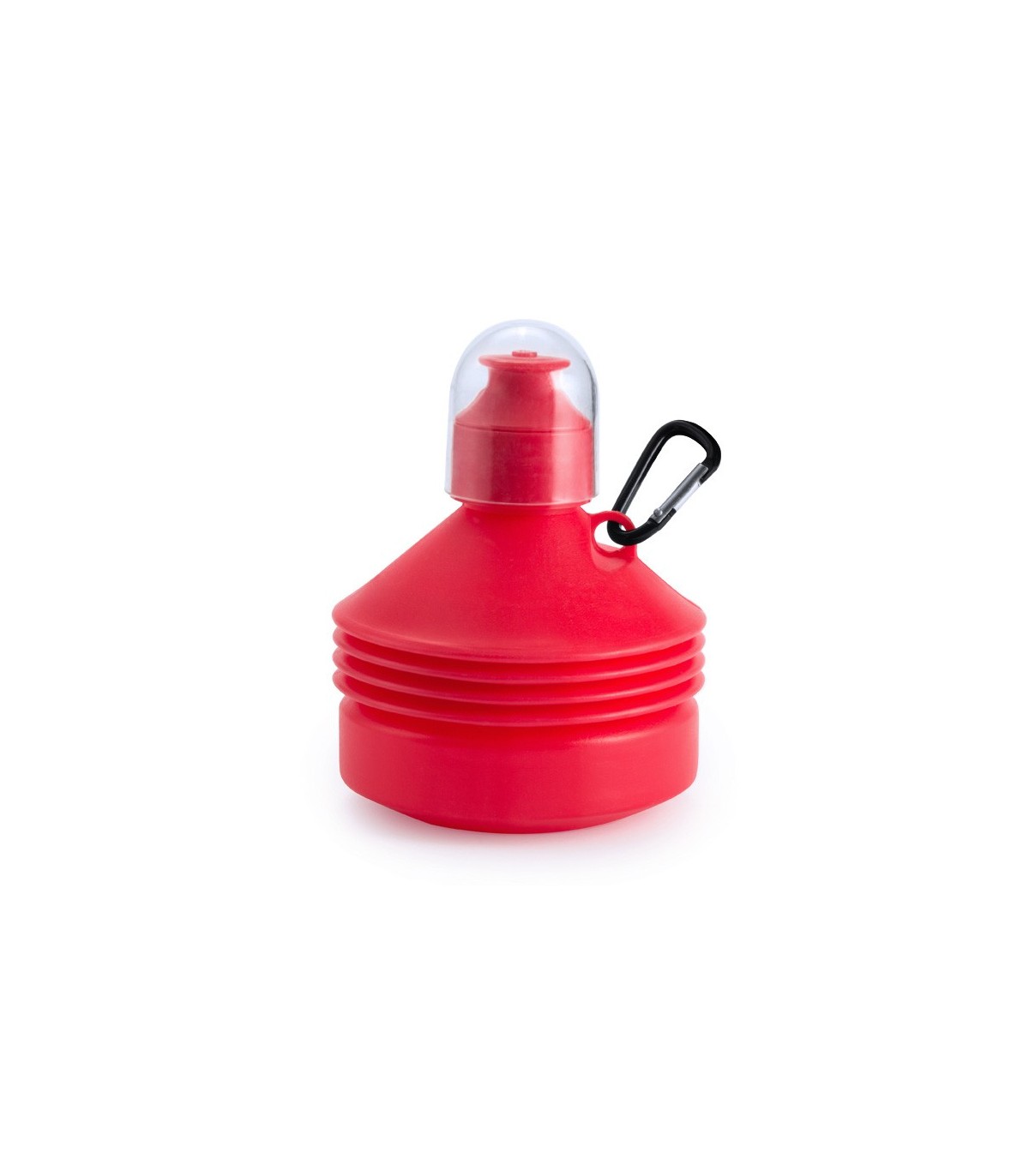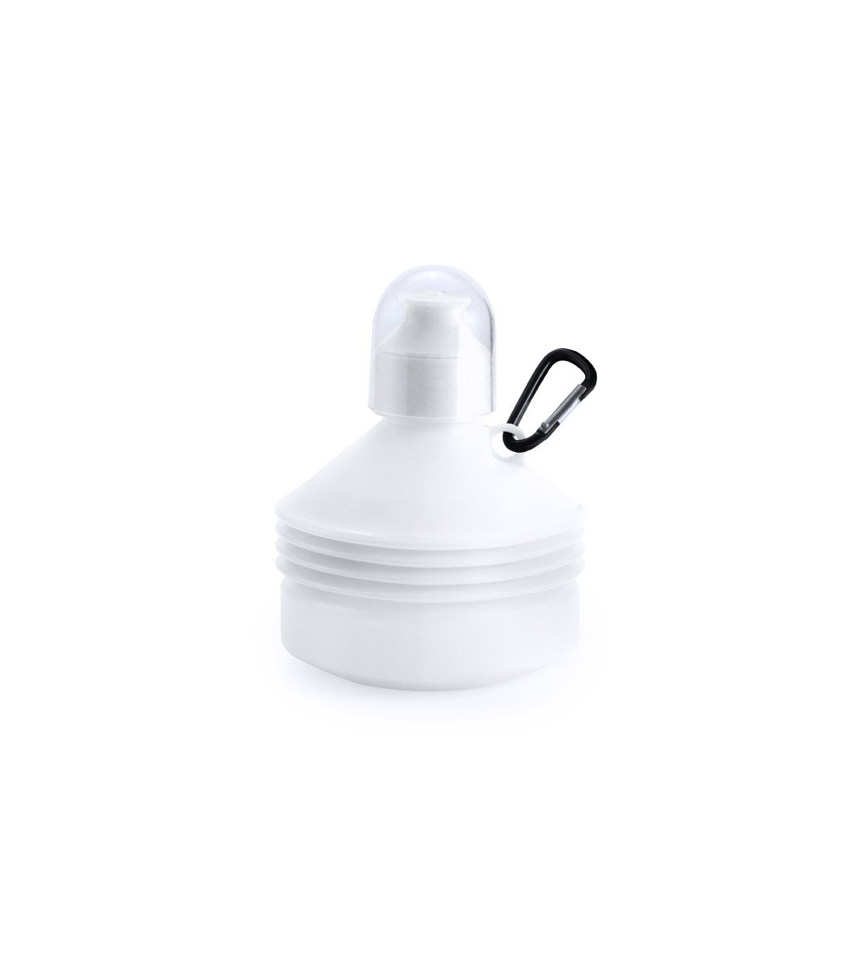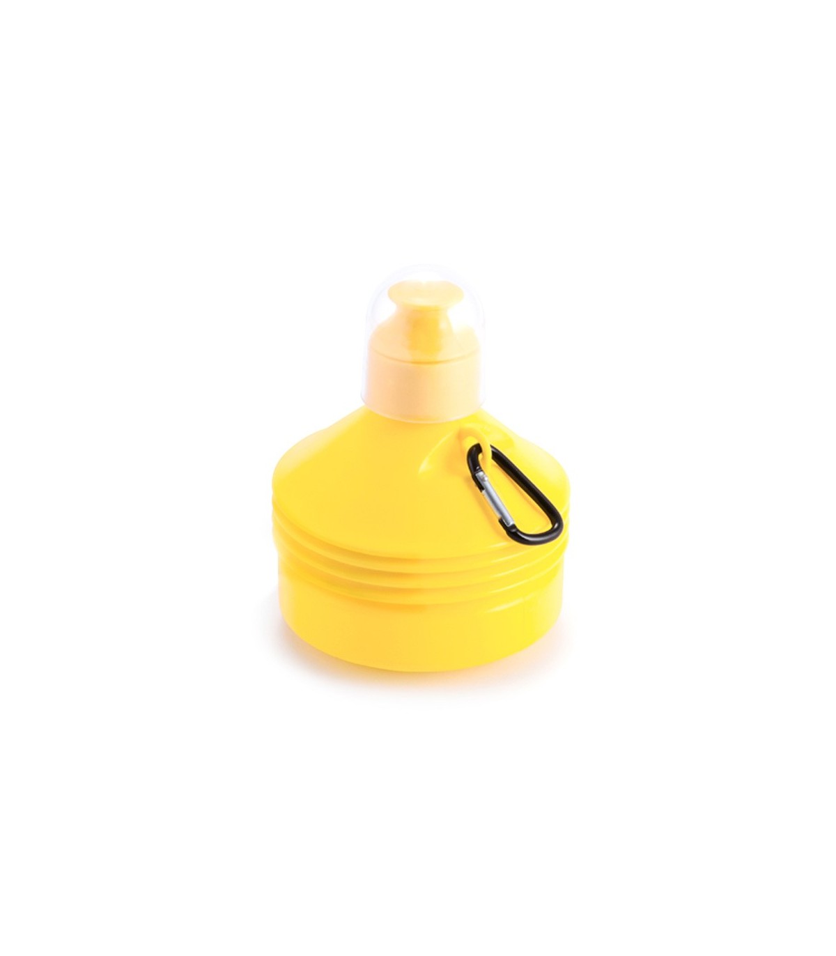 Bidón plegable de 570ml de capacidad con cuerpo ergonómico acabado en PE de originales y llamativos colores. Dosificador de seguridad con capucha de cierre y mosquetón metálico de transporte.