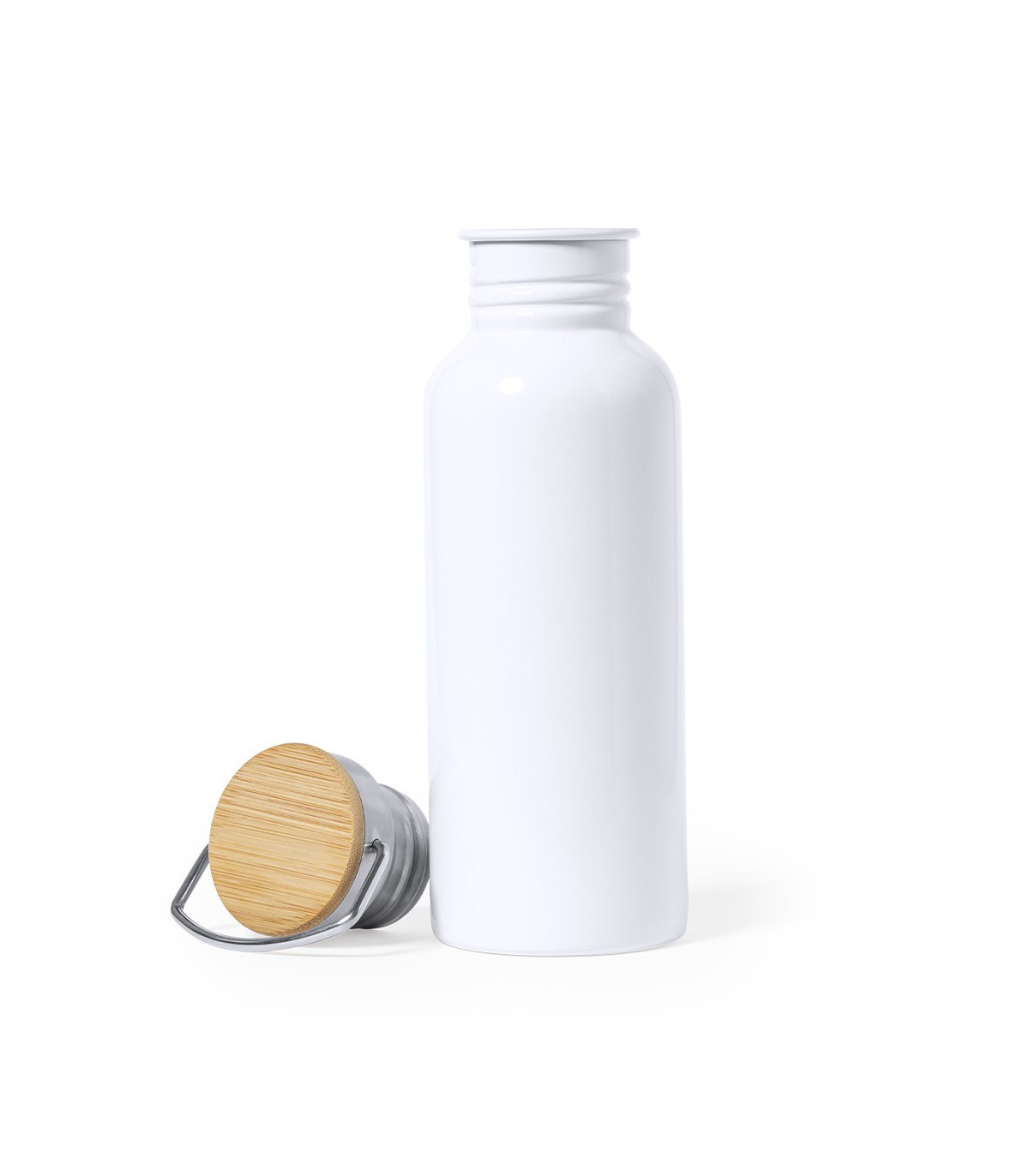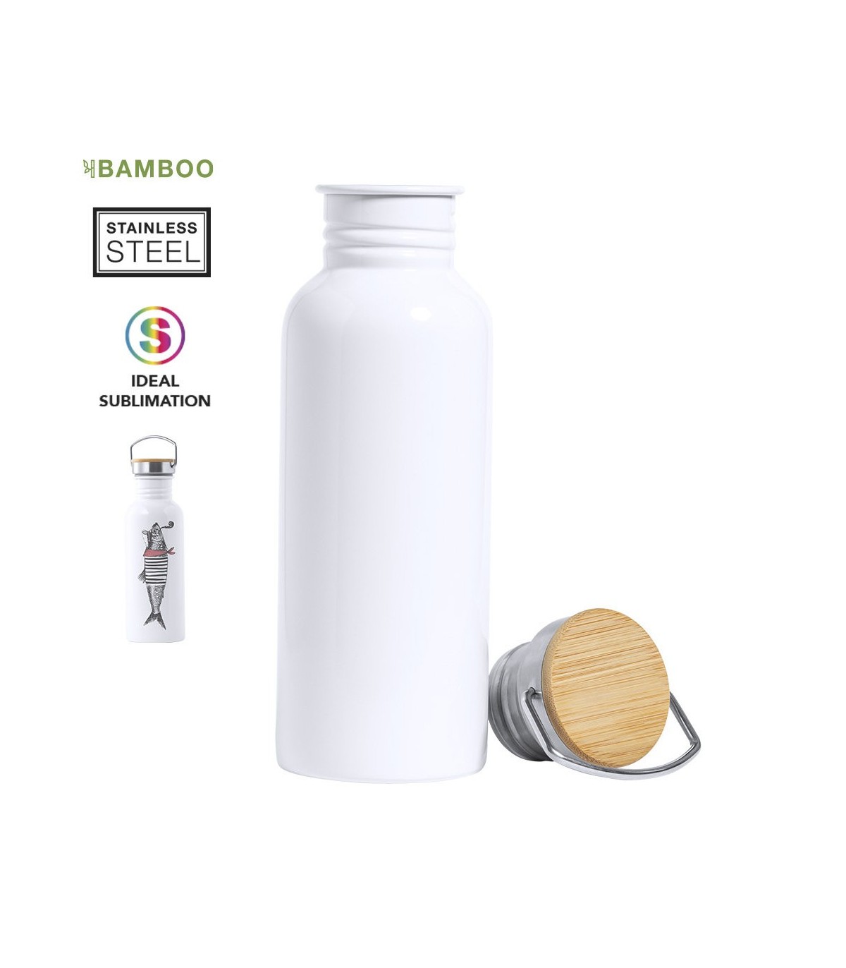 Bidones en acero inox especialmente diseñado para marcaje en sublimación. De estilo retro y 750ml de capacidad. Tapón de seguridad a rosca en acero inox, con detalle en bambú y asa de transporte vintage. Embalado en original caja de diseño.