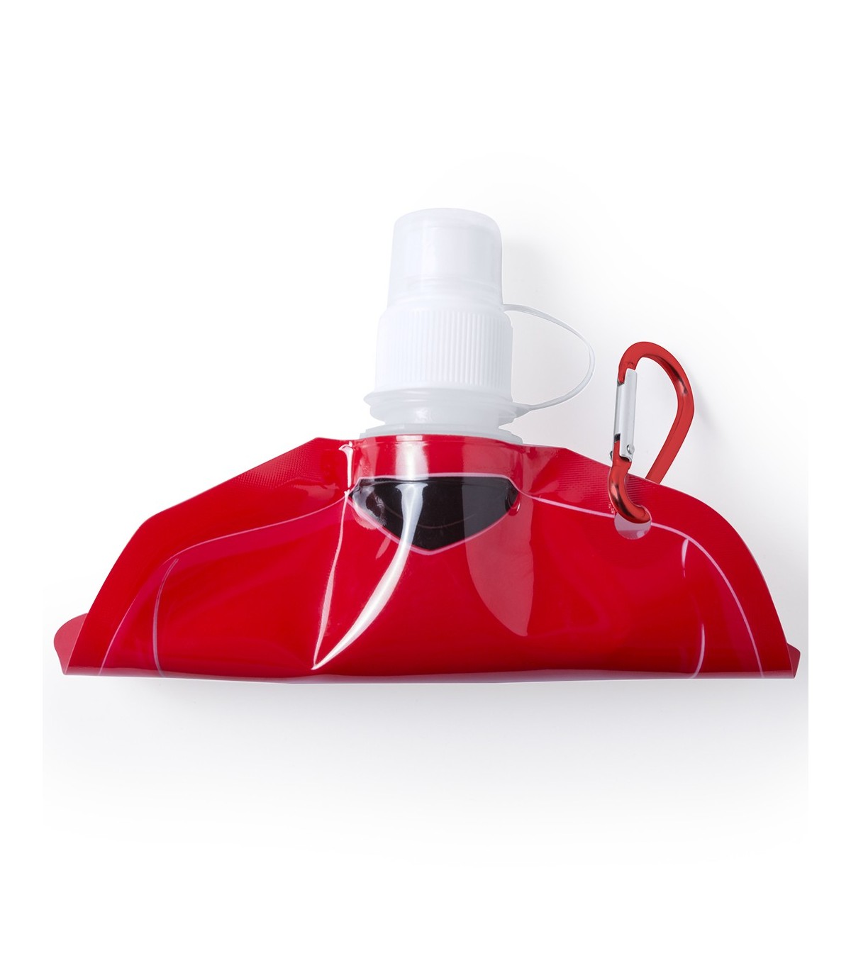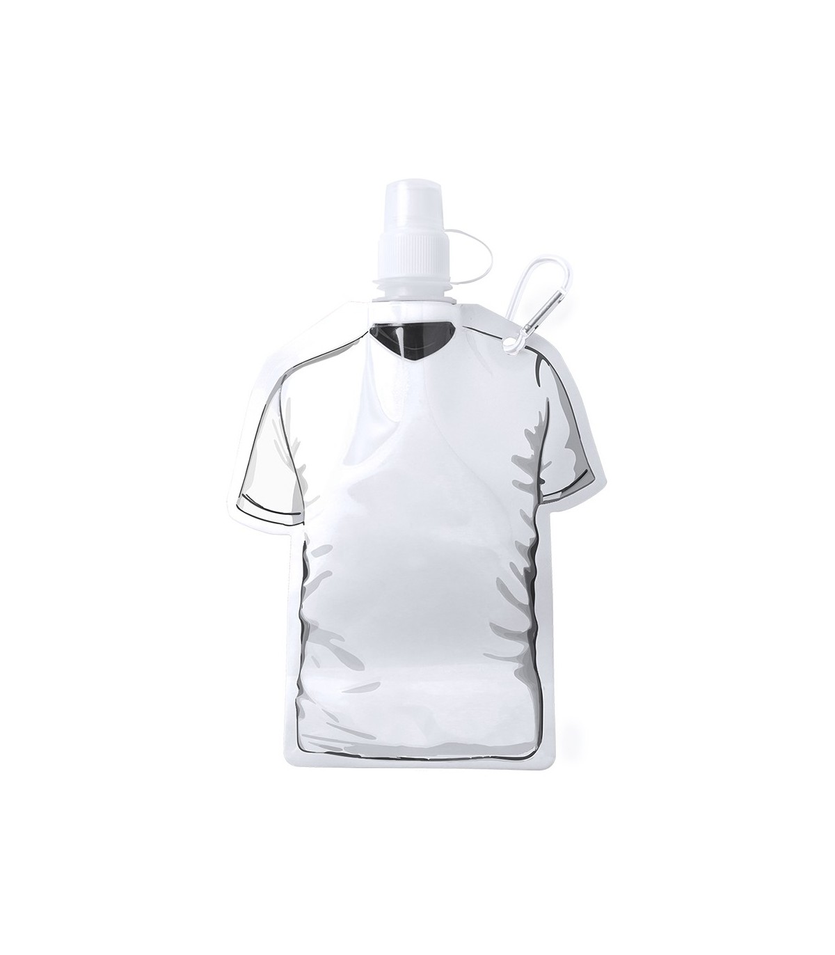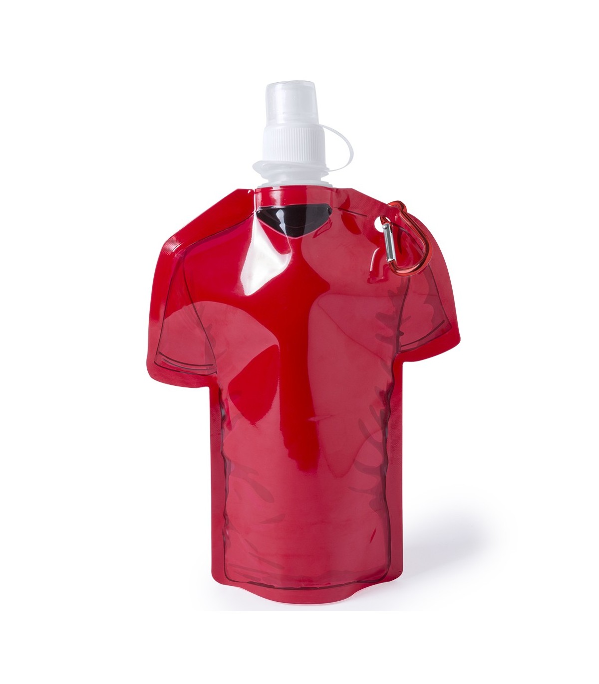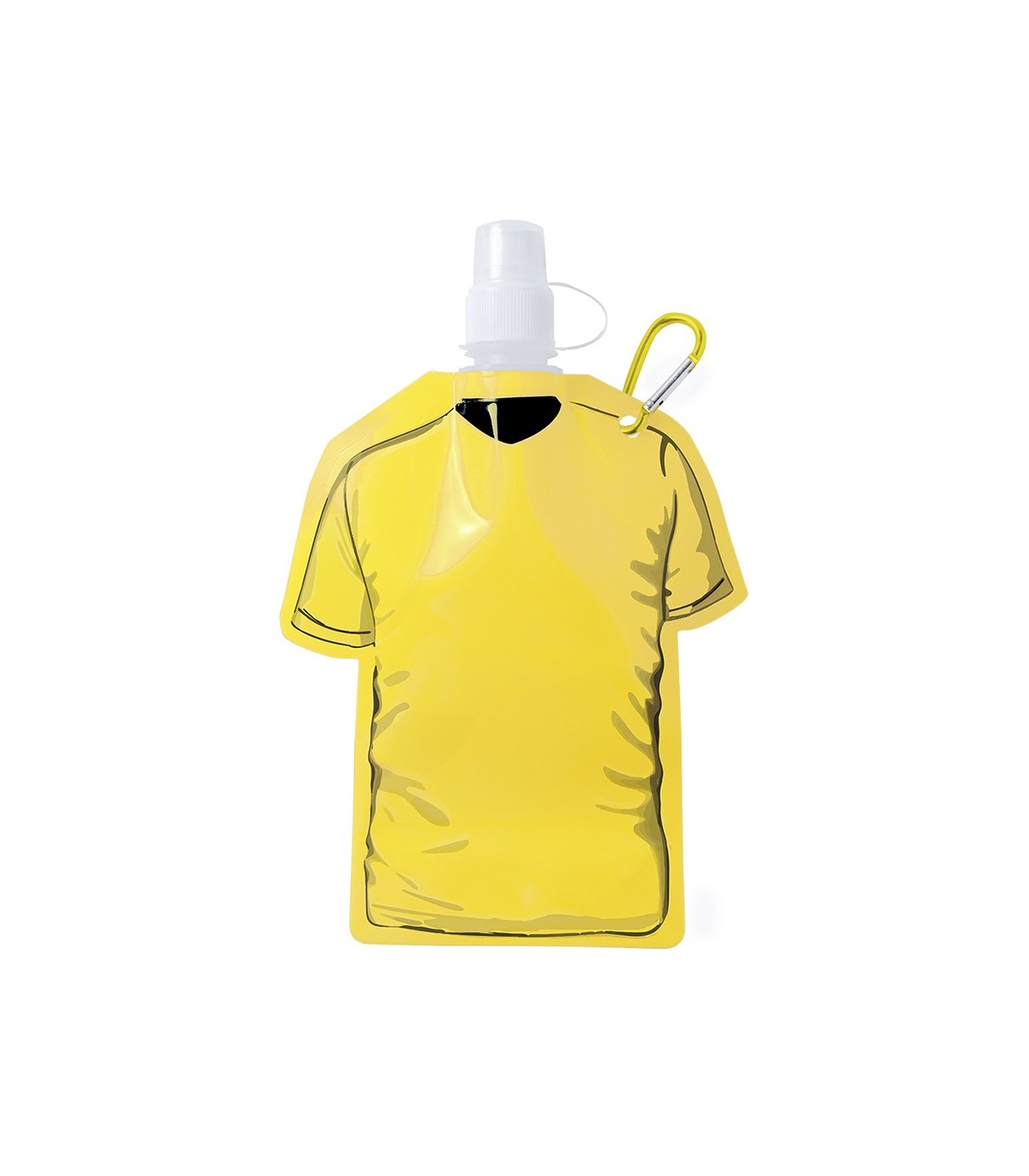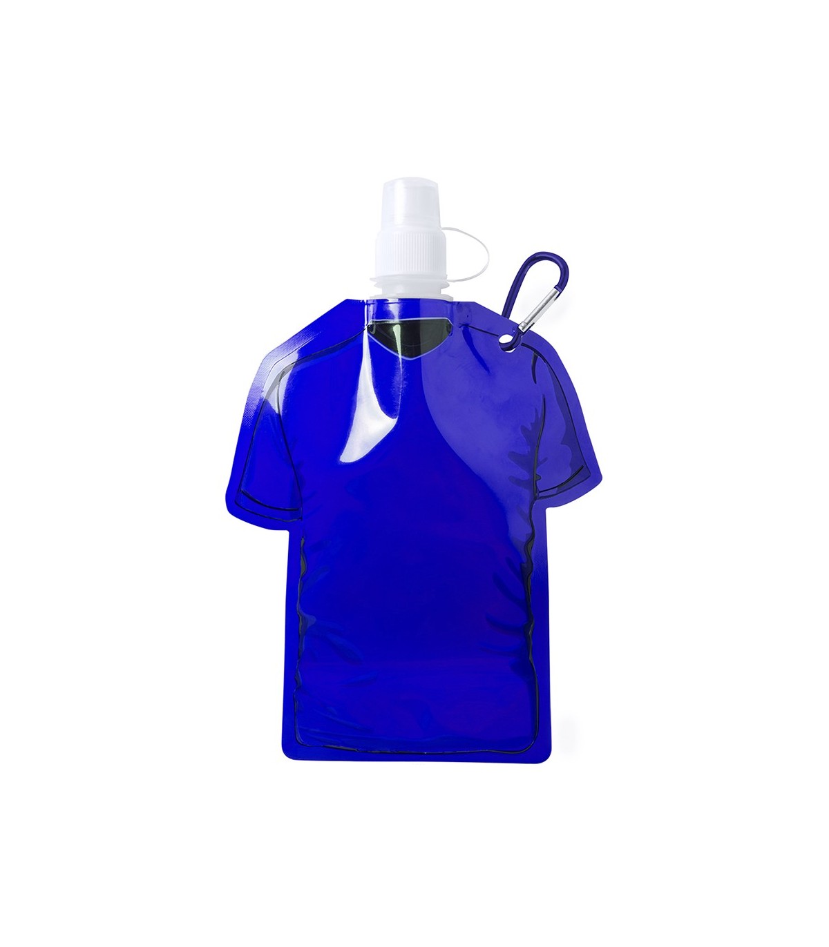 Bidón camiseta de 470ml de capacidad con cuerpo flexible de acabado en PET de variados y vivos colores. Con tapón de seguridad a rosca con capucha de cierre y mosquetón metálico de transporte a juego.