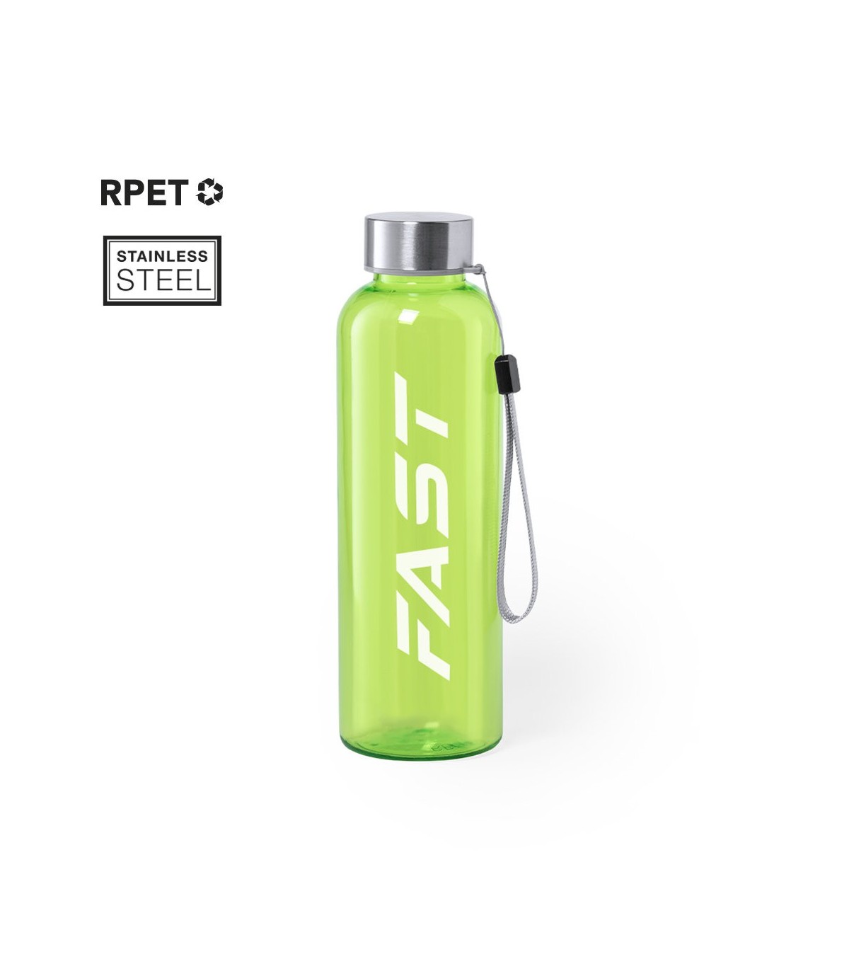 Bidón Libre de BPA, con cuerpo de RPET elaborado a partir de plástico reciclado. Tapón a rosca en acero inox, con cordón de transporte.