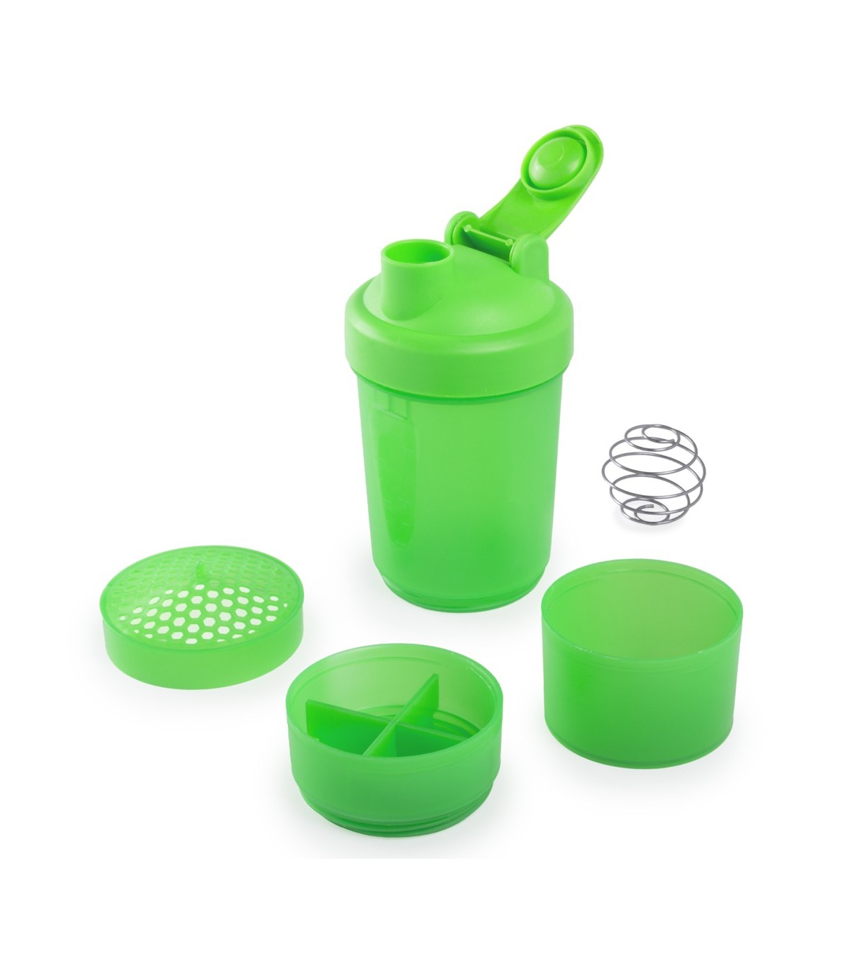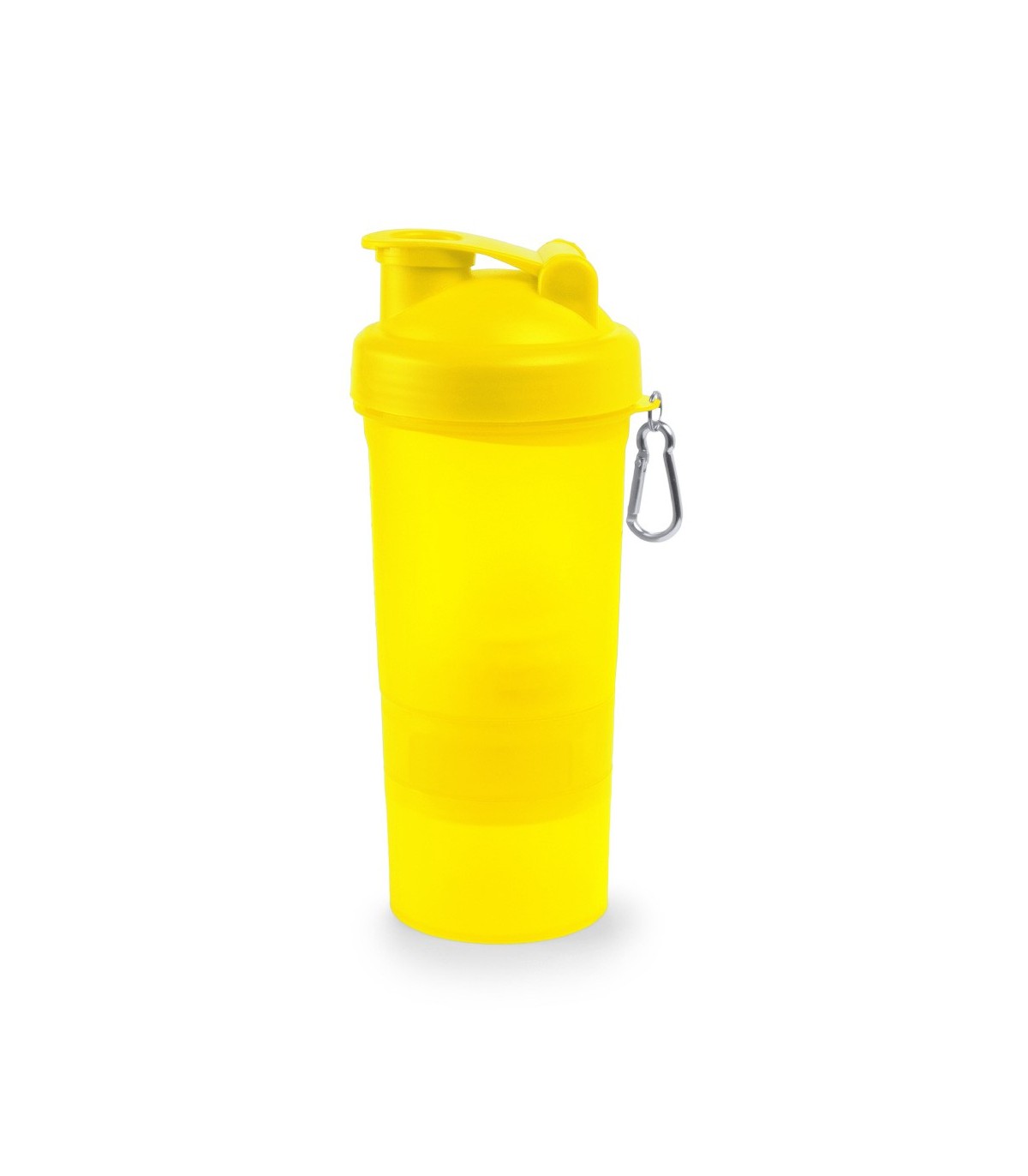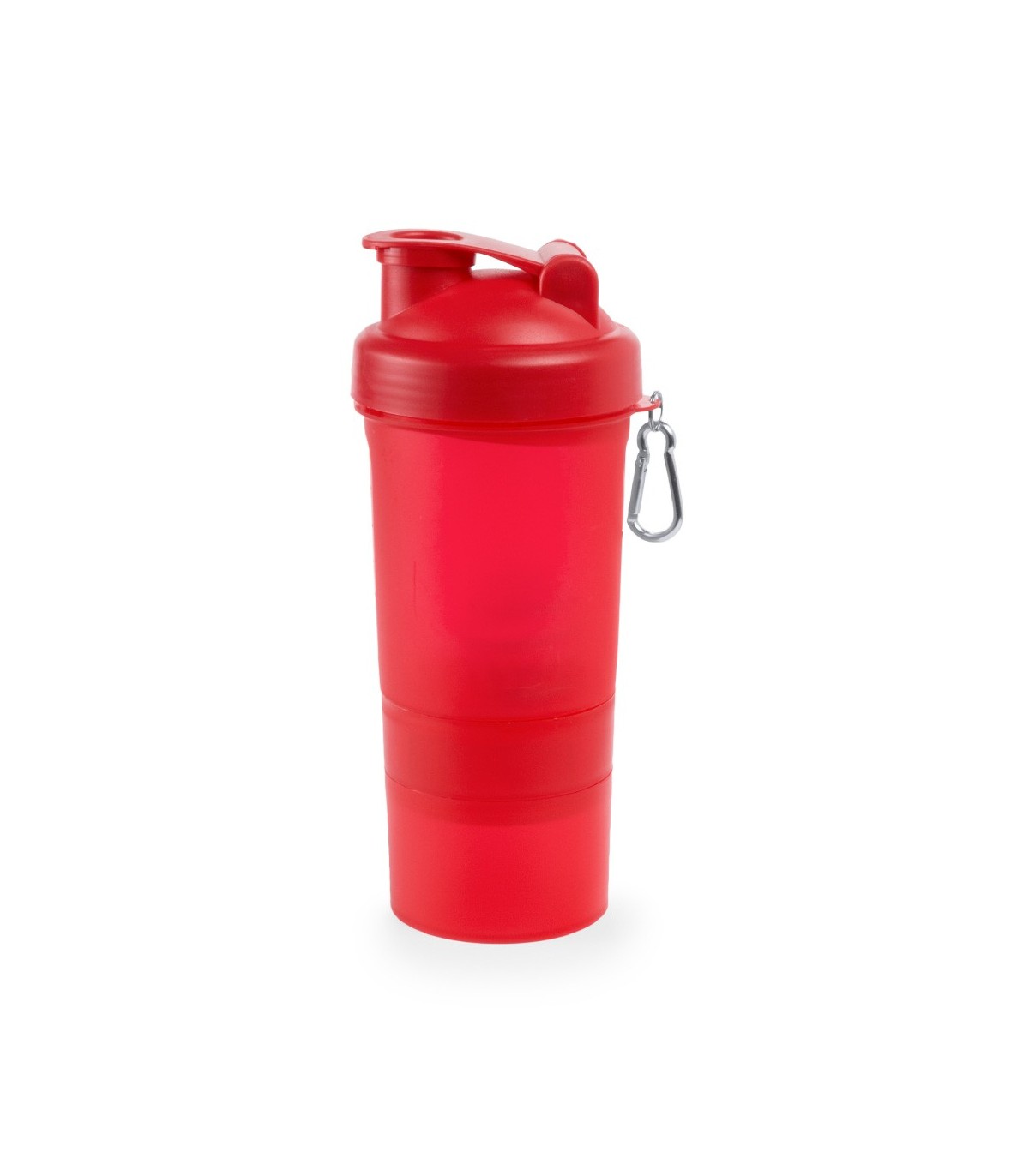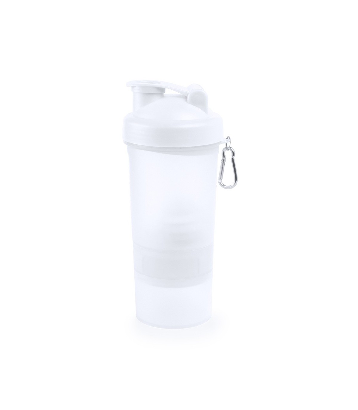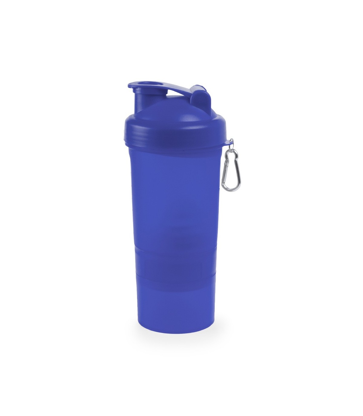 Bidón multi compartimento de 400ml de capacidad con cuerpo acabado en PP de vivos colores e ingenioso diseño. Con tapón a rosca y tapa con dosificador de seguridad. Mosquetón metálico de transporte.