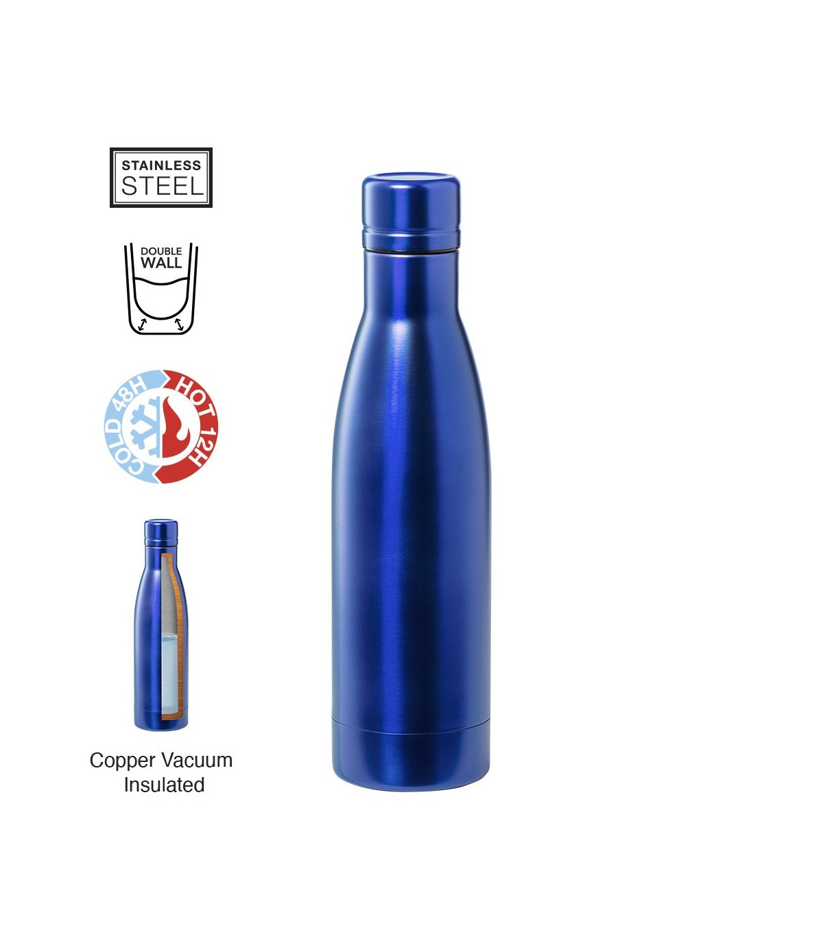 Bidón térmico de acero inox, con doble capa y aislamiento de cobre al vacío. El mismo le permite mantener el calor y el frio durante un tiempo más prolongado, llegando a las 12 y 48 horas respectivamente. De 500ml de capacidad, yDisponibles en varios colores para personalizar metalizados. presentado individualmente en caja de diseño.