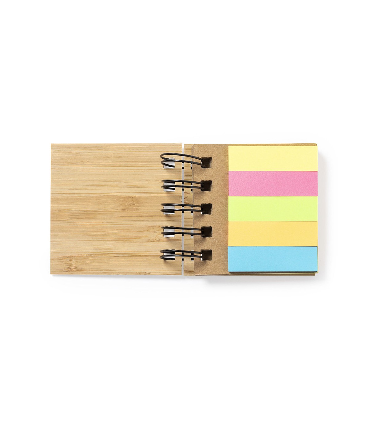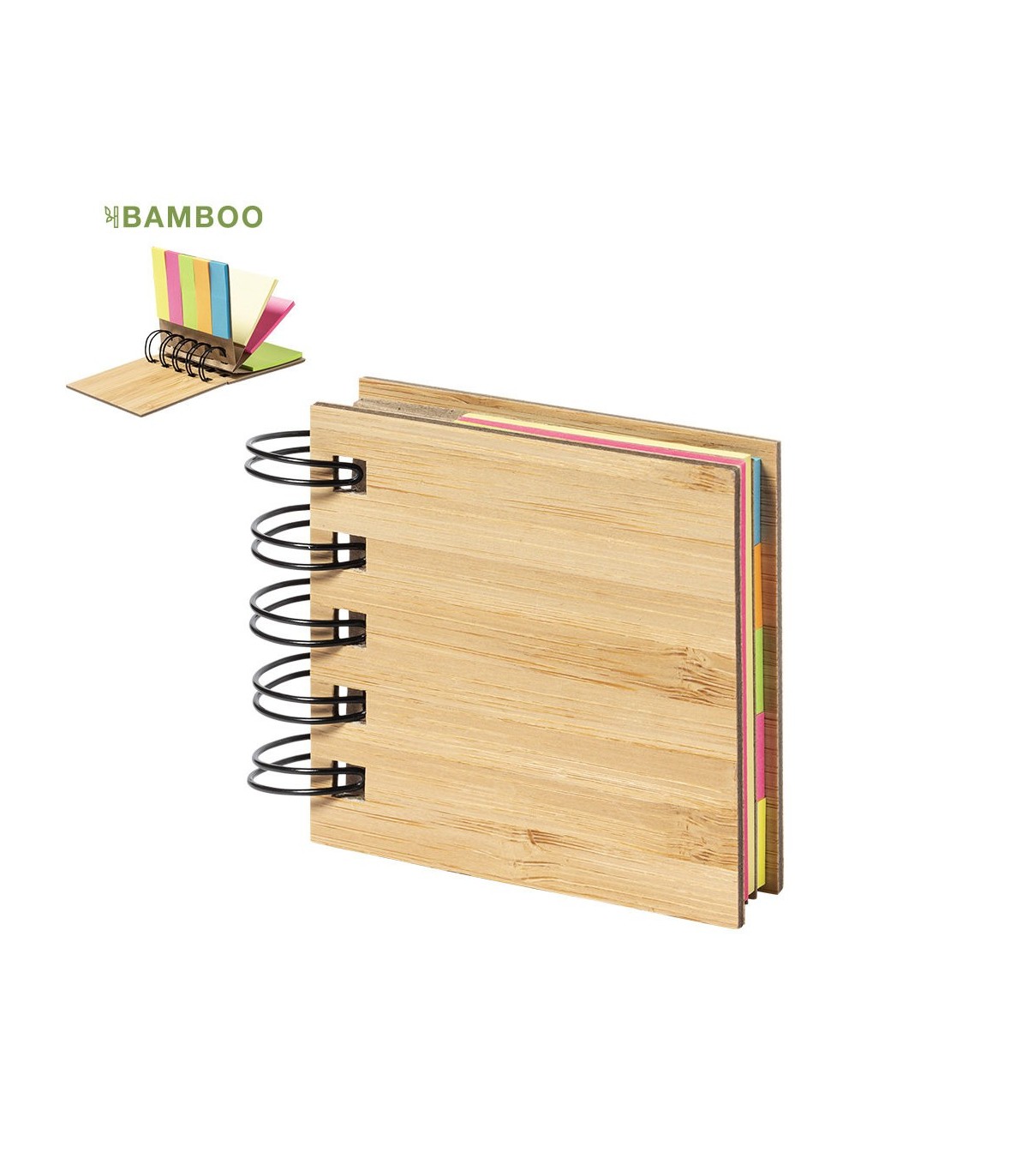 Bloc de notas de anillas ecológicas, con tapas rígidas de bambú. Con 75 notas adhesivas medianas y 125 mini notas adhesivas.