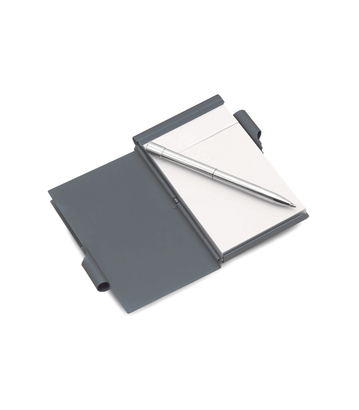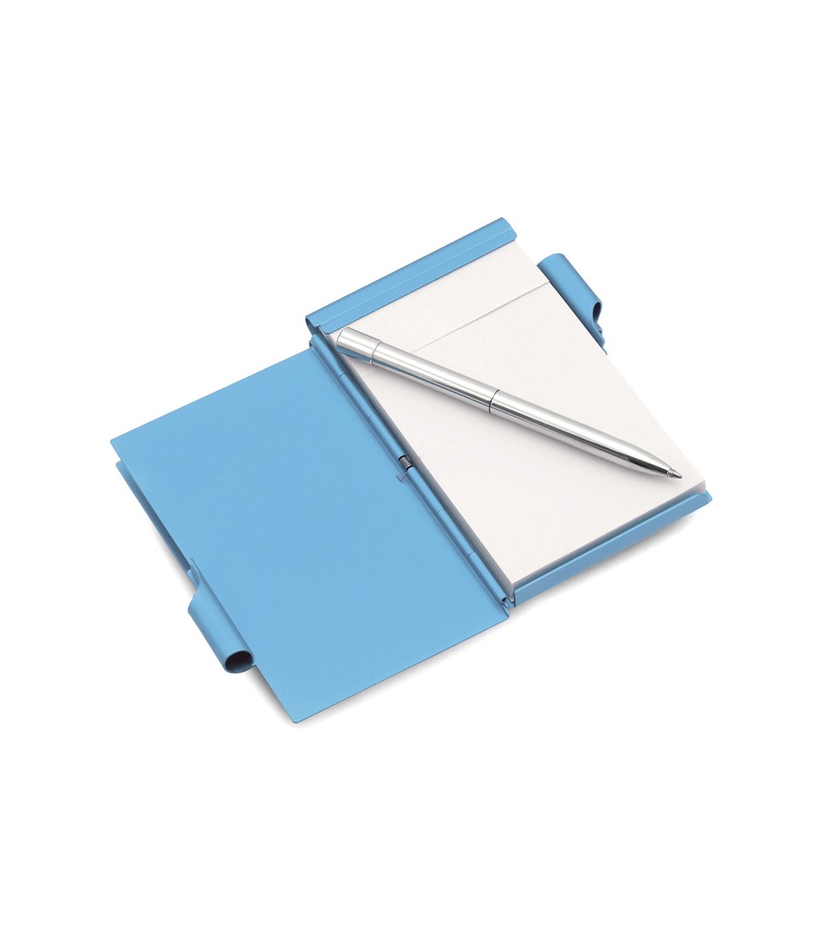 Bloc de notas en aluminio con bolígrafo incluido personalizados con logotipo en serigrafia para regalos de empresa promocionales.