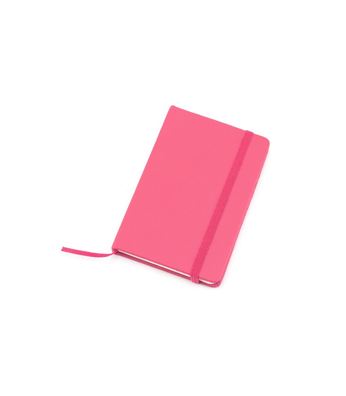 Bloc de notas con tapas de suave tacto, acabado en polipiel y en desenfadados colores. De 100 hojas lisas, con elástico de sujeción y marcapáginas de tela a juego.