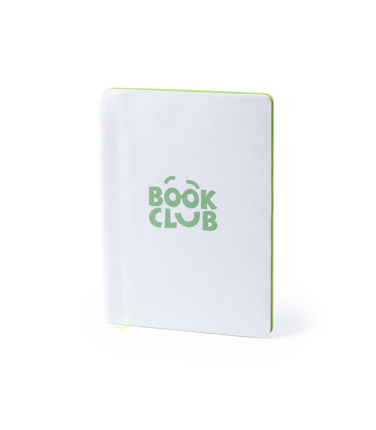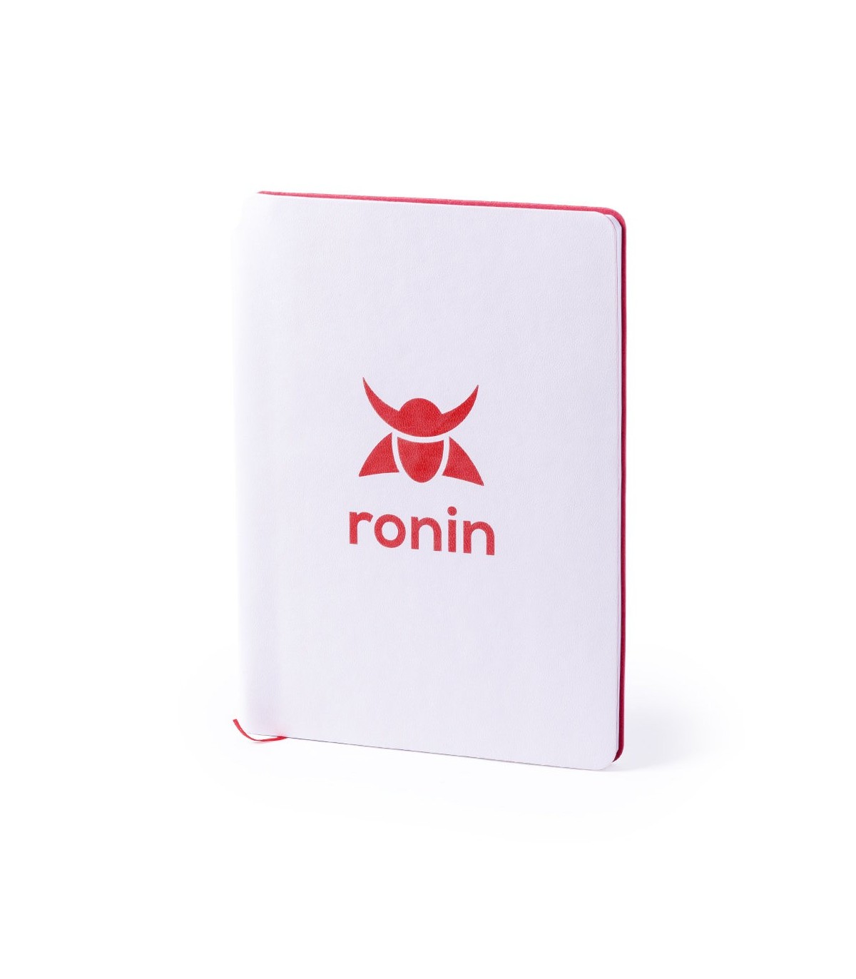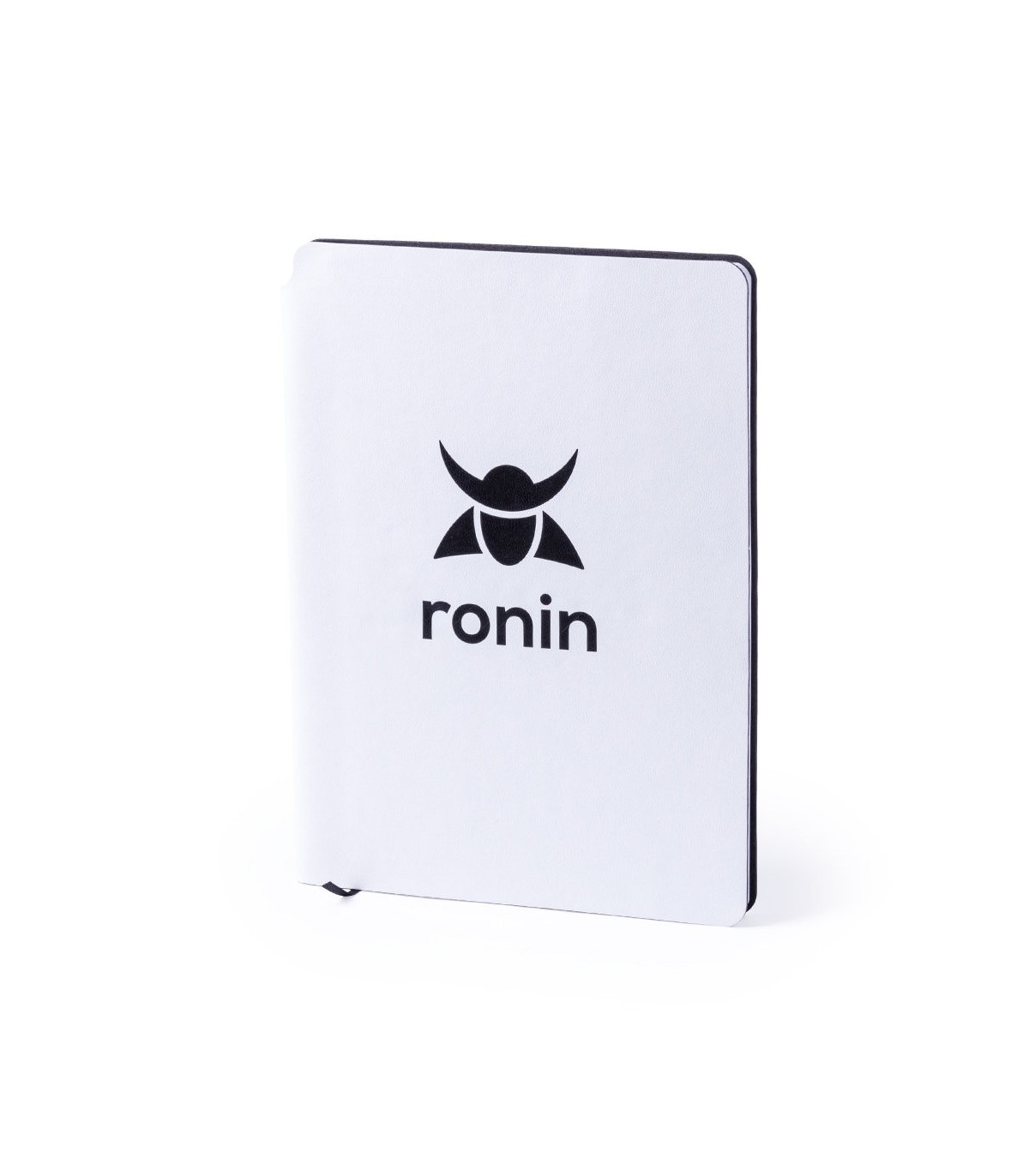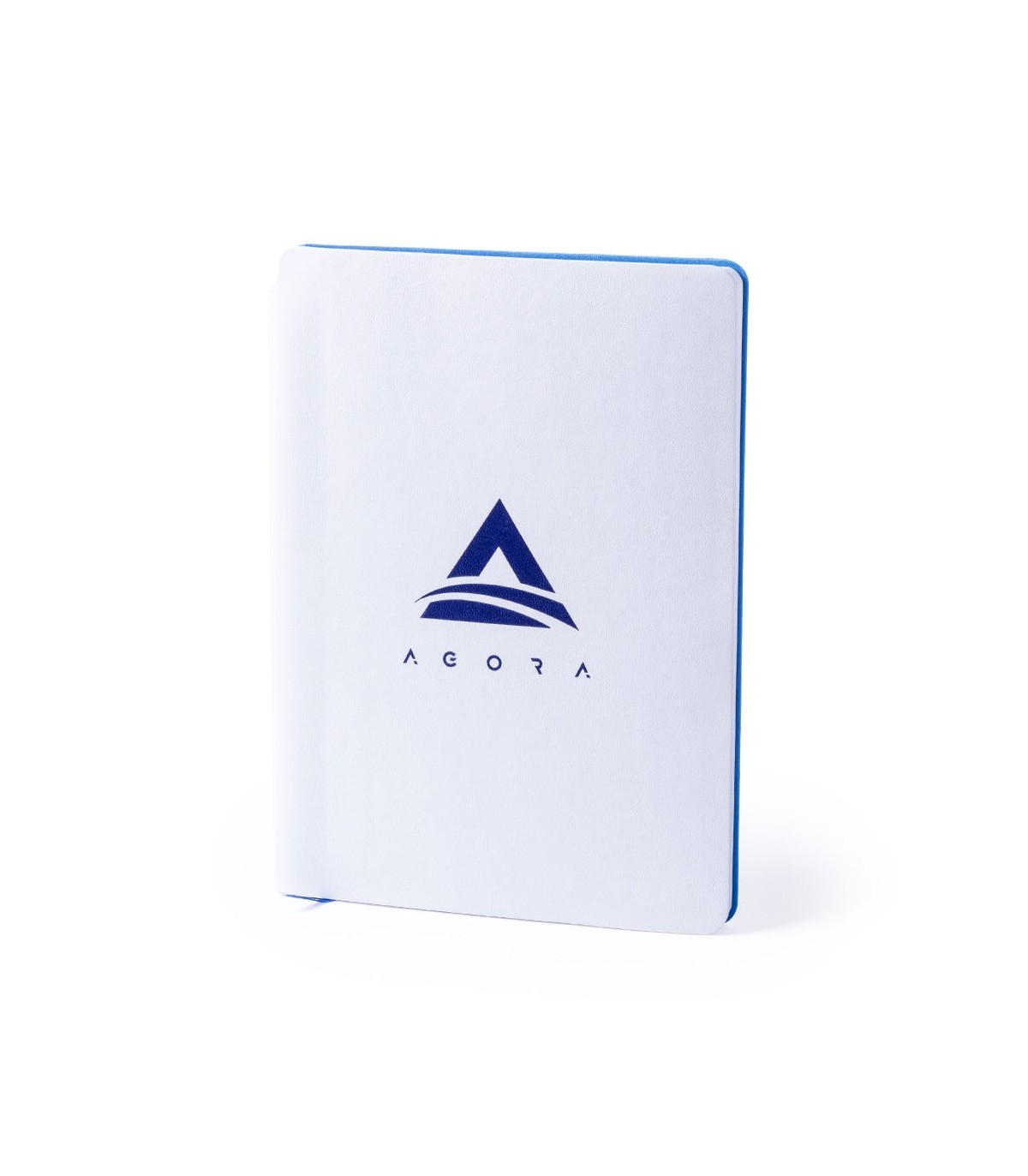 Bloc de notas con tapas de color blanco e interior en colores. Personalizados con tu logo de empresa. De 80 hojas lisas, con marcapáginas de tela a juego.