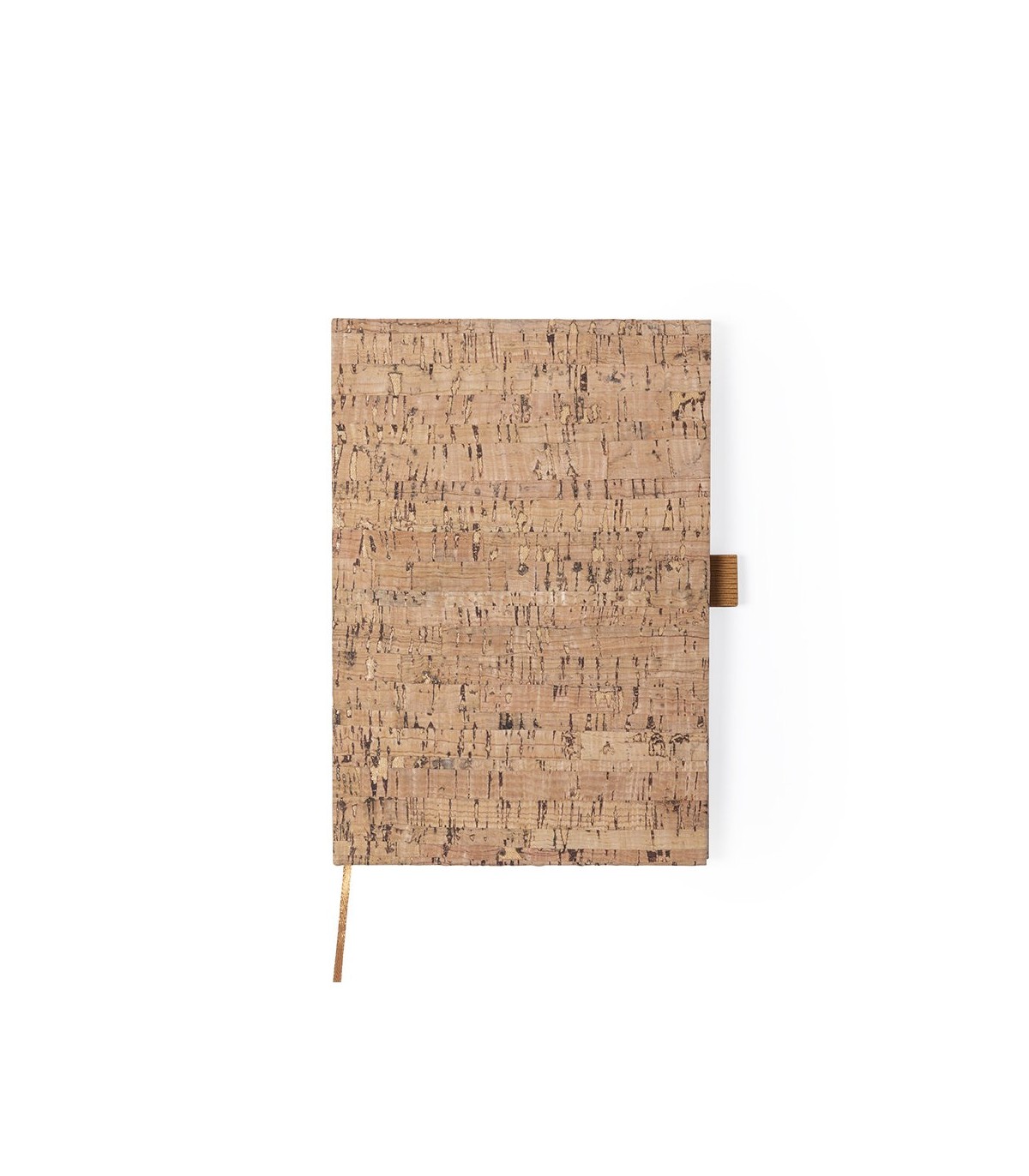 Bloc de notas de línea nature con tapas duras en corcho natural, de sobrio diseño. Incluye 100 hojas blancas lisas, con marcapáginas y soporte para bolígrafo a juego.