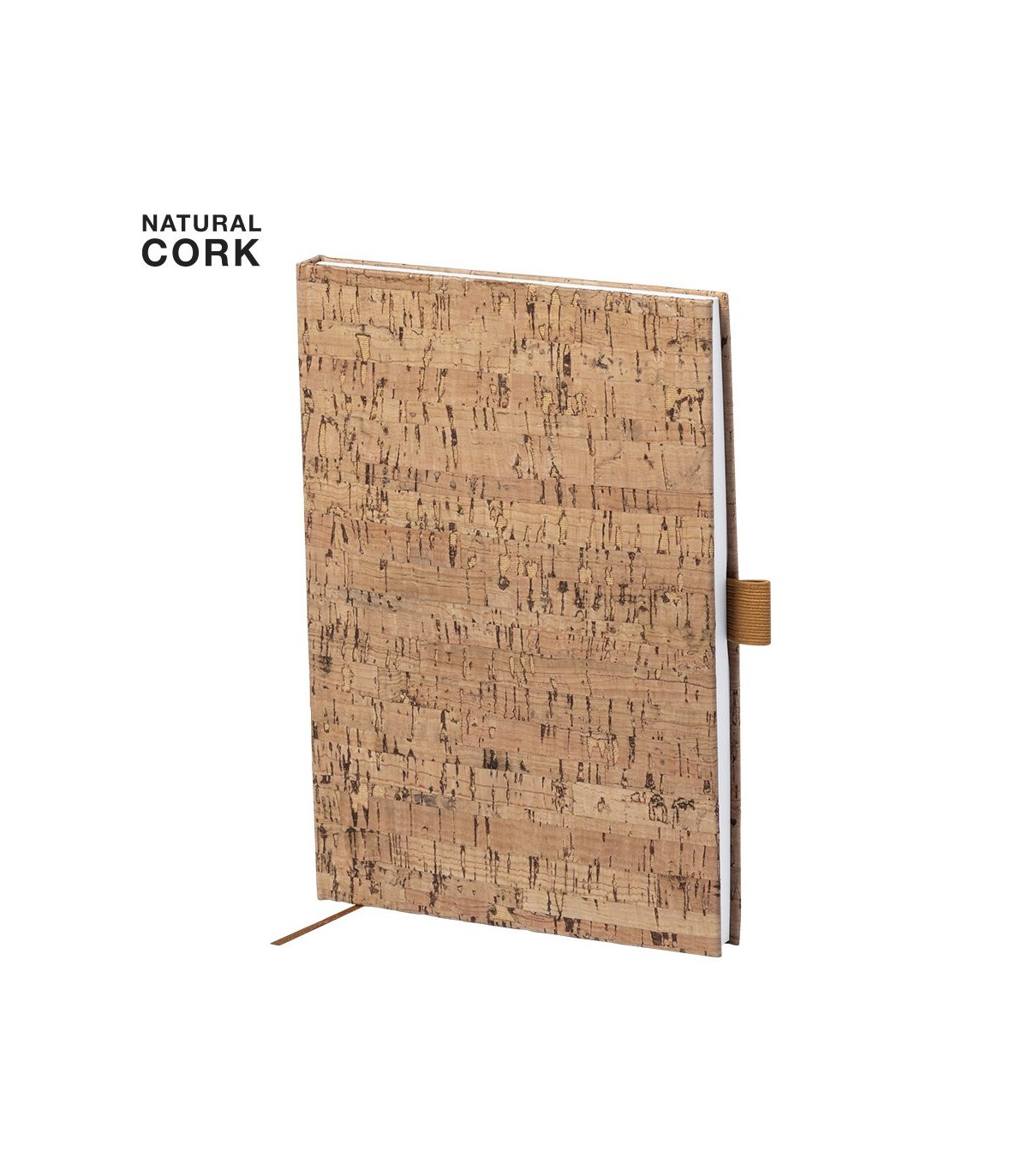 Bloc de notas de línea ecológica con tapas duras en corcho natural, de sobrio diseño. Incluye 100 hojas blancas lisas, con marcapáginas y soporte para bolígrafo a juego.