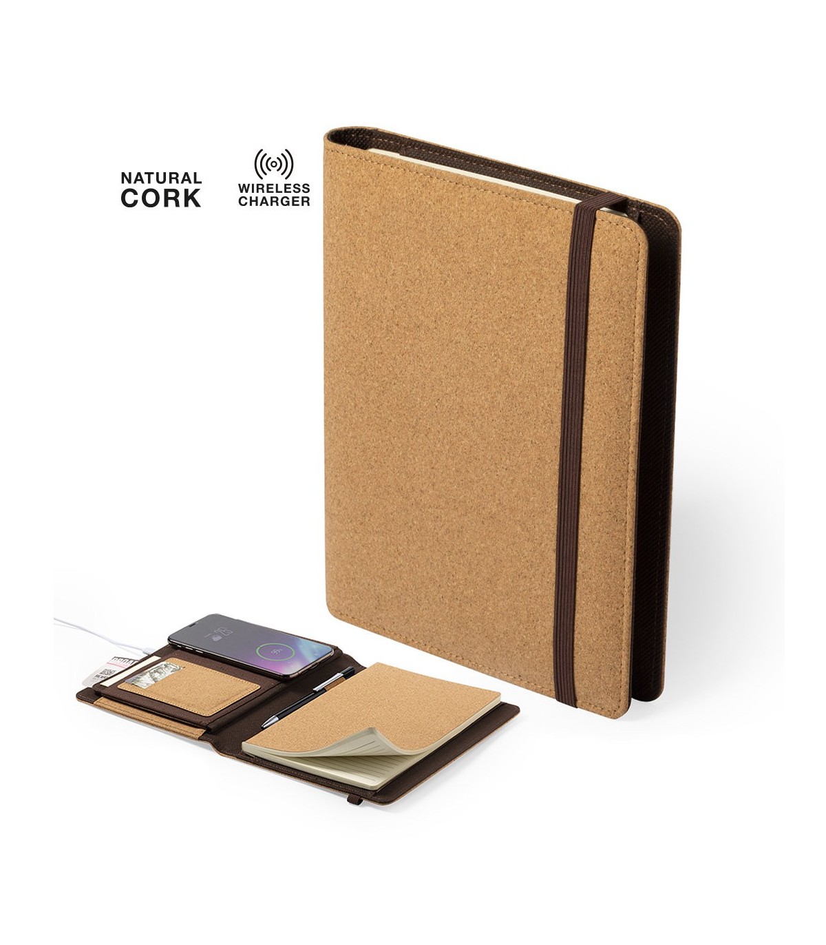 Bloc de notas de línea ecológica con cargador inalámbrico integrado. Cubiertas en corcho natural, de sobrio diseño y con original estación de carga en la contraportada. Compatible con dispositivos equipados con tecnología de carga inalámbrica. Bloc de 64 hojas con disposición a una raya. Incluye cable cargador micro USB y viene presentado en una atractiva caja de diseño eco.