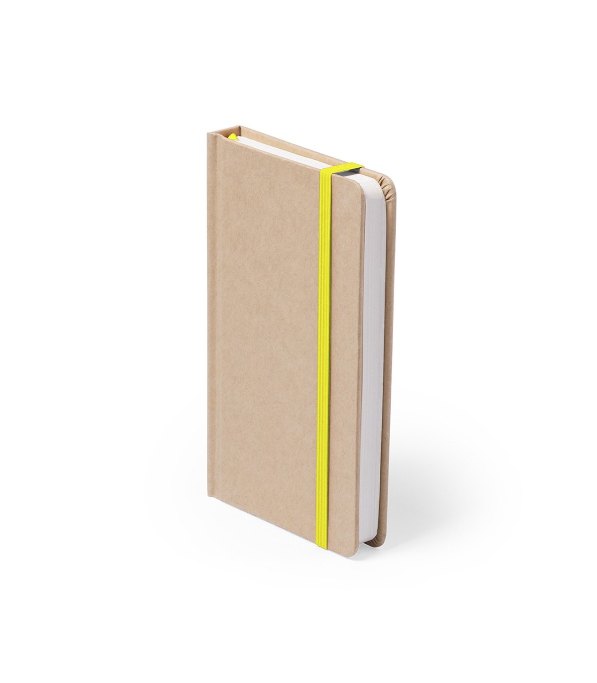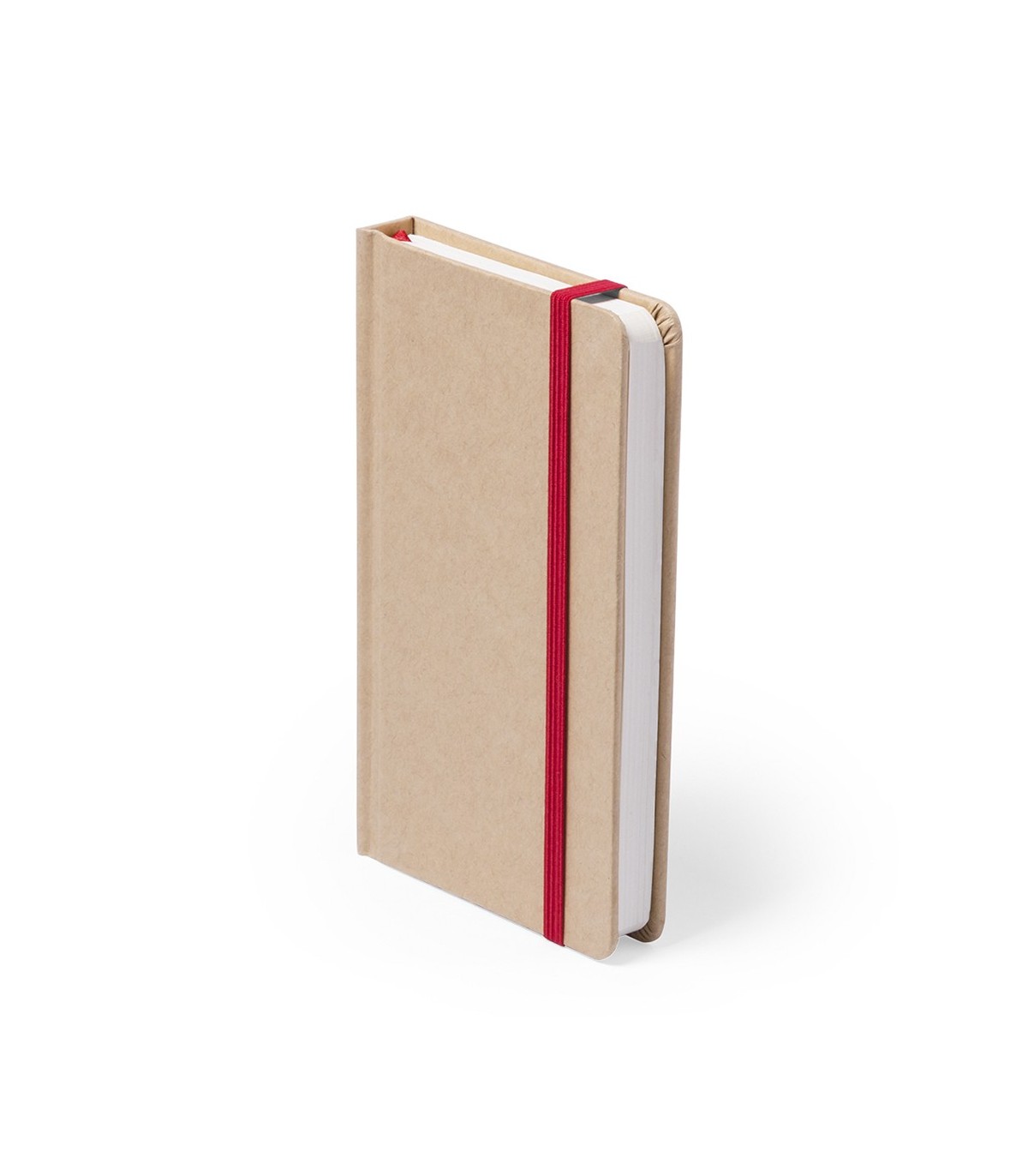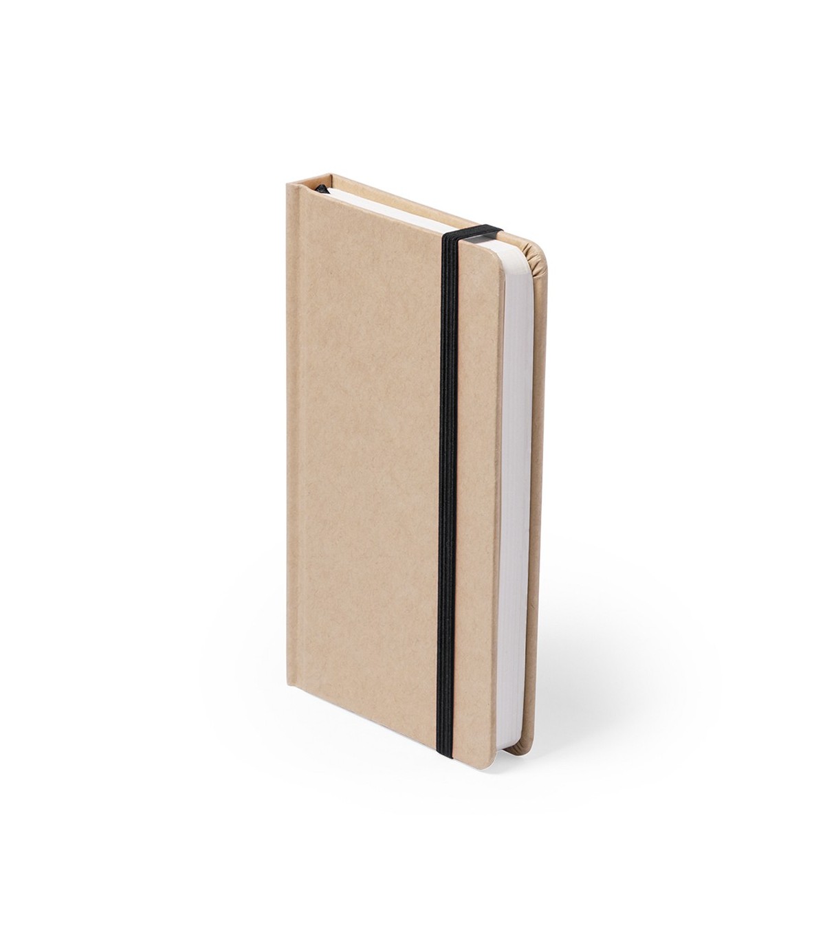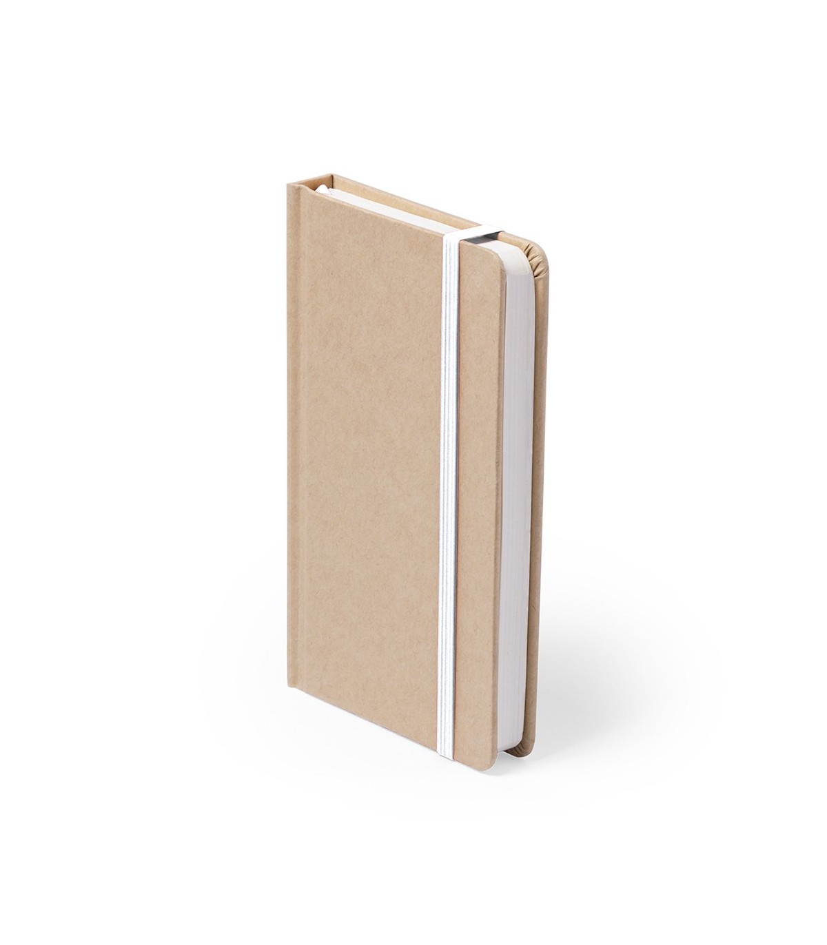 Bloc de notas con tapas de suave tacto acabadas en resistente cartón natural. De 100 hojas lisas, con elástico de sujeción y marcapáginas de tela a juego.