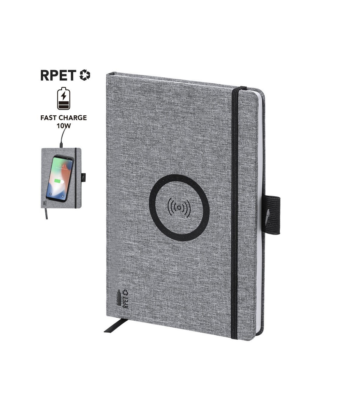 Bloc de notas cargador de fabricación ecológica en resistente poliéster 300D RPET de tamaño A5 y elaborado a partir de plástico reciclado, para así fomentar la reutilización de residuos plásticos y ayudar a la sostenibilidad del planeta. Con cargador inalámbrico de 10W integrado en la portada. Incluye 80 hojas con disposición a una raya. Compatible con smartphones con tecnología de carga inalámbrica. Incluido cable de carga Tipo C y disponible manual de instrucciones en español e inglés.