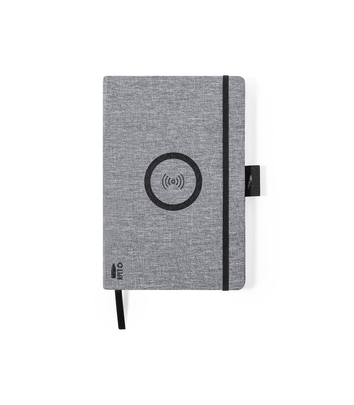 Bloc de notas cargador de tamaño A5, con cargador inalámbrico de 10W integrado en la portada. Incluye 80 hojas con disposición a una raya. Compatible con smartphones.