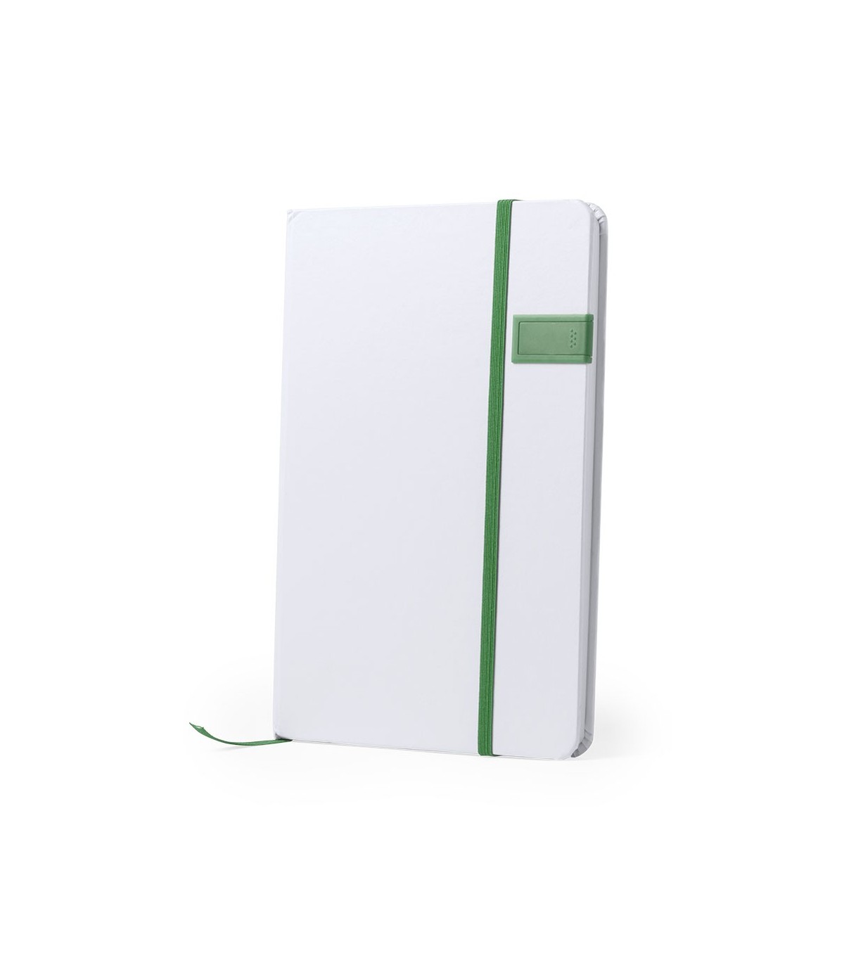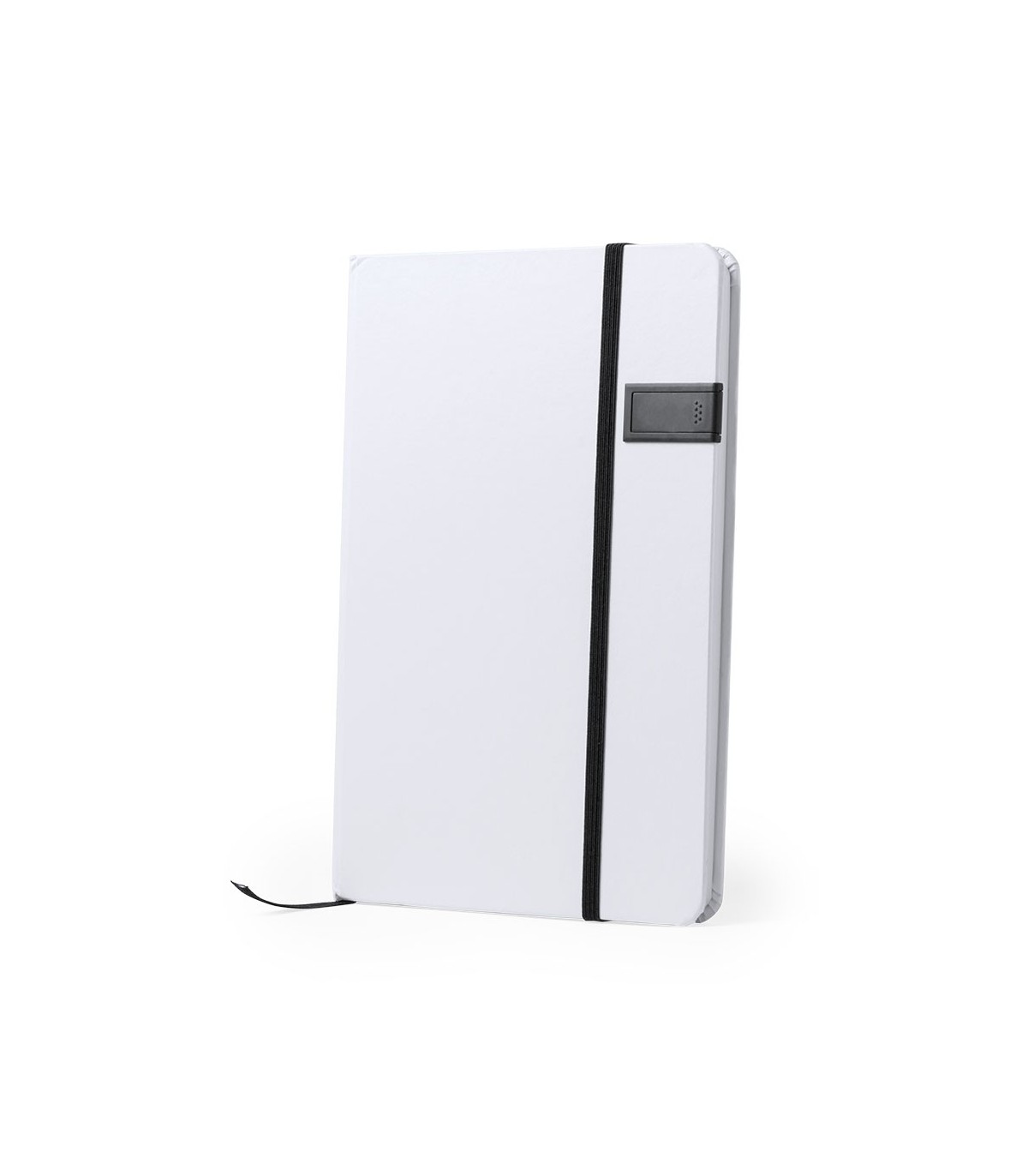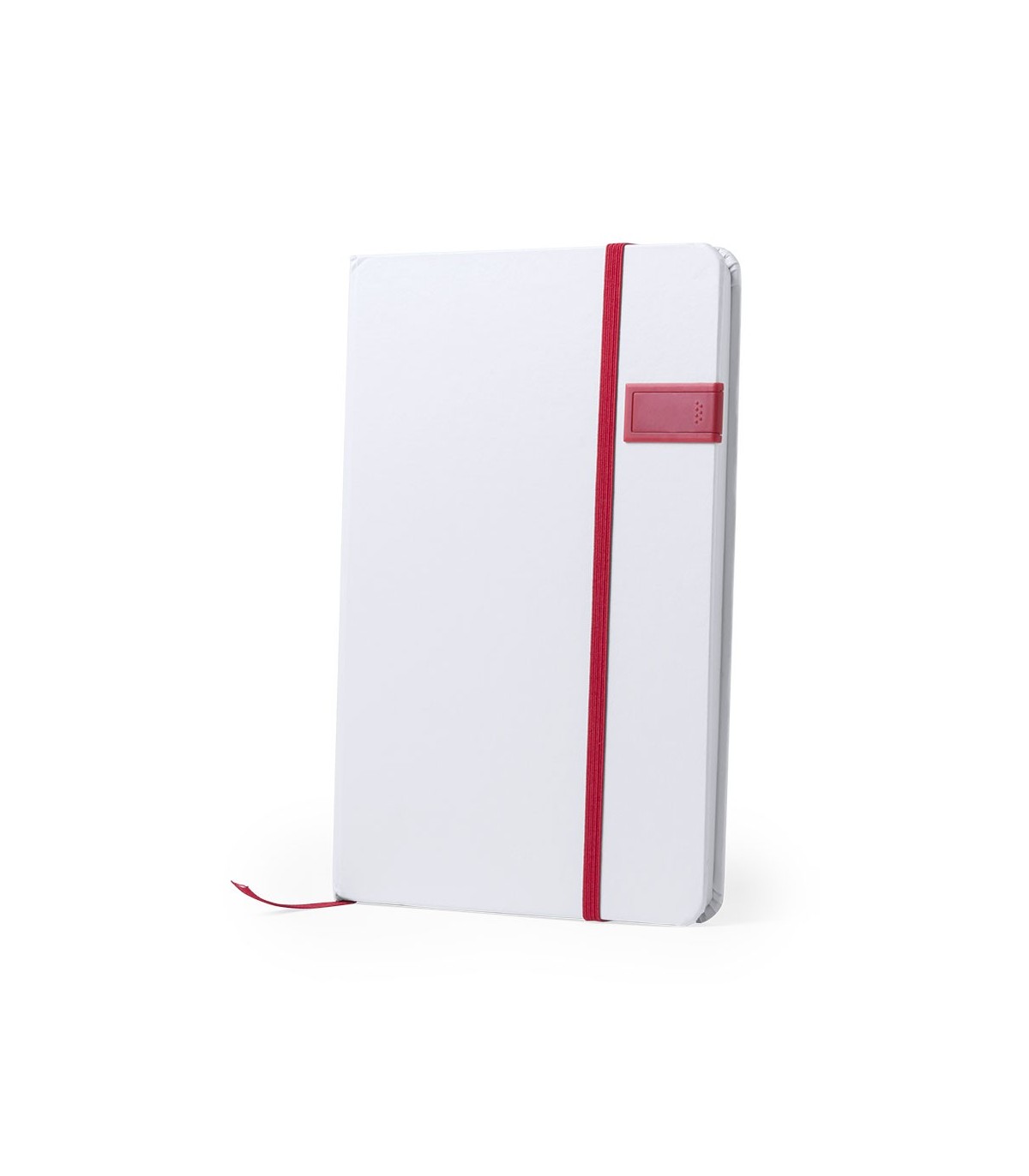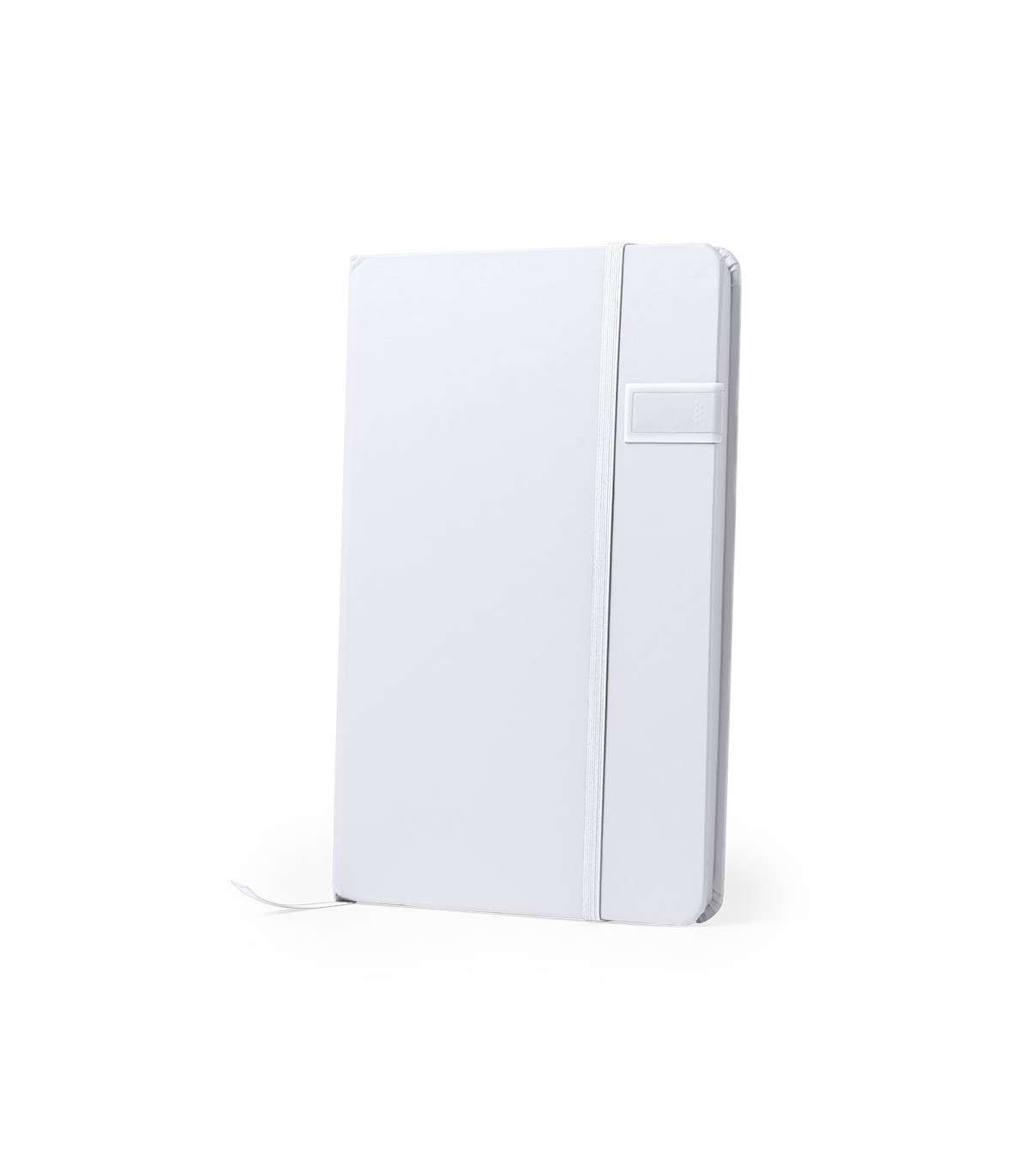 Bloc de notas de elegante acabado en color blanco, con memoria USB de 16GB de capacidad integrada en la tapa frontal. Cinta elástica, memoria USB y marcapáginas a juego, en variada gama de colores. Incluye 100 hojas con disposición a una raya.