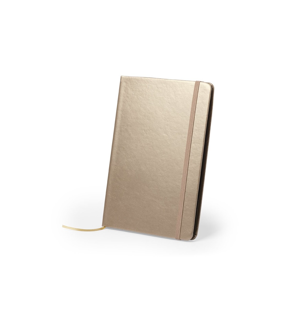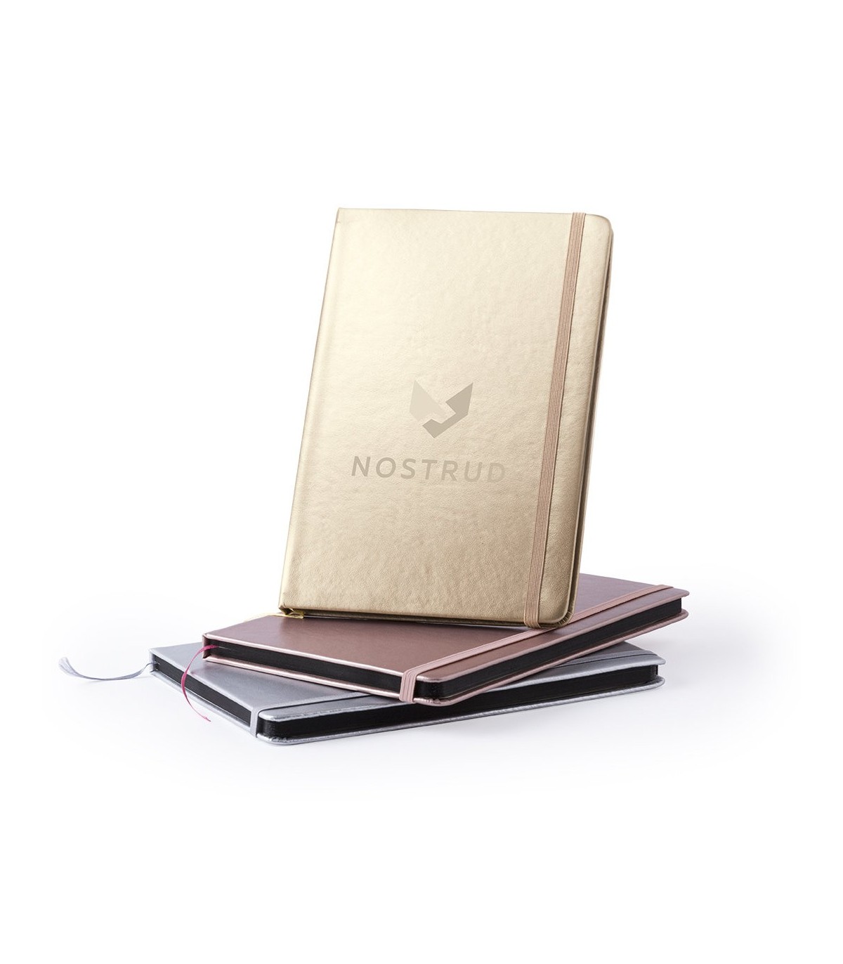 Bloc de notas en polipiel de llamativos colores metalizados. Disponible en colores dorado, plateado y oro rosa. Con tapas rígidas, elástico de sujeción y marcapáginas de tela a juego. Incluye 80 hojas lisas con acabado en color natural.