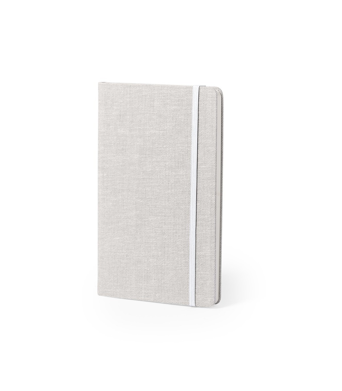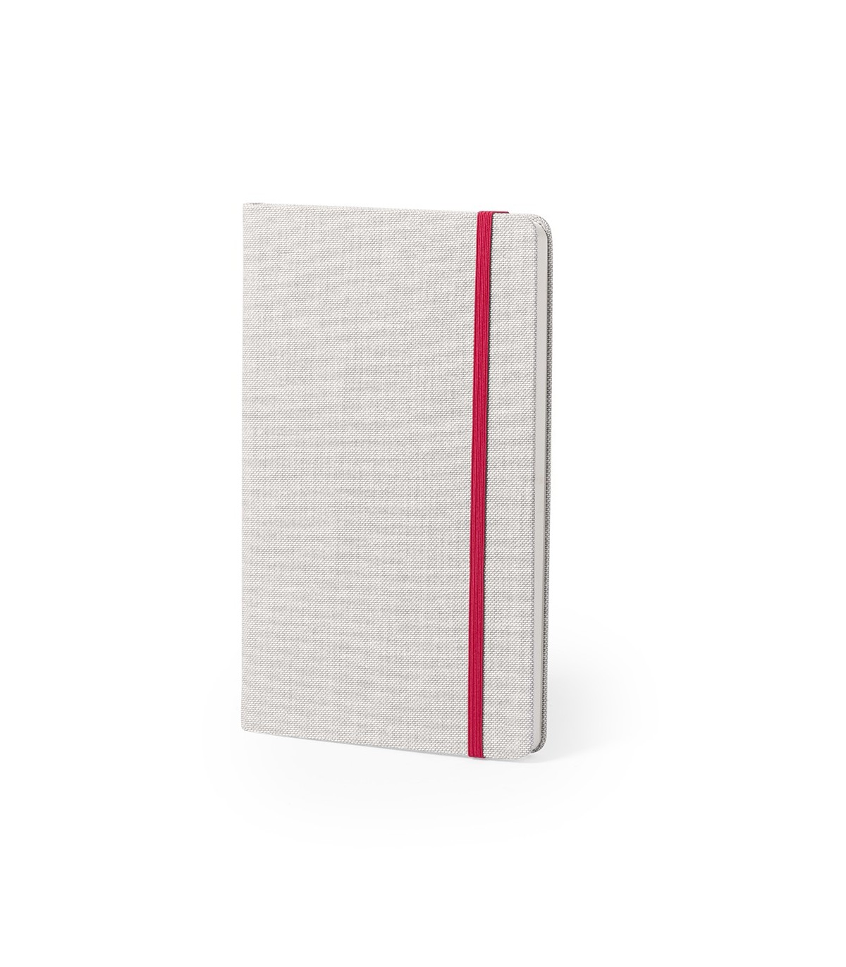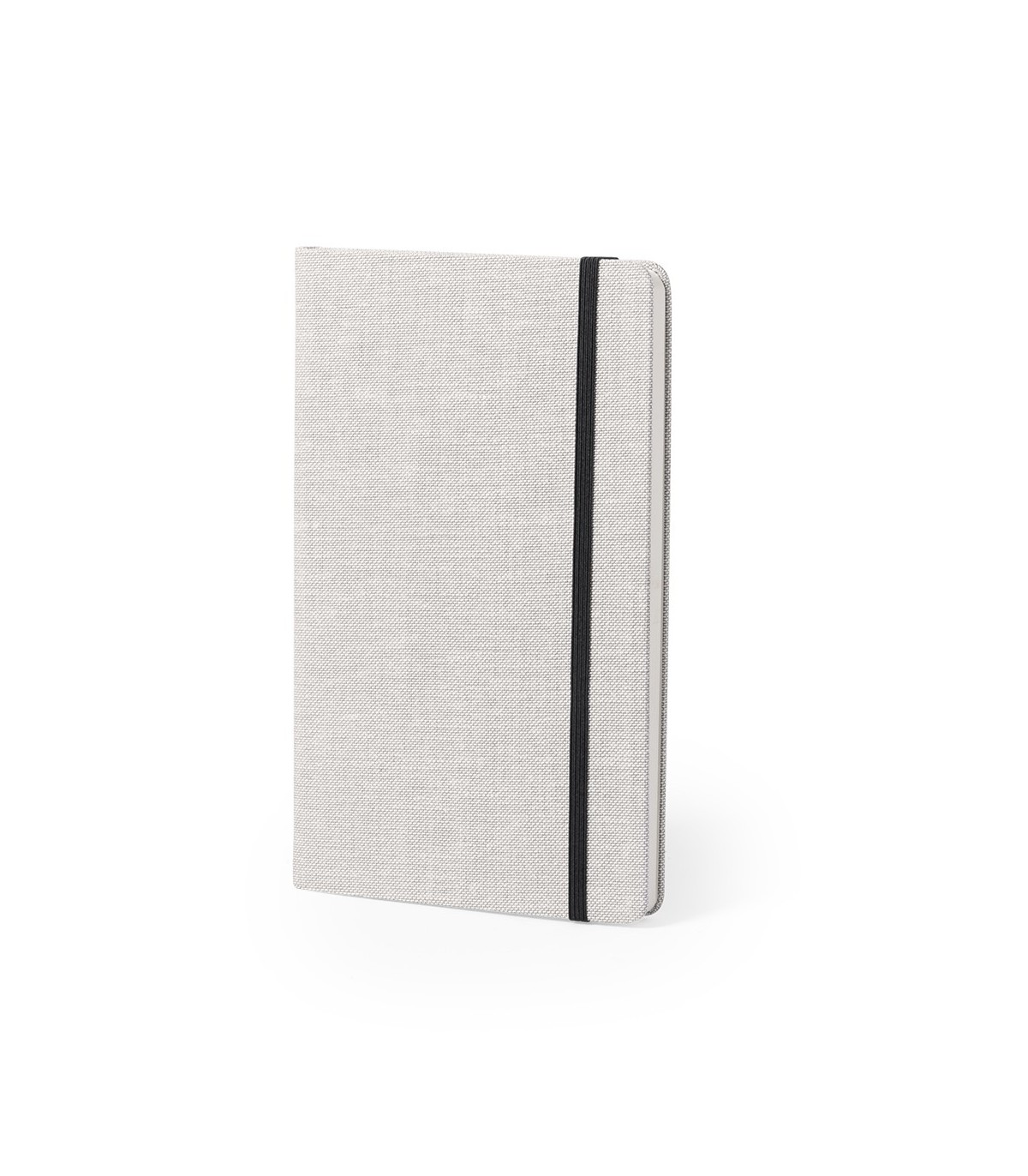 Bloc para notas con tapas rígidas con cinta elástica para sujeción y marcapaginas de tela, fabricado en poliéster con 98 hojas lisas.
