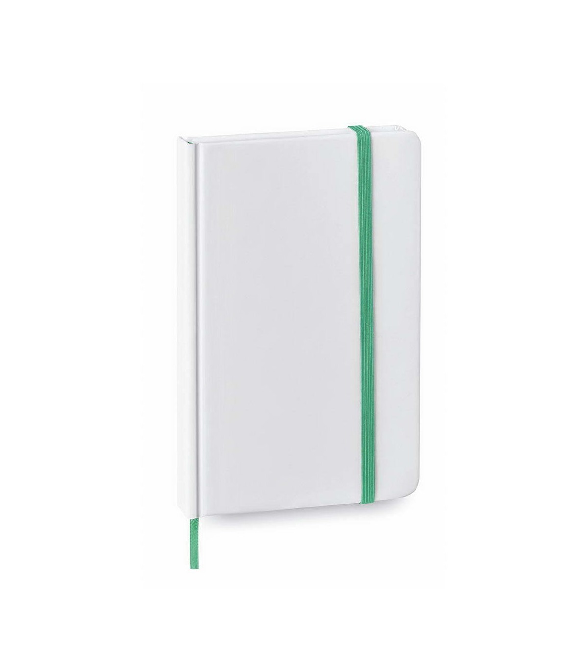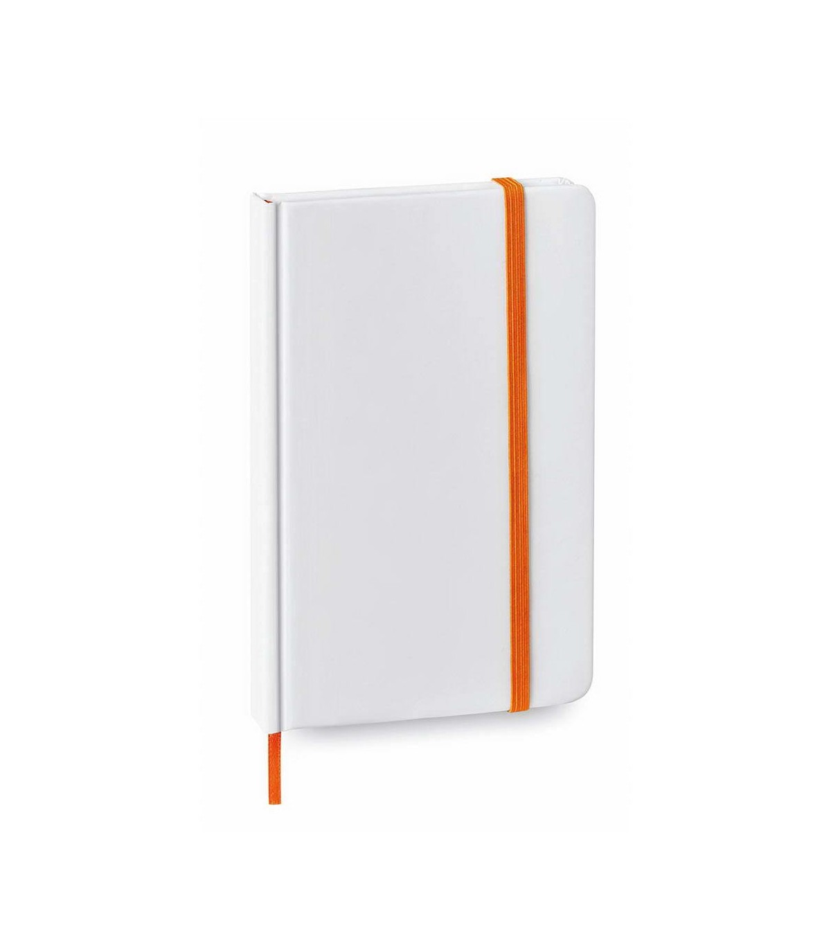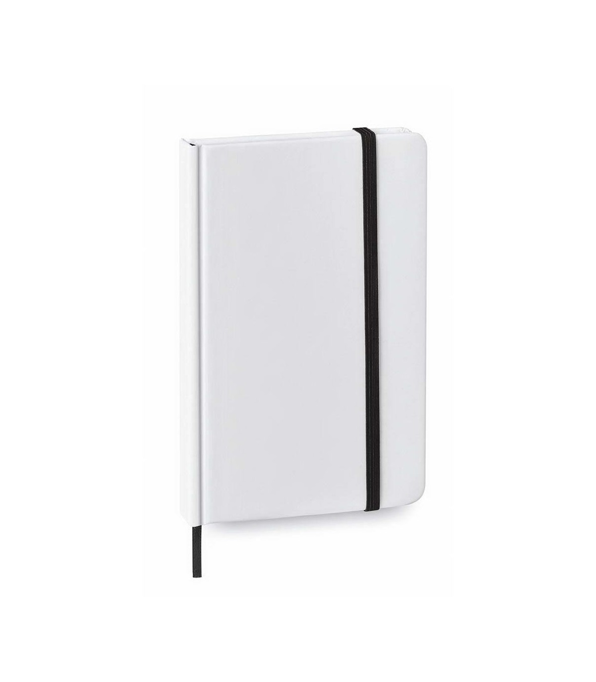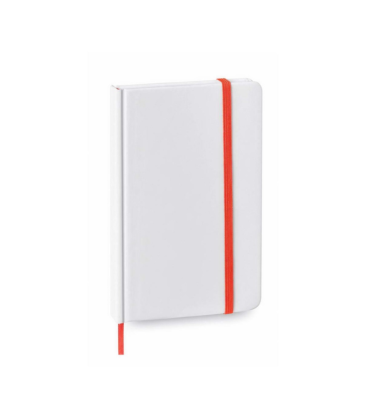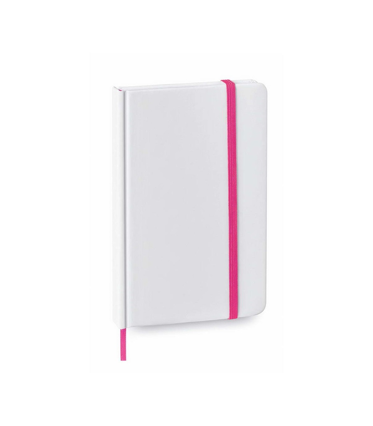 Bloc de notas portada rígida de color blanco con banda elásticas de colores personalizados promocionales.