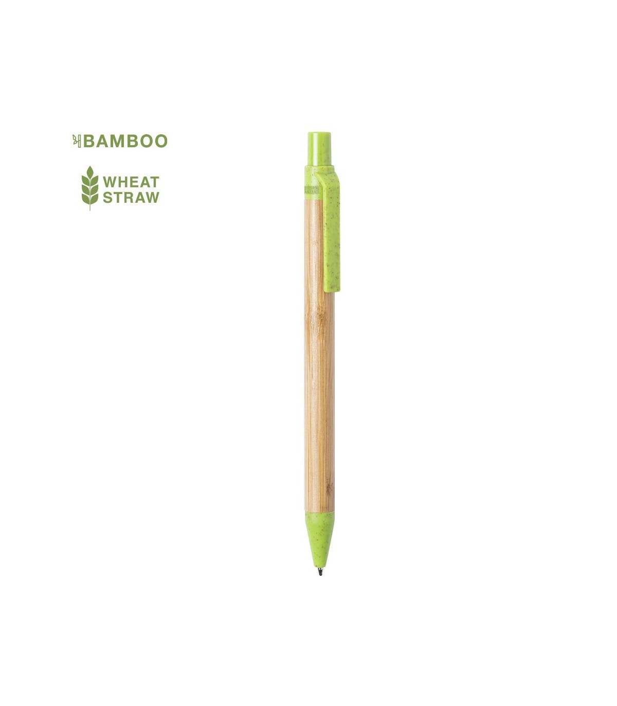 Bolígrafo de fabricación ecológica y mecanismo pulsador. Cuerpo fabricado en bambú, con accesorios en caña de trigo, para así fomentar la utilización de materias primas naturales y reducir las emisiones contaminantes. Con tinta azul y disponible en diversa gama de colores. Distintivo caña de trigo en la parte superior del bolígrafo.