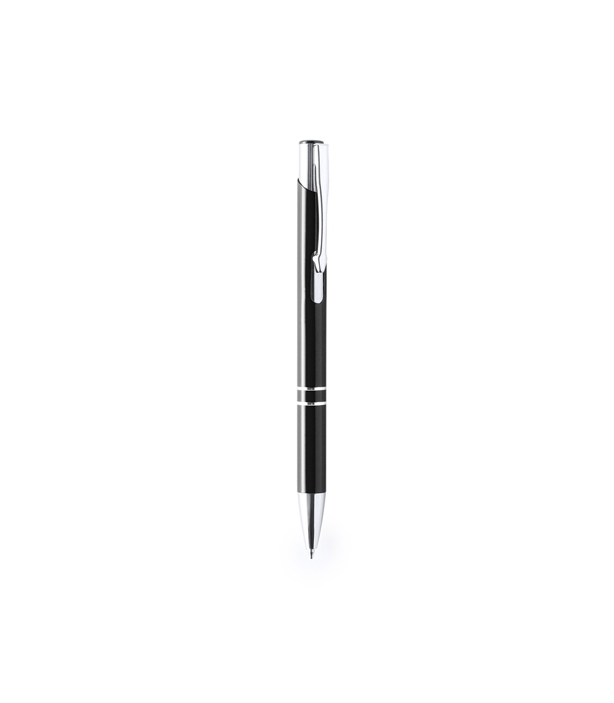Bolígrafos de aluminio promocionales en acabado brillante. Detalles en cromado y original muesca en cuerpo. De mecanismo pulsador y tinta azul.