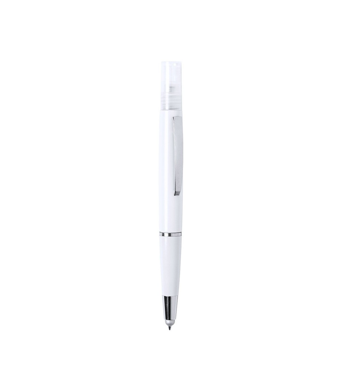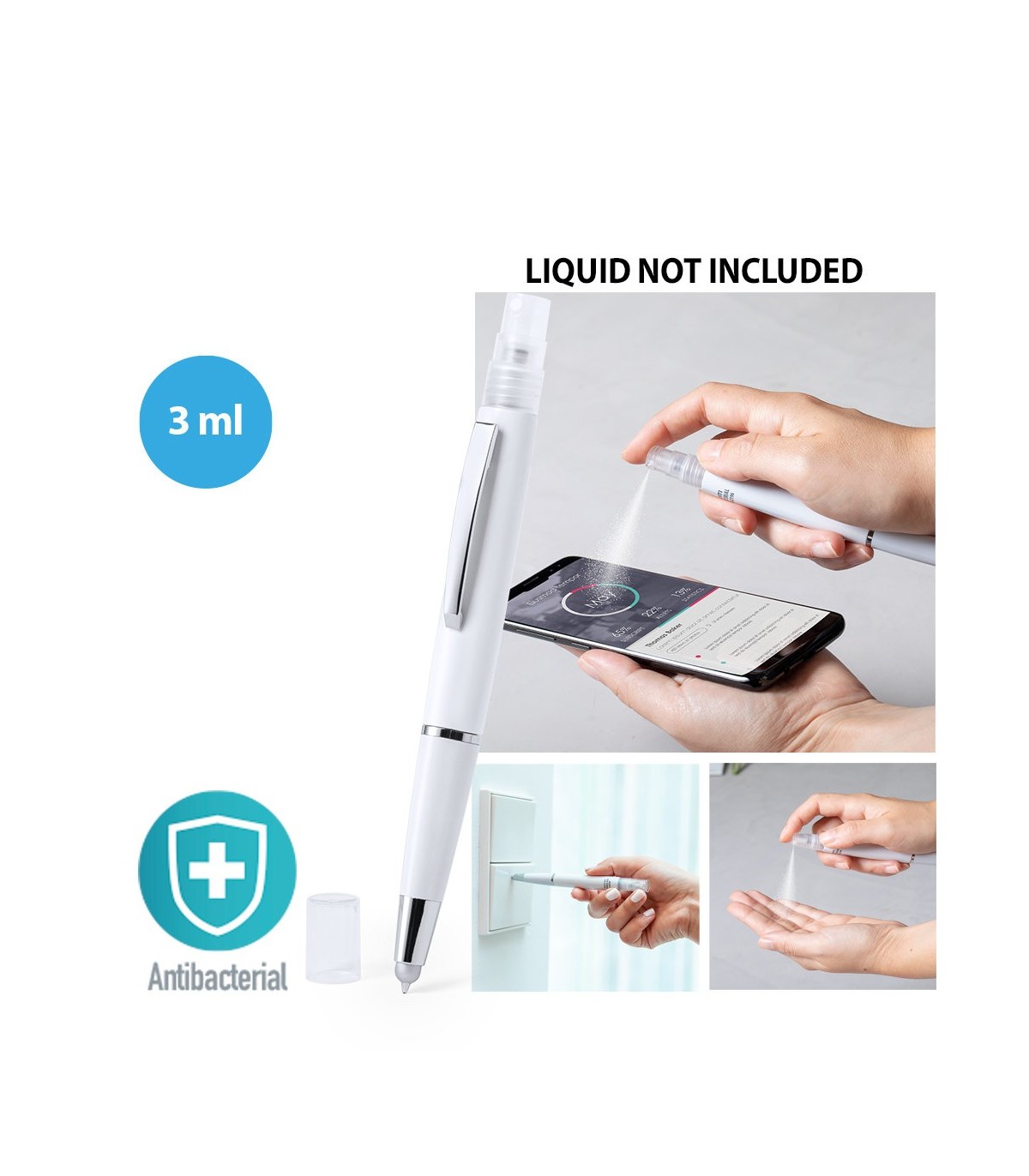 Bolígrafo antibacteriano con pulverizador recargable integrado y capucha protectora, incluye puntero en color gris. Acabado liso en resistente ABS brillante con elegante clip metálico y escritura en tinta azul. Capacidad del pulverizador 3ml. Líquido no incluido. Los productos con tratamientos antibacterianos son capaces de reducir drásticamente las cargas bacterianas presentes en las superficies de los materiales, gracias a la incorporación de agentes microbianos permanentes estáticos, con alta efectividad para inhibir y prevenir la contaminación bacteriana. Artículo de acuerdo al estándar ISO 22196, que determina la actividad antibacteriana en materiales plásticos y superficies no porosas, lo que permite conocer la efectividad de inhibición microbiana que tienen los aditivos sobre los objetos tratados mediante una evaluación cuantitativa.