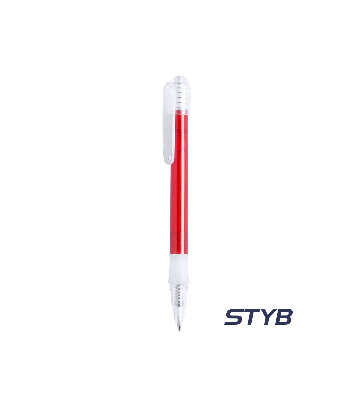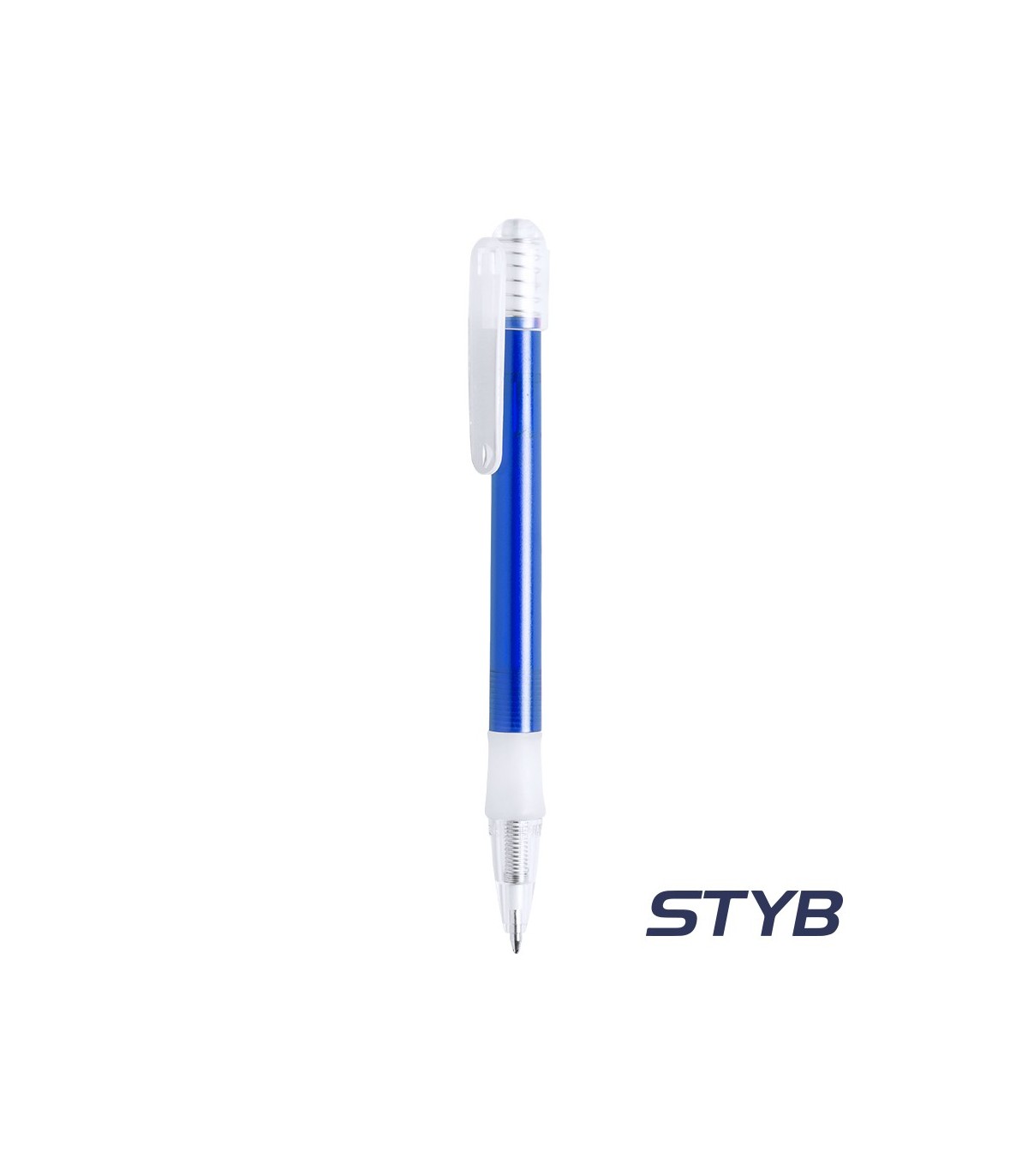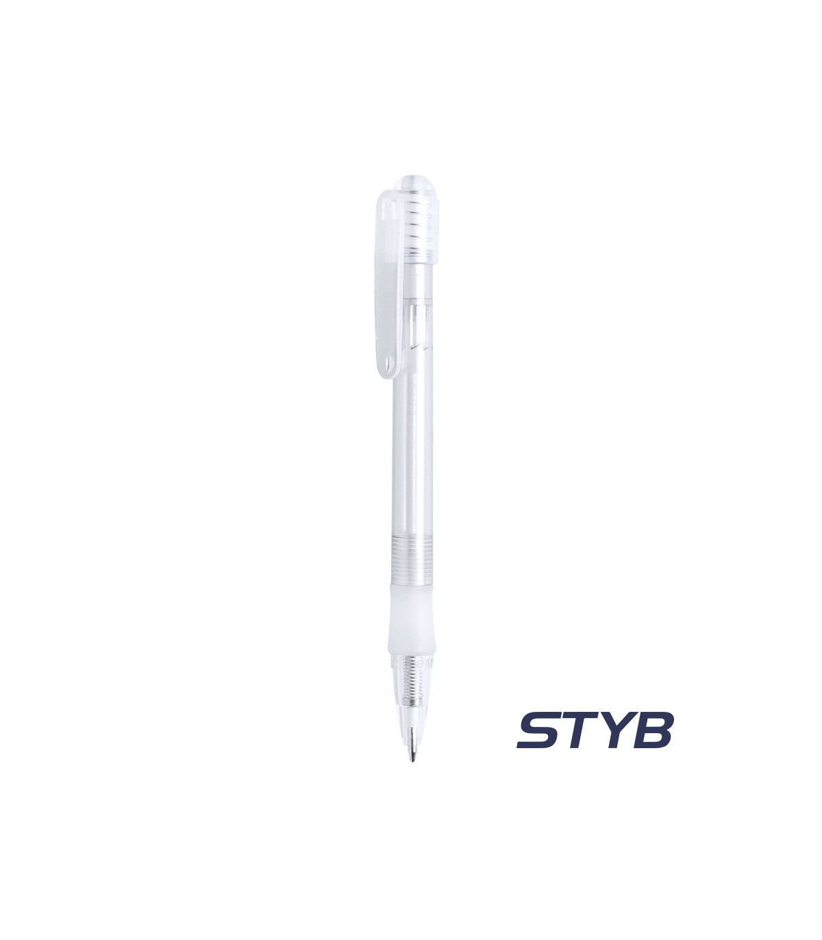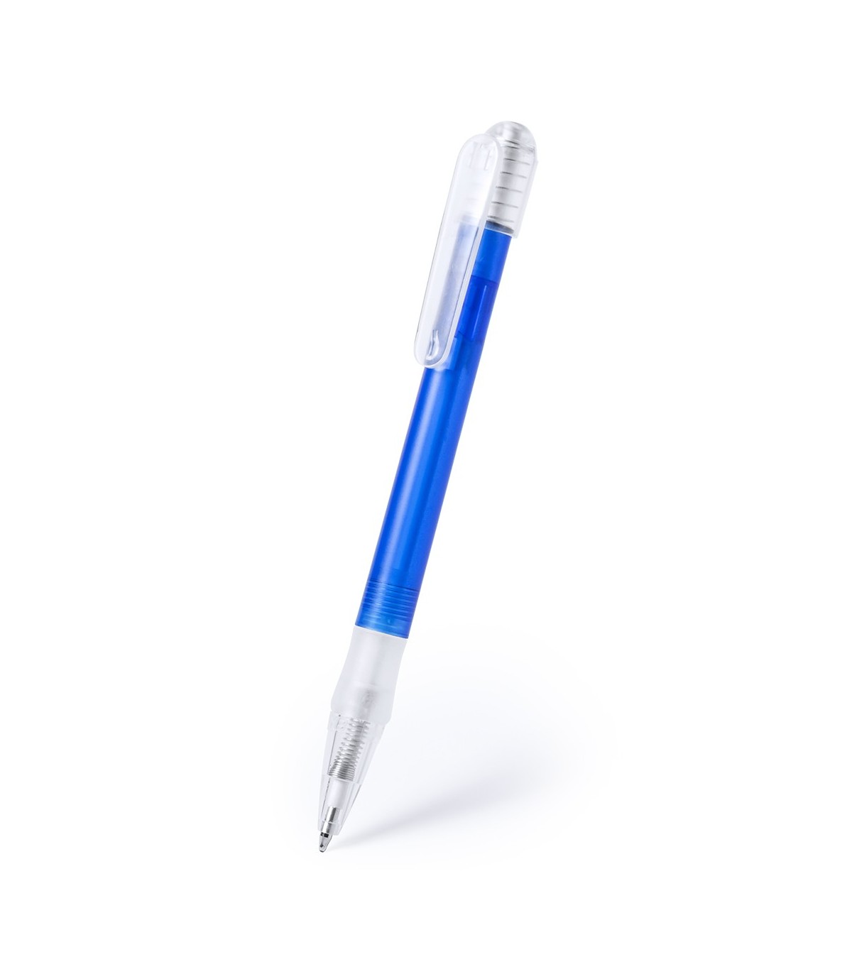 Bolígrafo de apertura con mecanismo pulsador con cuerpo de acabado translúcido en diversa gama de colores y accesorios en blanco translúcido. Con suave empuñadura y con escritura en tinta azul.