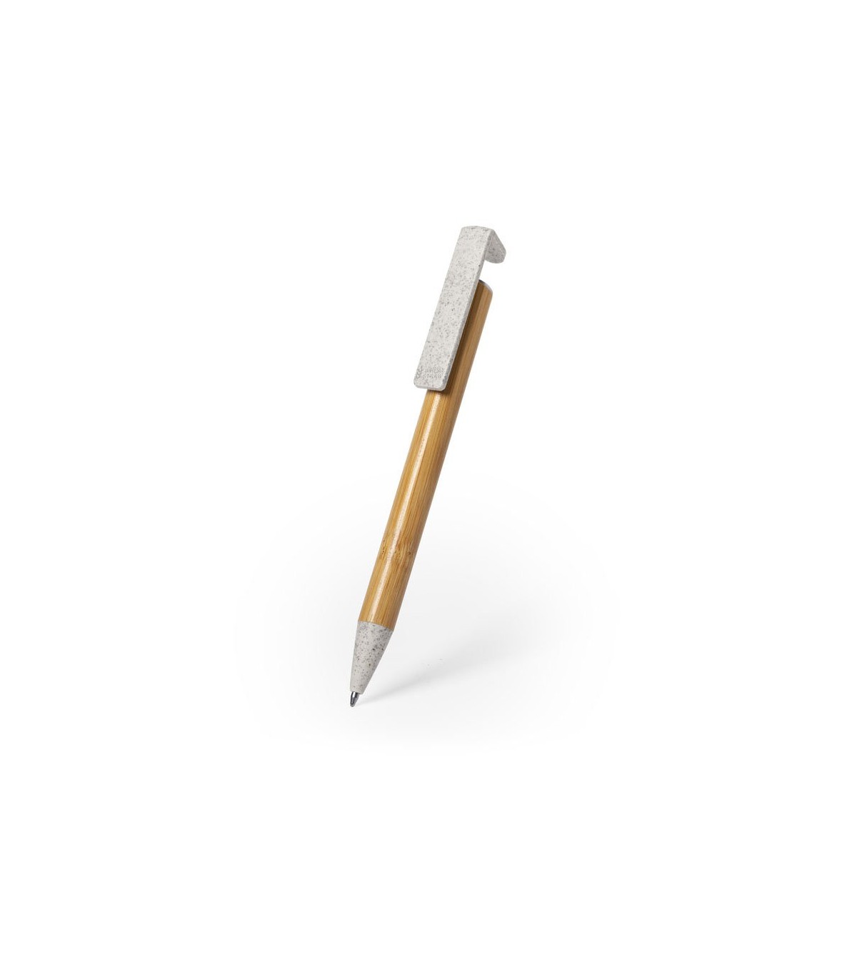 Original bolígrafo en bambú, con clip y punta en caña de trigo. De mecanismo pulsador, con soporte integrado en clip para dispositivo móvil. De cartucho jumbo y en tinta azul.