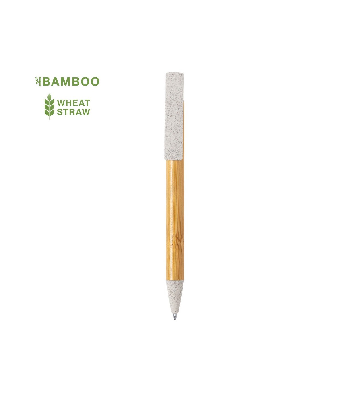 Original bolígrafo de fabricación ecológica. Cuerpo en bambú, con clip y punta en caña de trigo, para así fomentar la utilización de materias primas naturales y reducir las emisiones contaminantes. De apertura mediante pulsación, con soporte integrado en clip para dispositivo móvil. De cartucho jumbo y en tinta azul.