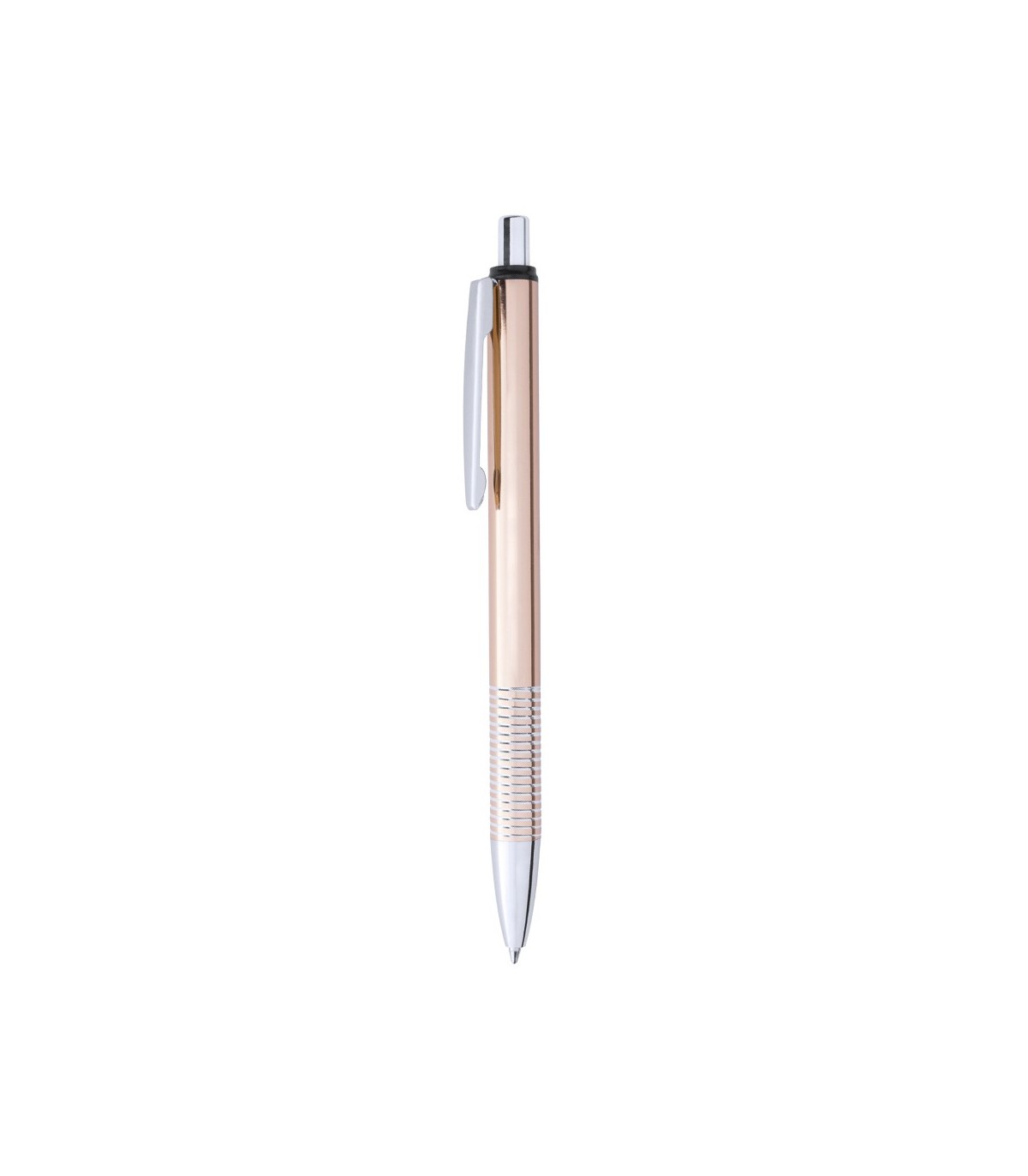 Bolígrafo de apertura con mecanismo pulsador y elegante diseño en colores plateado y dorado. Con cuerpo en aluminio de suave acabado, accesorios y anillas en plateado. Original clip en plateado, de cartucho jumbo y con escritura en tinta azul.