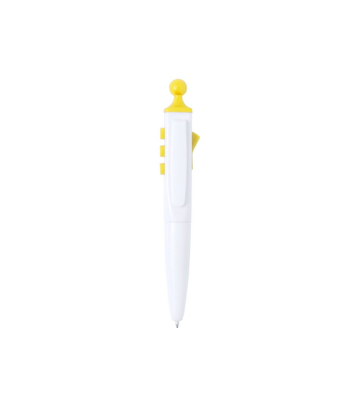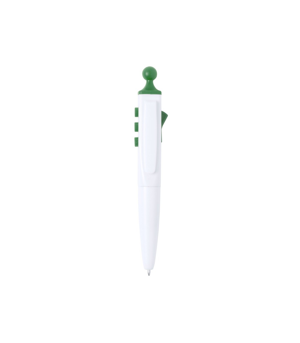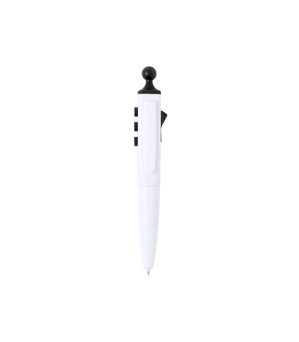 Relajante bolígrafo antiestrés con multitud de botones para pulsar y bolita flexible en parte superior. De mecanismo giratorio, con cuerpo en color blanco y accesorios en diversa gama de llamativos colores. Escritura en tinta de color azul.