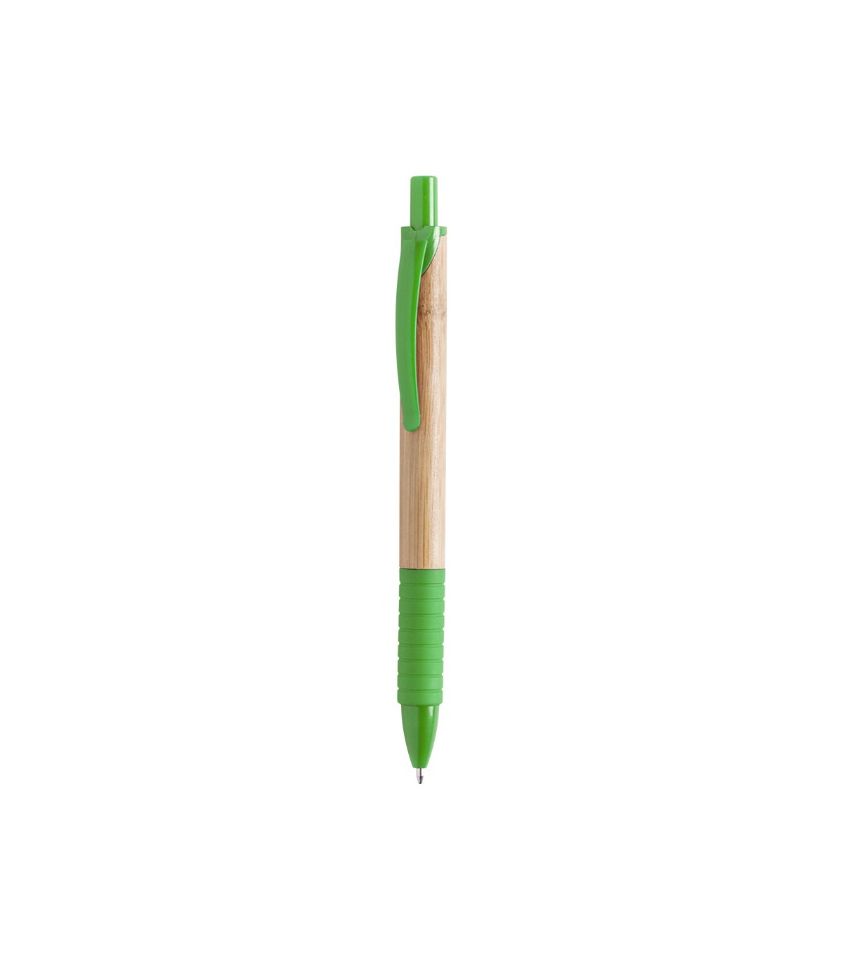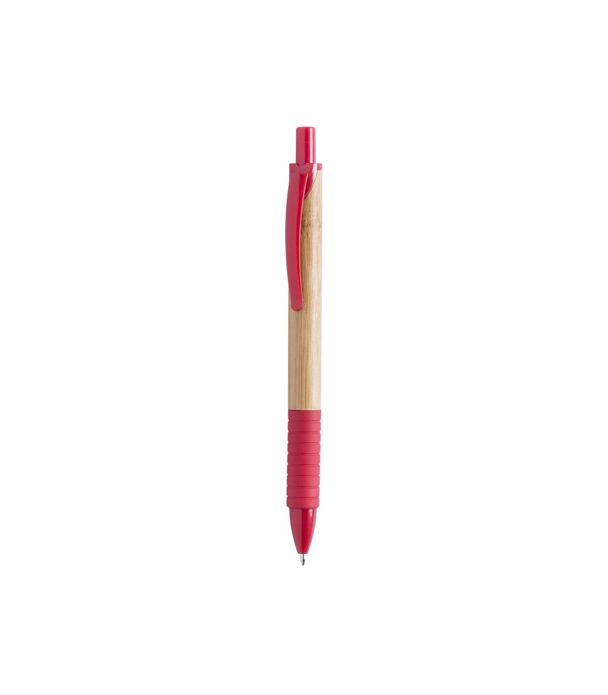 Bolígrafo de apertura con mecanismo pulsador en original combinación de cuerpo en madera de bambú natural y accesorios en diversa gama de llamativos colores. Cómoda empuñadura a juego y con escritura en tinta azul.