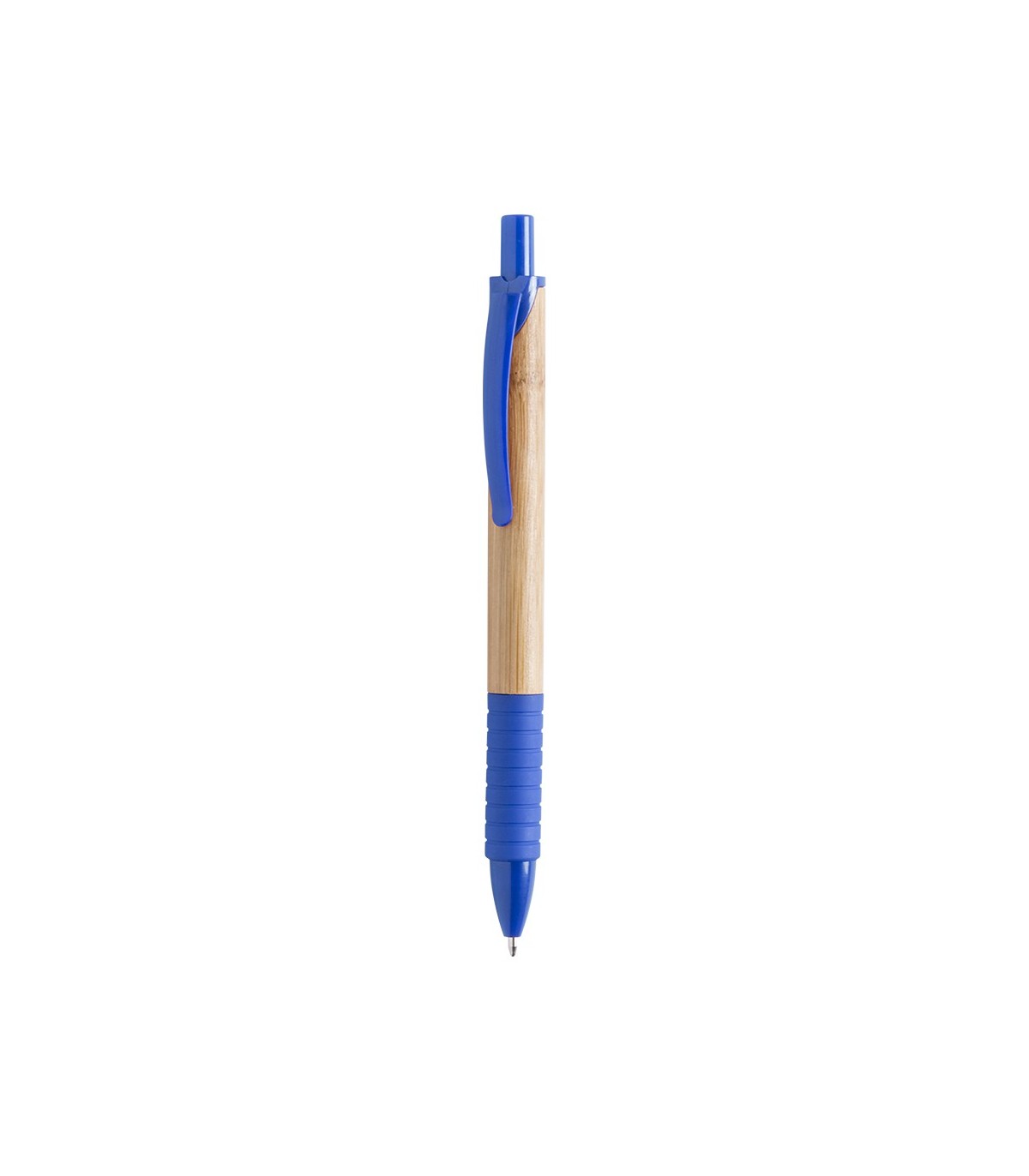 Bolígrafos de tinta azul y mecanismo pulsador fabricado combinando madera de bambú para el cuerpo y platico para el cabezal y empuñadura.