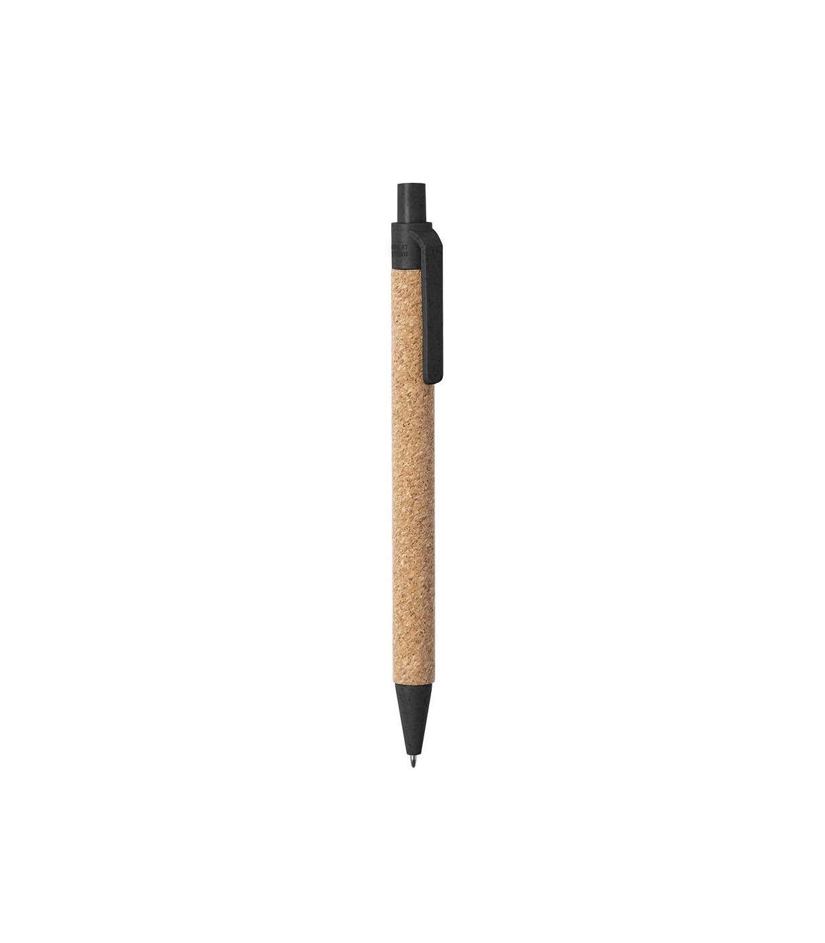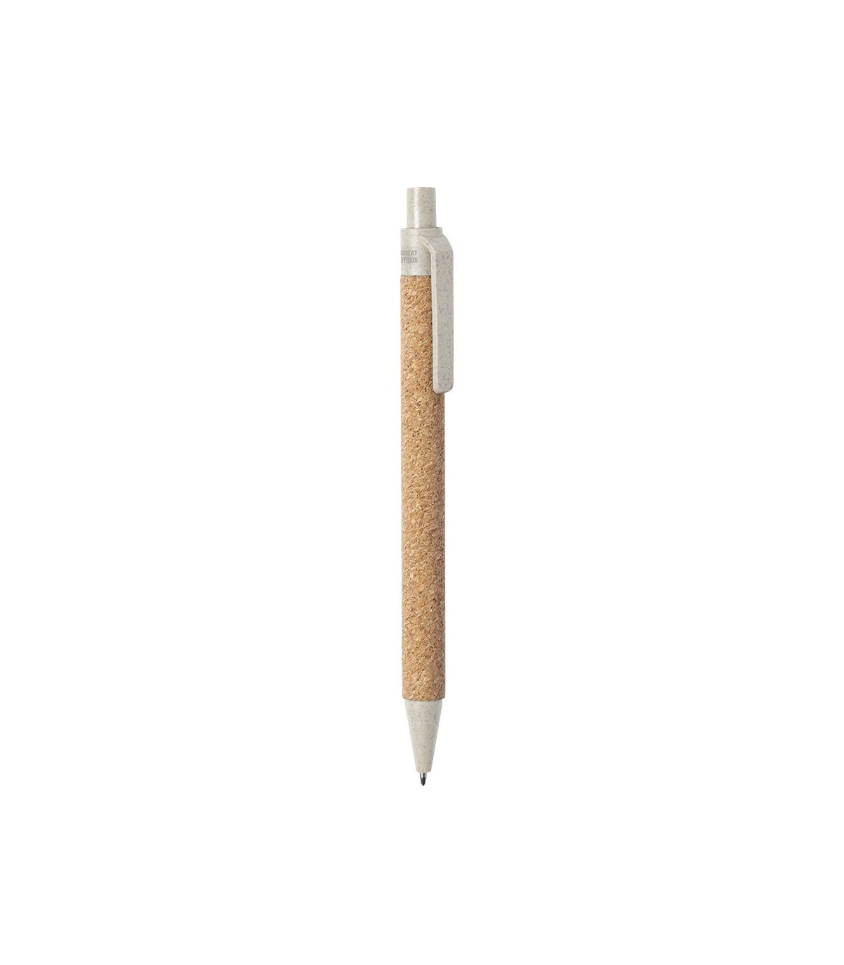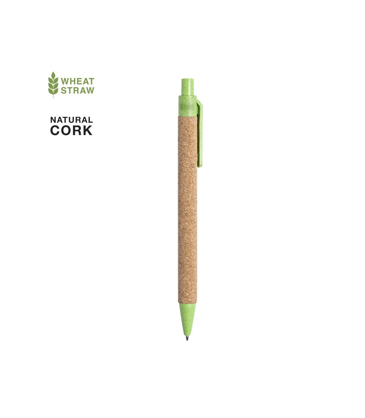 Bolígrafo de fabricación ecológica con mecanismo pulsador. Combinación de cuerpo en corcho natural y accesorios en caña de trigo y ABS , para así fomentar la utilización y reciclado de materias primas, reduciendo así las emisiones contaminantes. Disponible en diversa gama de colores, con tinta azul. Distintivo Wheat Straw en la parte superior del bolígrafo.