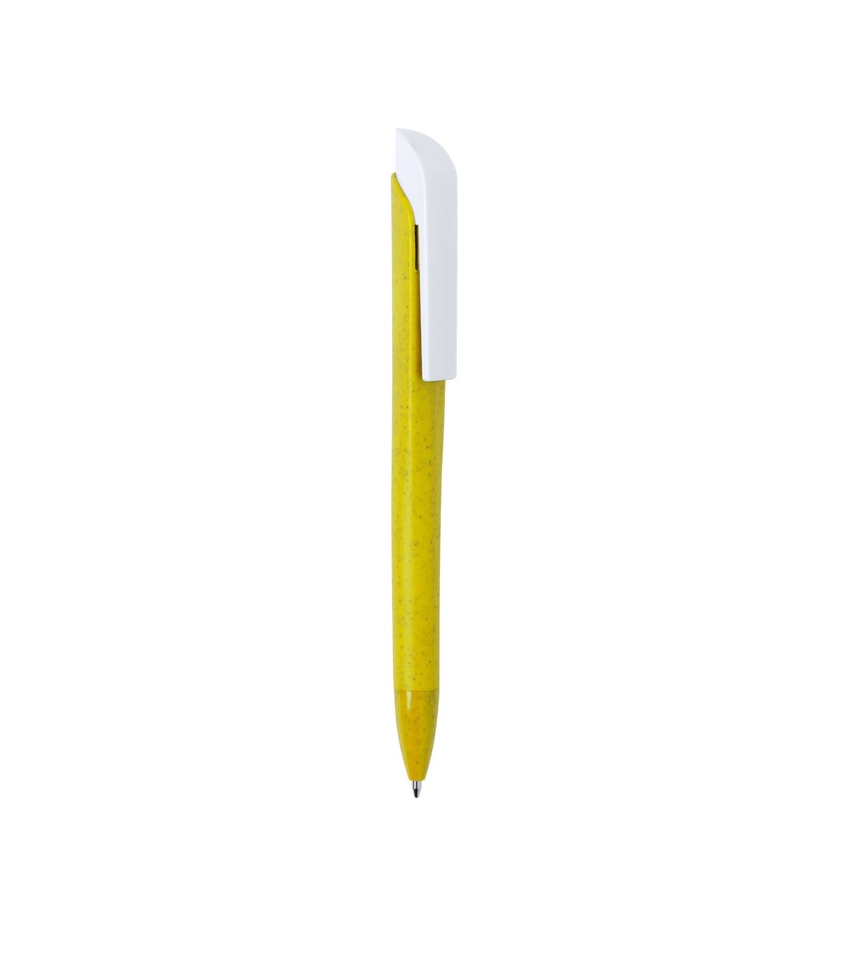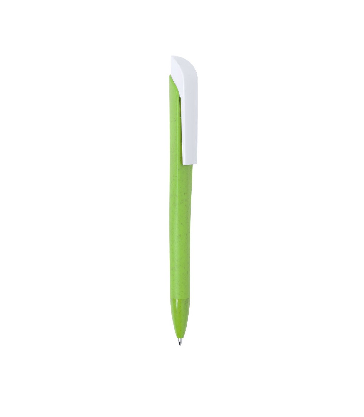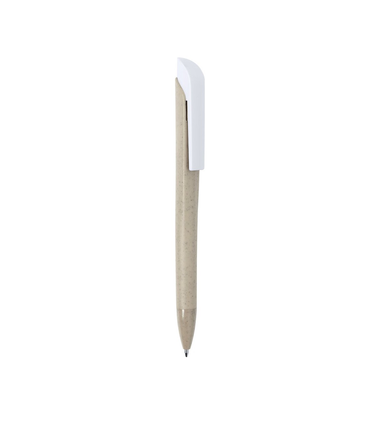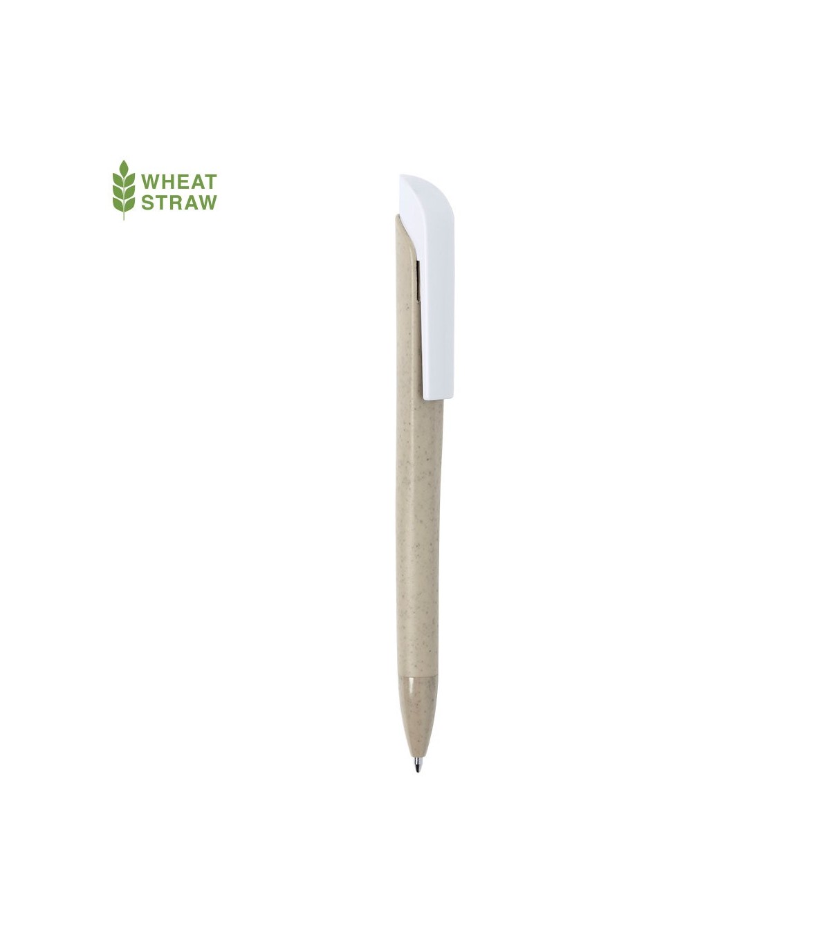 Bolígrafo de fabricación ecológica en caña de trigo, para así fomentar la utilización de materias primas naturales y reducir las emisiones contaminantes. Con clip en blanco especialmente diseñado para marcaje en tampografía. De apertura mediante pulsación y con tinta azul. Disponible en diversa gama de colores nature.