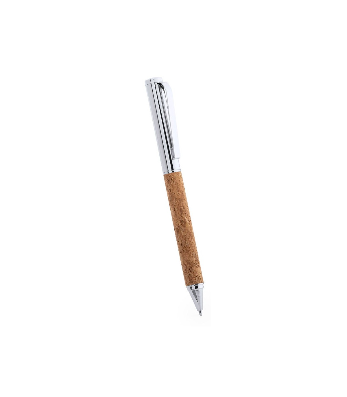 Bolígrafos ecológicos en corcho natural. Clip, punta y parte superior metálicos, con acabado cromado. De mecanismo giratorio, cartucho jumbo y con tinta azul.