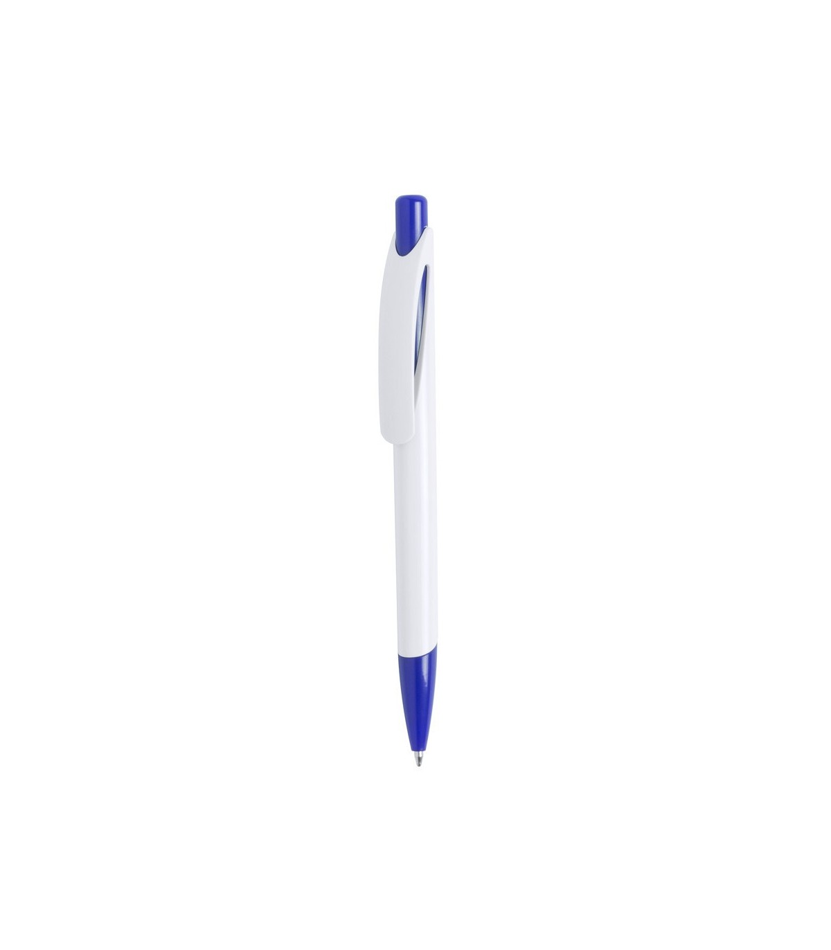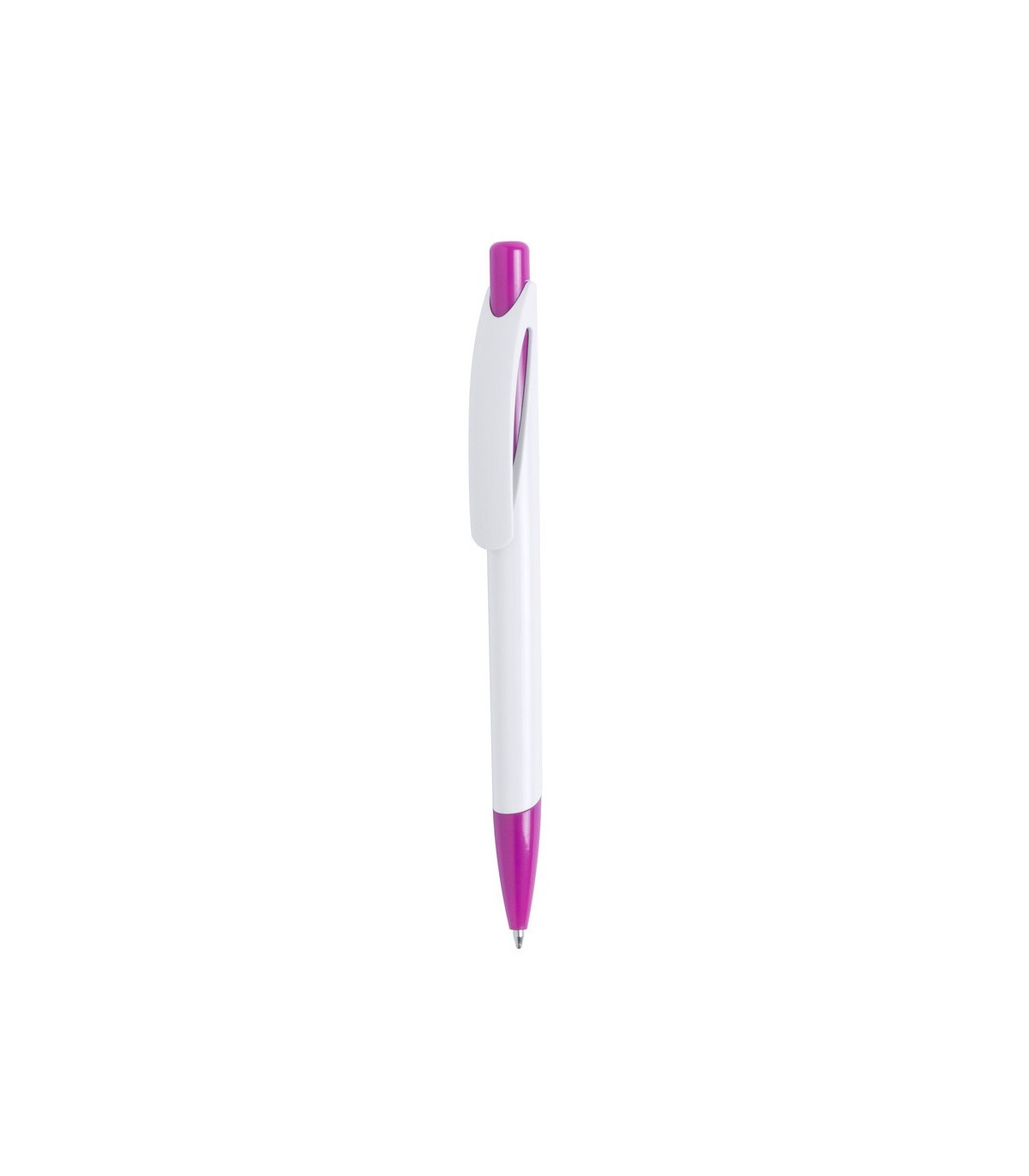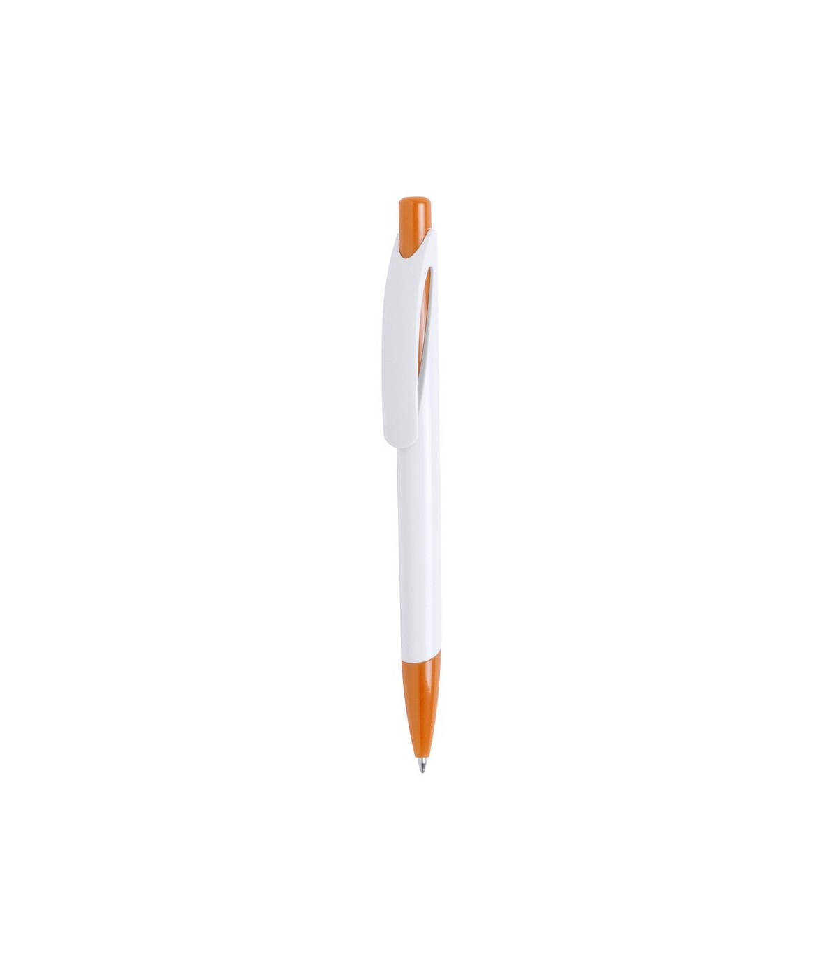 Bolígrafo de apertura con mecanismo pulsador y atrevido diseño bicolor con accesorios en llamativos colores sólidos y cuerpo de suave acabado en color blanco sólido. Con original clip curvado a y punta a juego. Escritura en tinta de color azul.