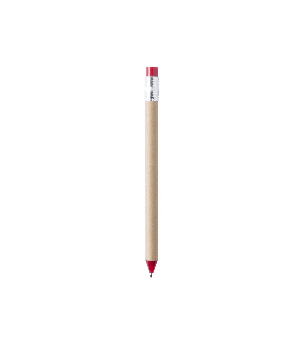 Original bolígrafo de apertura con mecanismo pulsador con diseño de lápiz. Combinación de cuerpo en cartón reciclado de color natural y accesorios en llamativos colores. Escritura en tinta de color azul.