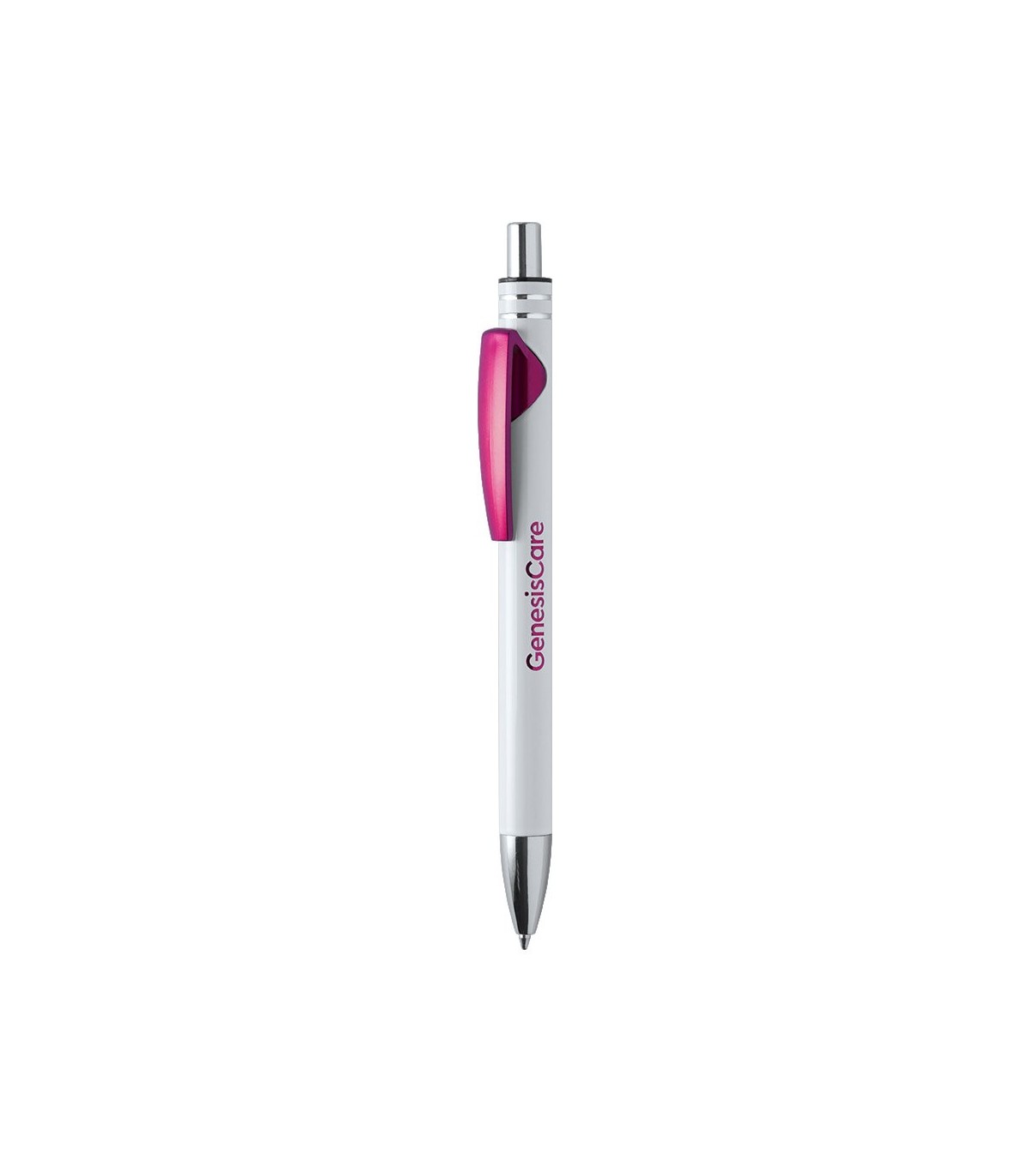 Bolígrafo de apertura con mecanismo pulsador con cuerpo de aluminio, acabado sólido en color blanco y clip en diversa gama de colores metalizados de acabado brillante. Clip con amplia superficie de impresión. Especialmente diseñado para marcaje en láser y con un recubrimiento exterior especial para que tu publicidad quede perfectamente grabada, a juego con el color del clip. Escritura en tinta de color azul.