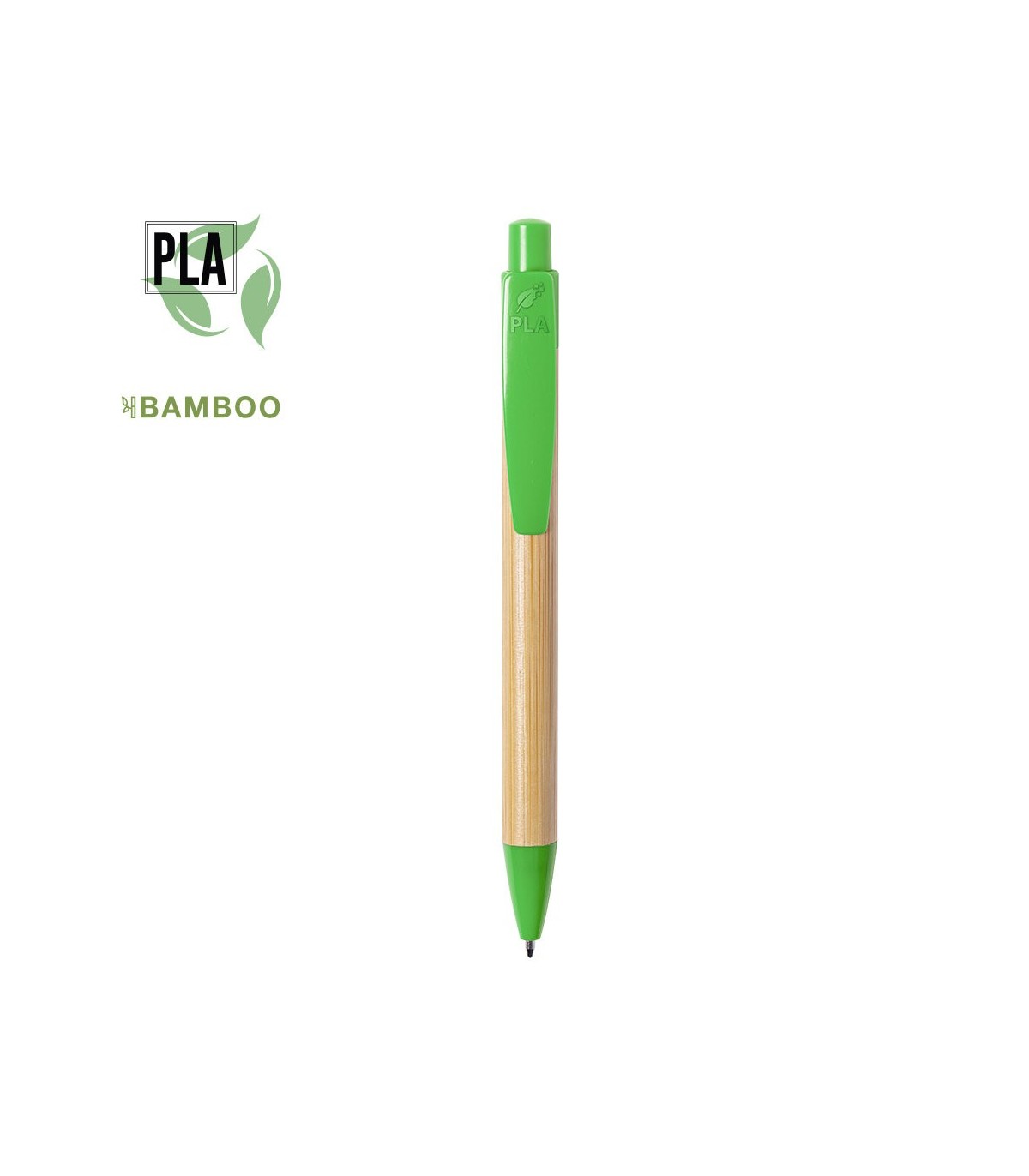 Bolígrafo de fabricación ecológica con mecanismo pulsador. Combinación de cuerpo en bambú brillo y accesorios en PLA -Ácido PoliLáctico-, que se obtiene a partir de recursos 100% naturales como el almidón de maíz, la yuca o la caña de azúcar, pudiendo convertirse en 100% compostable al final de su ciclo de vida útil. Clip con amplia superficie de marcaje y disponible en diversa gama de colores, con tinta azul. Distintivo PLA en parte superior del clip.
