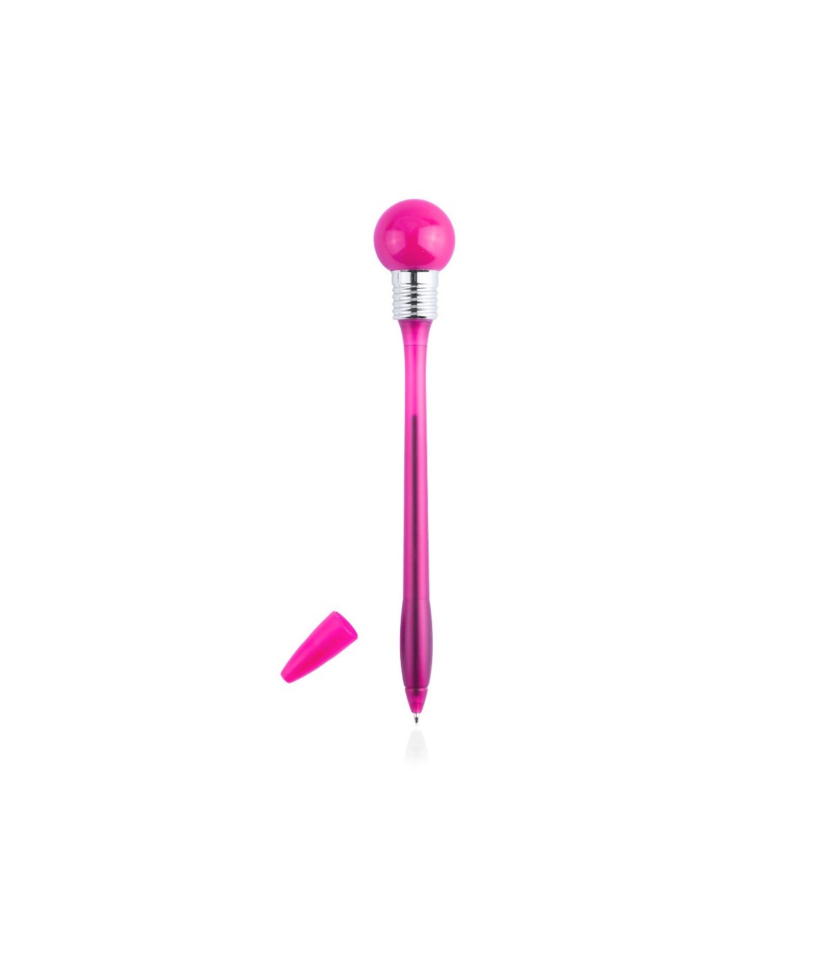 Divertido bolígrafo bombilla con cuerpo de suave acabado en llamativos colores transparentes. Con linterna esférica de goma con luz a juego que se activa dejando caer el bolígrafo en una superficie dura. Capucha a juego y en tinta azul.