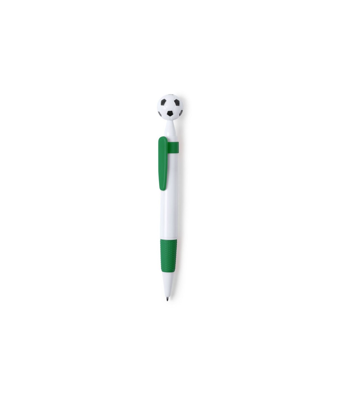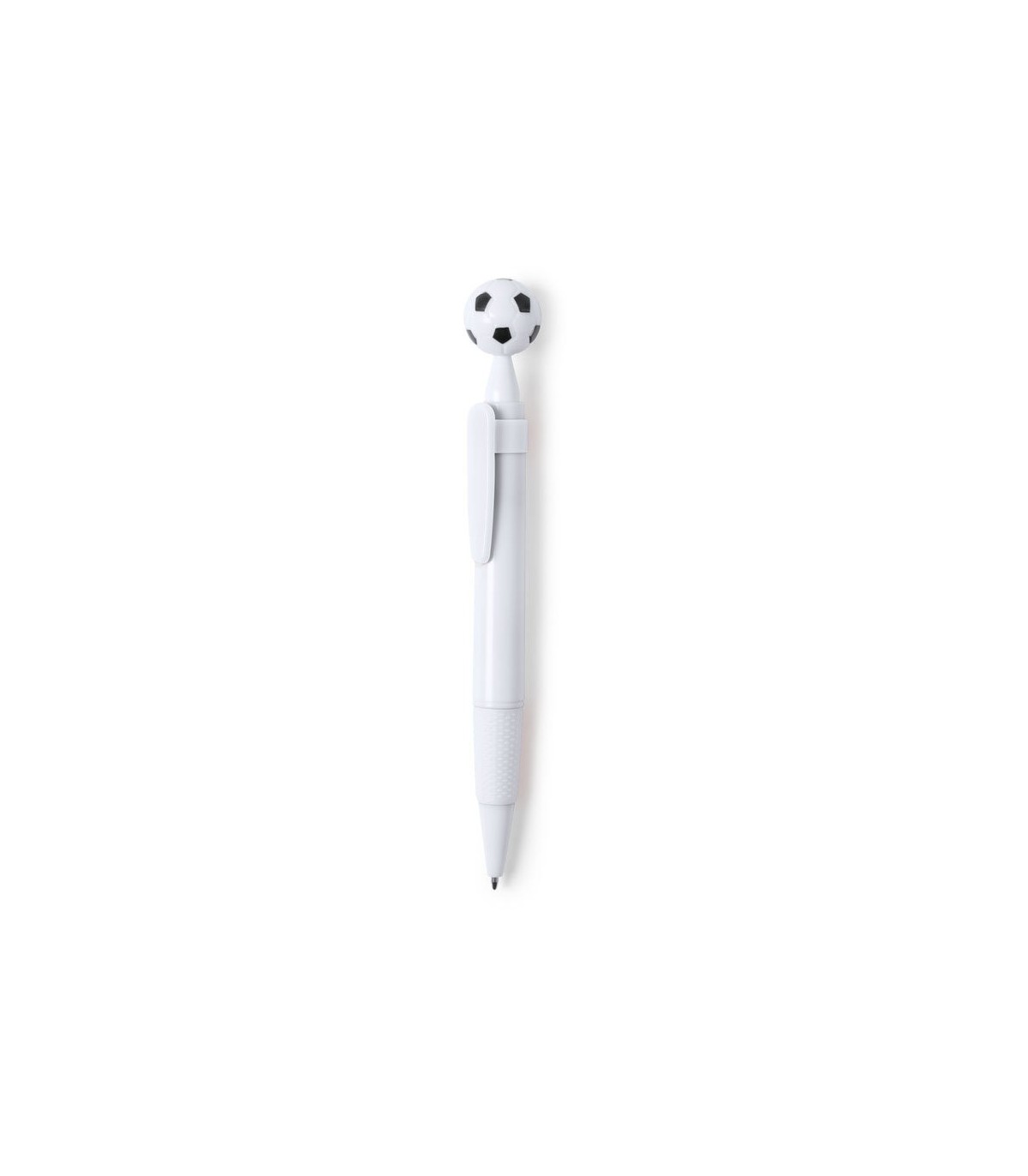 Bolígrafo con detalle en forma de balón. De mecanismo pulsador y en diseño bicolor. Con cuerpo en color blanco, con clip y empuñadura a juego, en variada gama de colores.