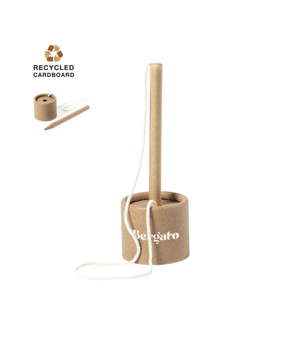 Bolígrafo con soporte de fabricación ecológica. Hecho en cartón reciclado, con cuerda de sujeción y base con adhesivo 3M, de fijación extra fuerte y libre de residuos al despegarlo. En tinta azul.