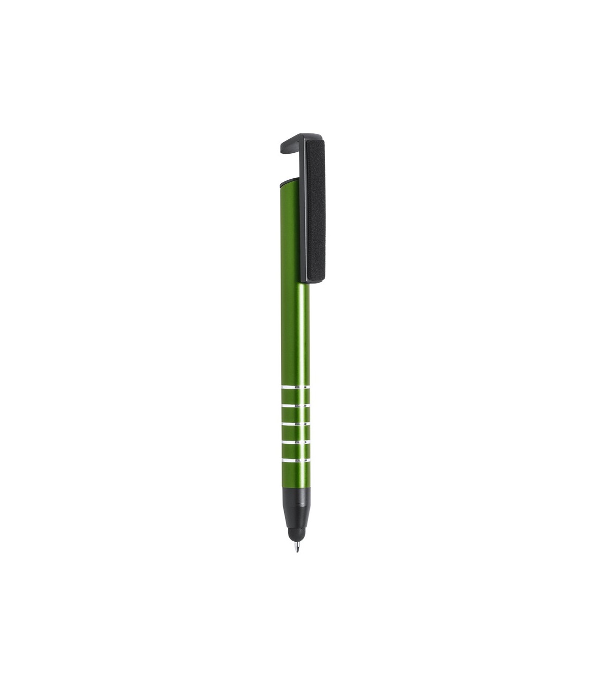 Bolígrafo con soporte para dispositivo móvil y limpiador de pantalla integrado en clip. De apertura mediante pulsación y cuerpo de suave aluminio con tacto especial en llamativos colores metalizados. Escritura en tinta de color azul.