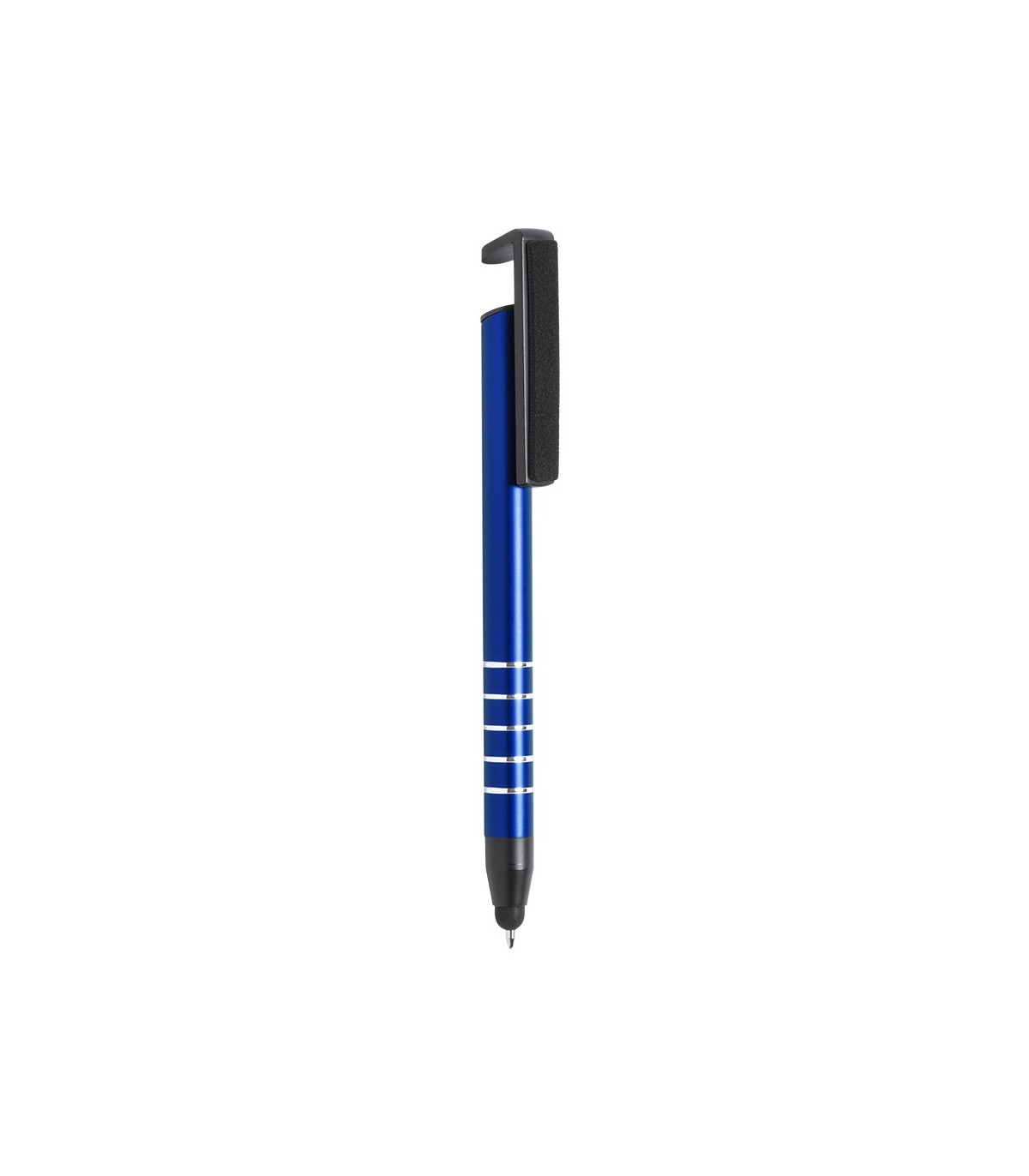 Bolígrafos con limpia pantallas y soporte para dispositivo móvil la integrado en clip. Con cuerpo en aluminio con tacto suave y colores metalizados. Tinta azul.