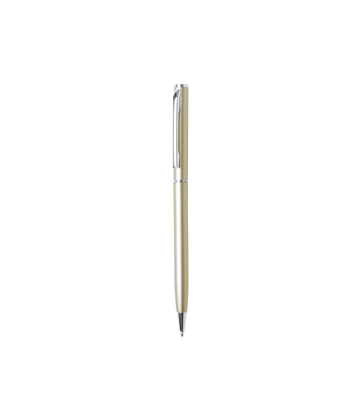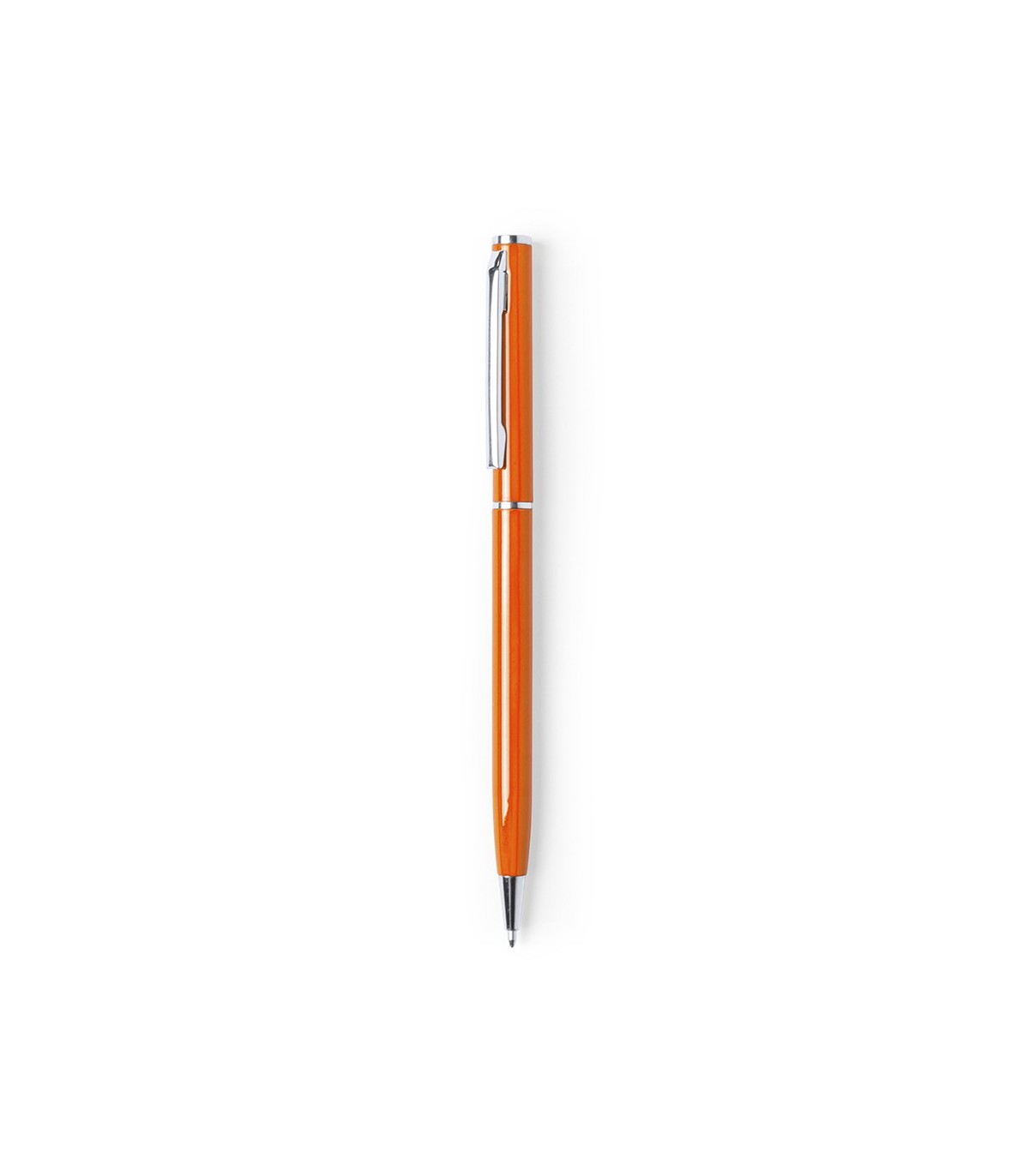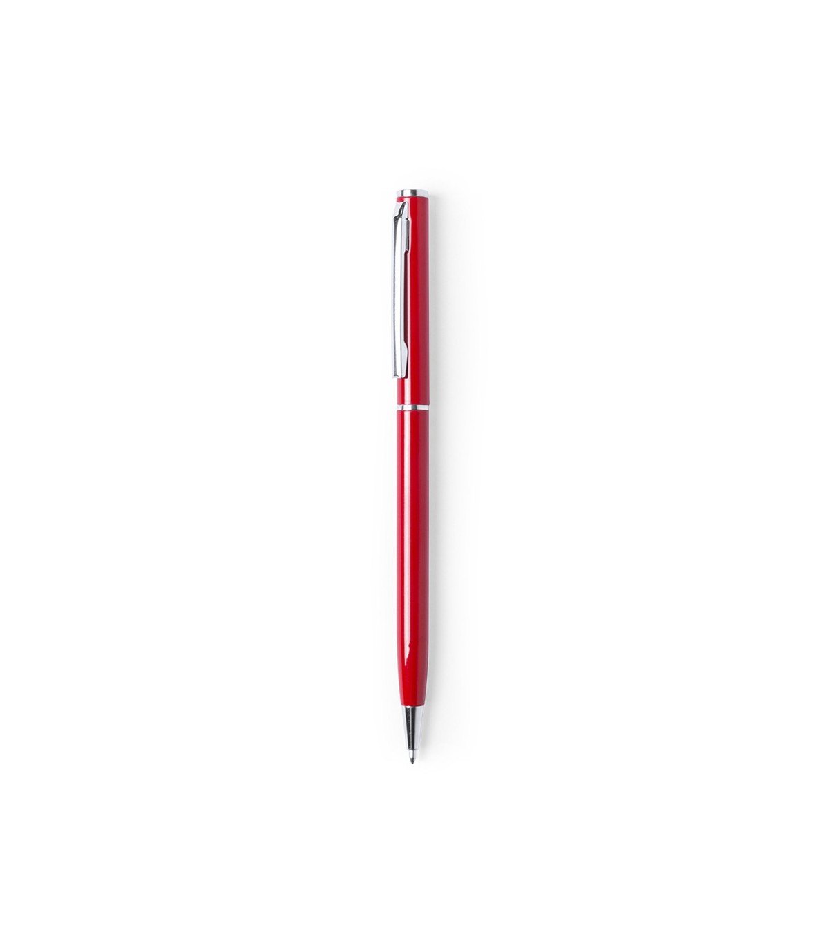 Bolígrafo fabricado en aluminio, de acabado brillo y mecanismo giratorio, con accesorios y anillas en cromado. Disponible en extensa gama de colores, con tinta azul.