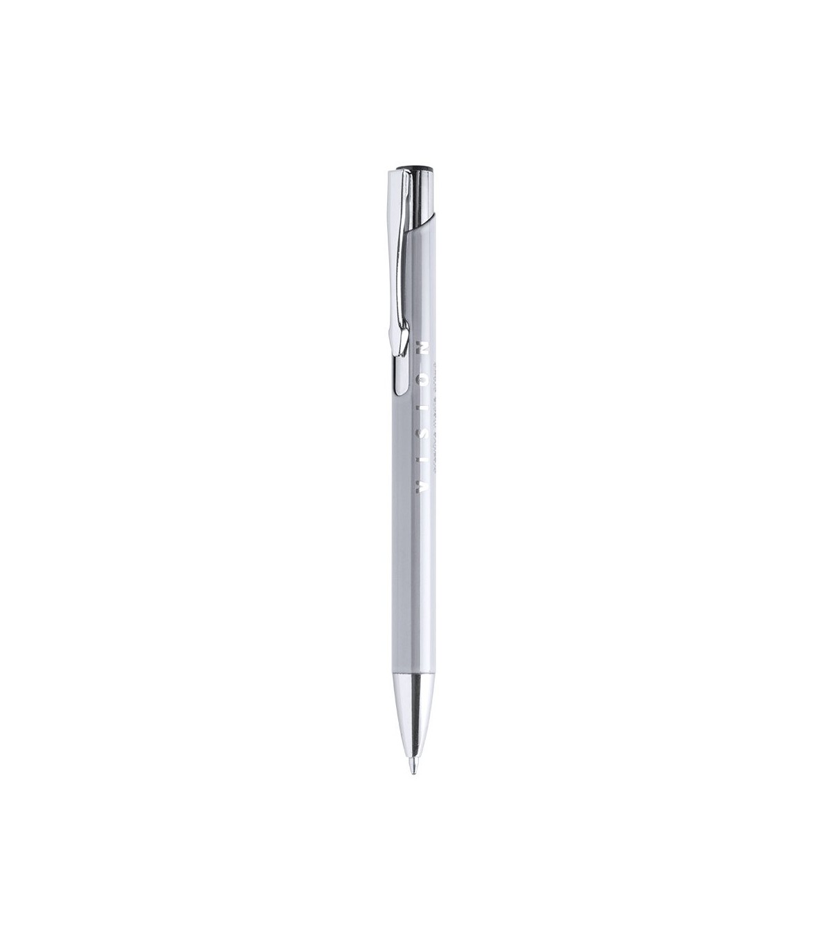 Bolígrafos de aluminio con mecanismo pulsador y cuerpo troquelado con accesorios plateados, personalizados con tu logo en láser para regalos promoconales de empresa.