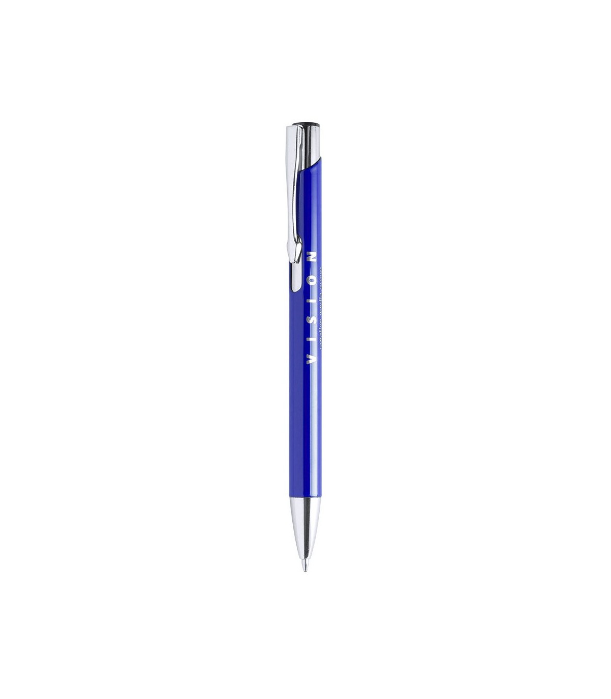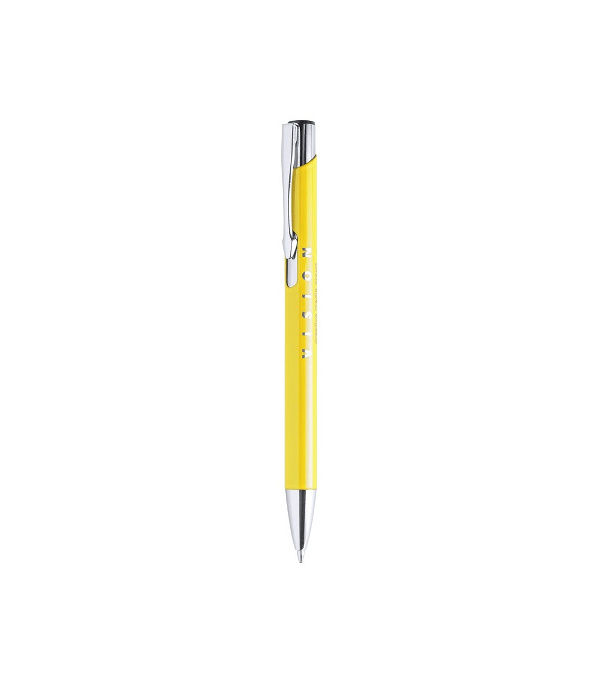 Desenfadado bolígrafo de aluminio con mecanismo pulsador en diversa gama de llamativos colores. Accesorios en color plateado brillante y original cuerpo troquelado. Especialmente diseñado para marcaje en láser y con un recubrimiento exterior especial para que tu publicidad quede perfectamente grabada en color plateado brillante, a juego con el resto de accesorios del bolígrafo. Cartucho jumbo y con escritura en tinta azul.