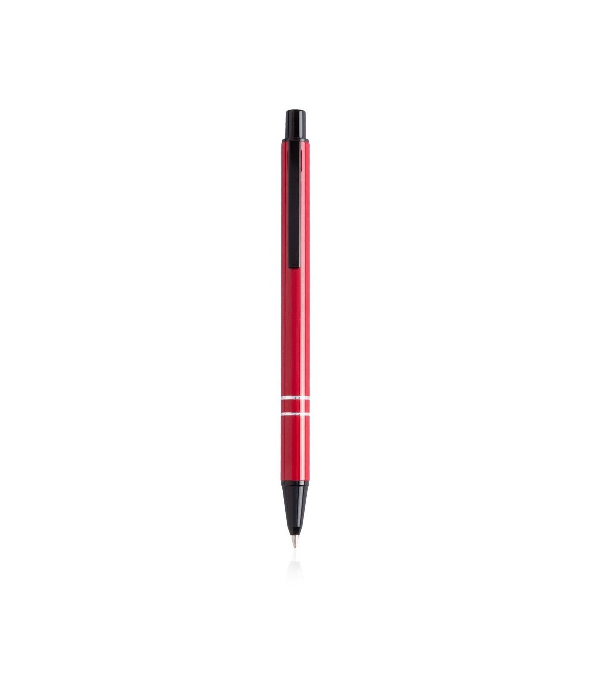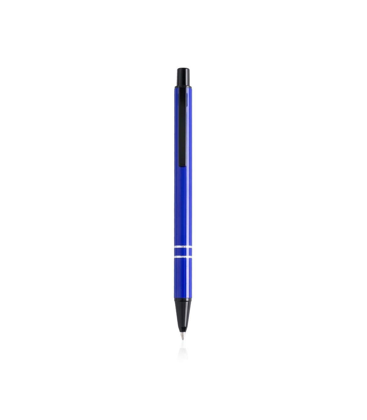 Bolígrafo de apertura con mecanismo pulsador en original diseño bicolor. Con cuerpo en aluminio de suave acabado en alegres colores. Accesorios en color negro y anillas en plateado. Escritura en tinta de color azul.