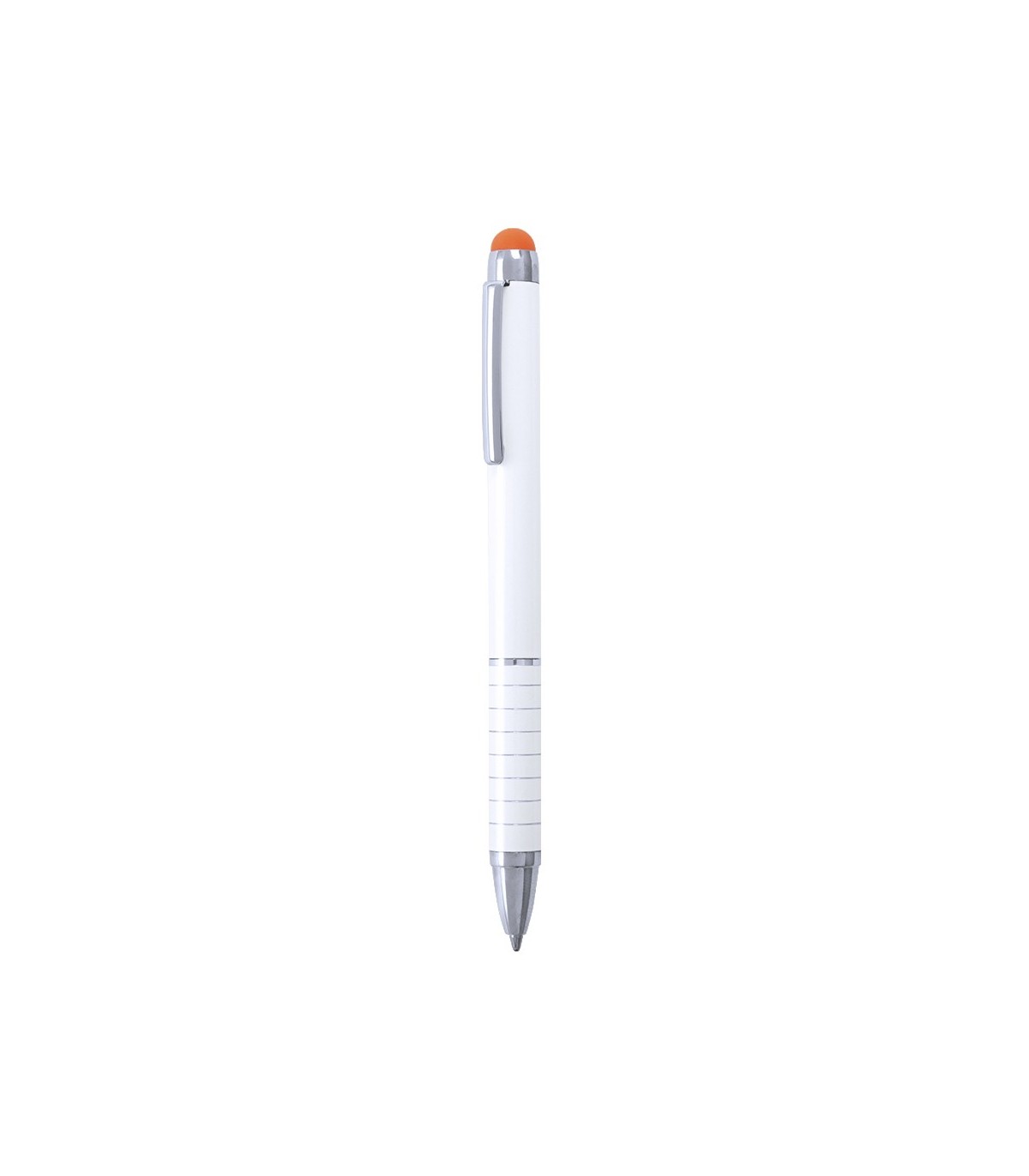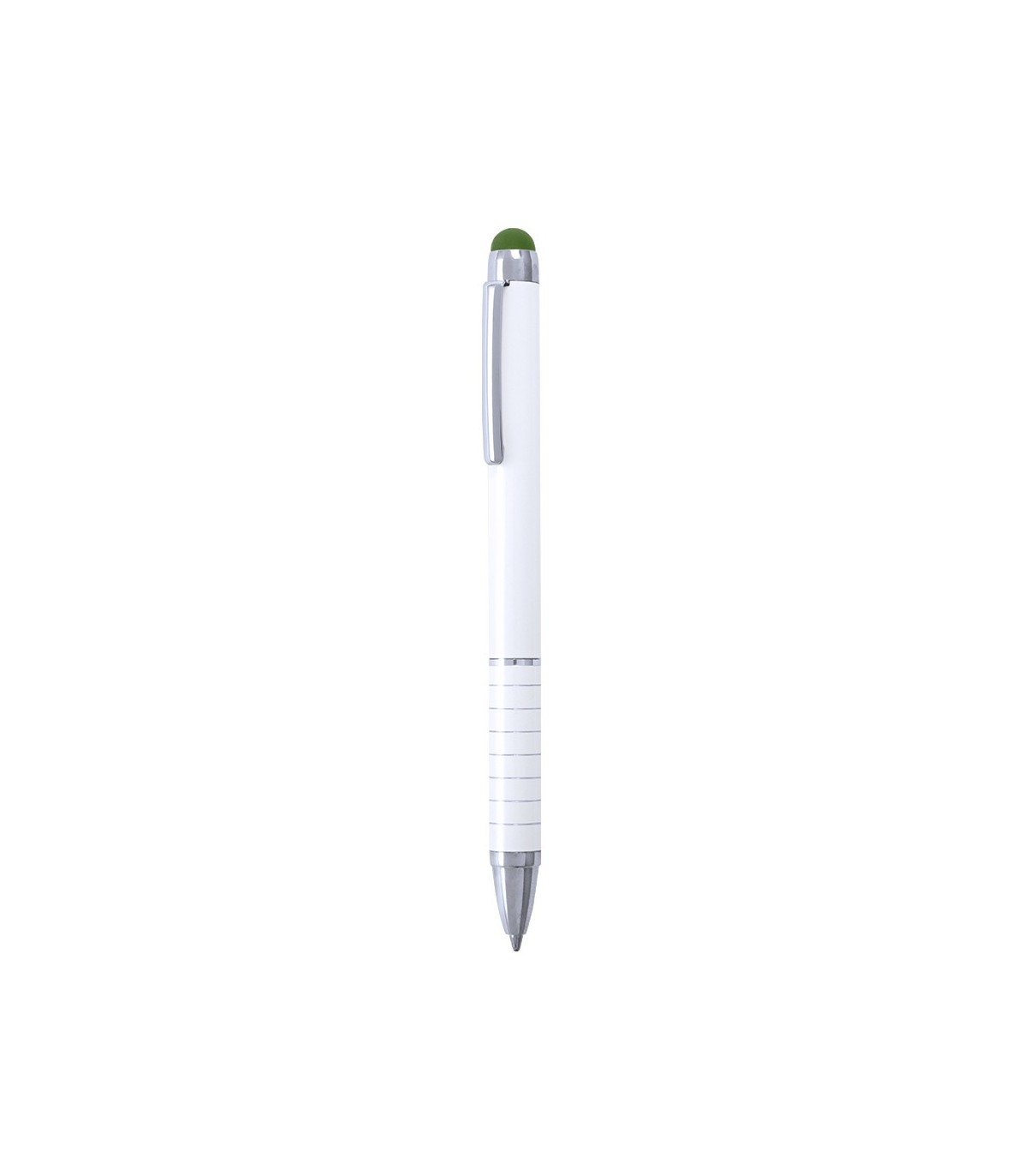 Bolígrafo puntero de apertura con sistema giratorio con cuerpo en aluminio de suave acabado metalizado en elegante color blanco. Accesorios y anillas en color plateado. Puntero en variados colores, original empuñadura anillada y con escritura en tinta azul.