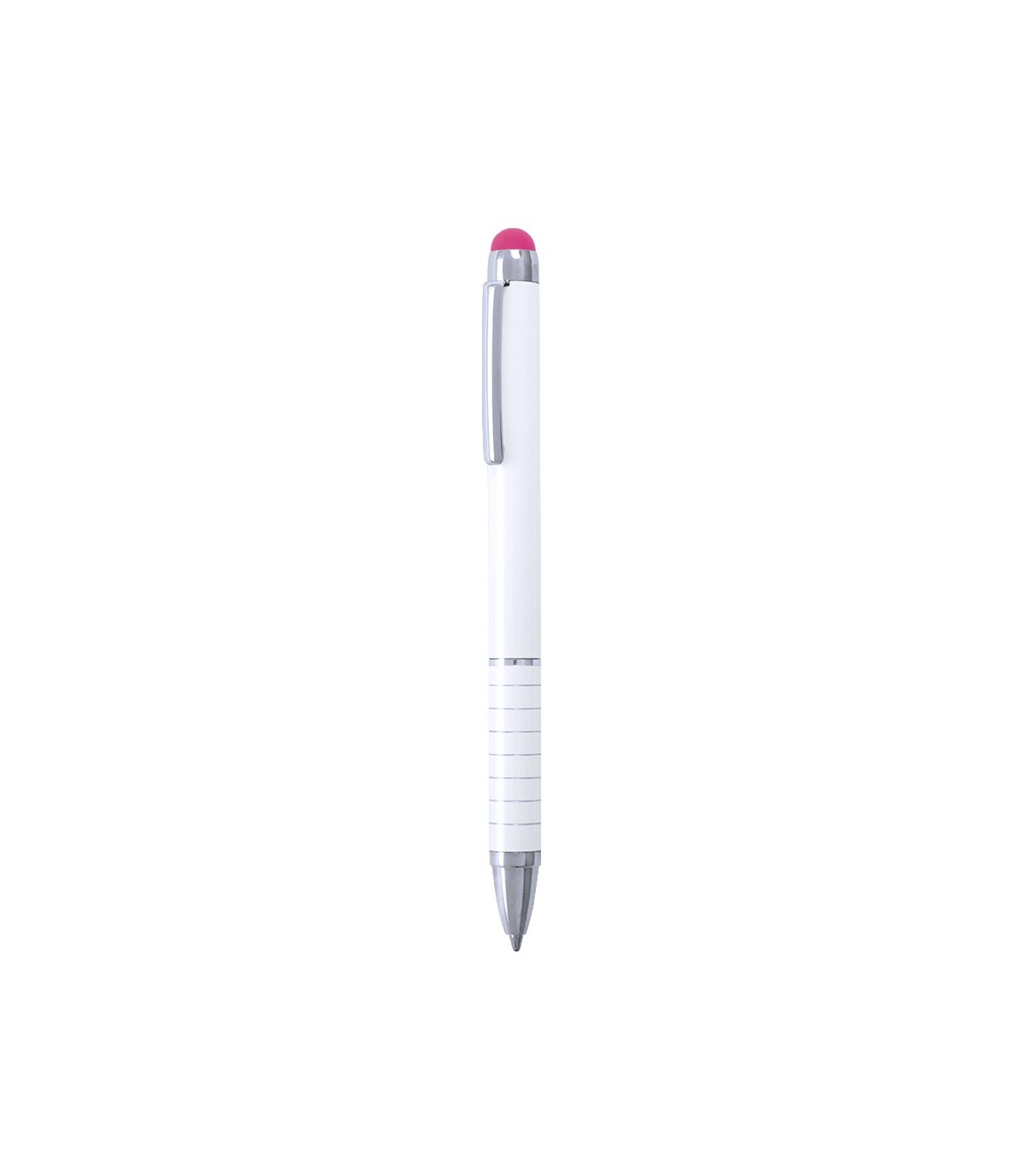 Bolígrafos con puntero de color blanco y colores en el cabezal, aluminio con detalles plata en la caña y punta, útiles. Bolígrafo Puntero Neyax.